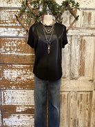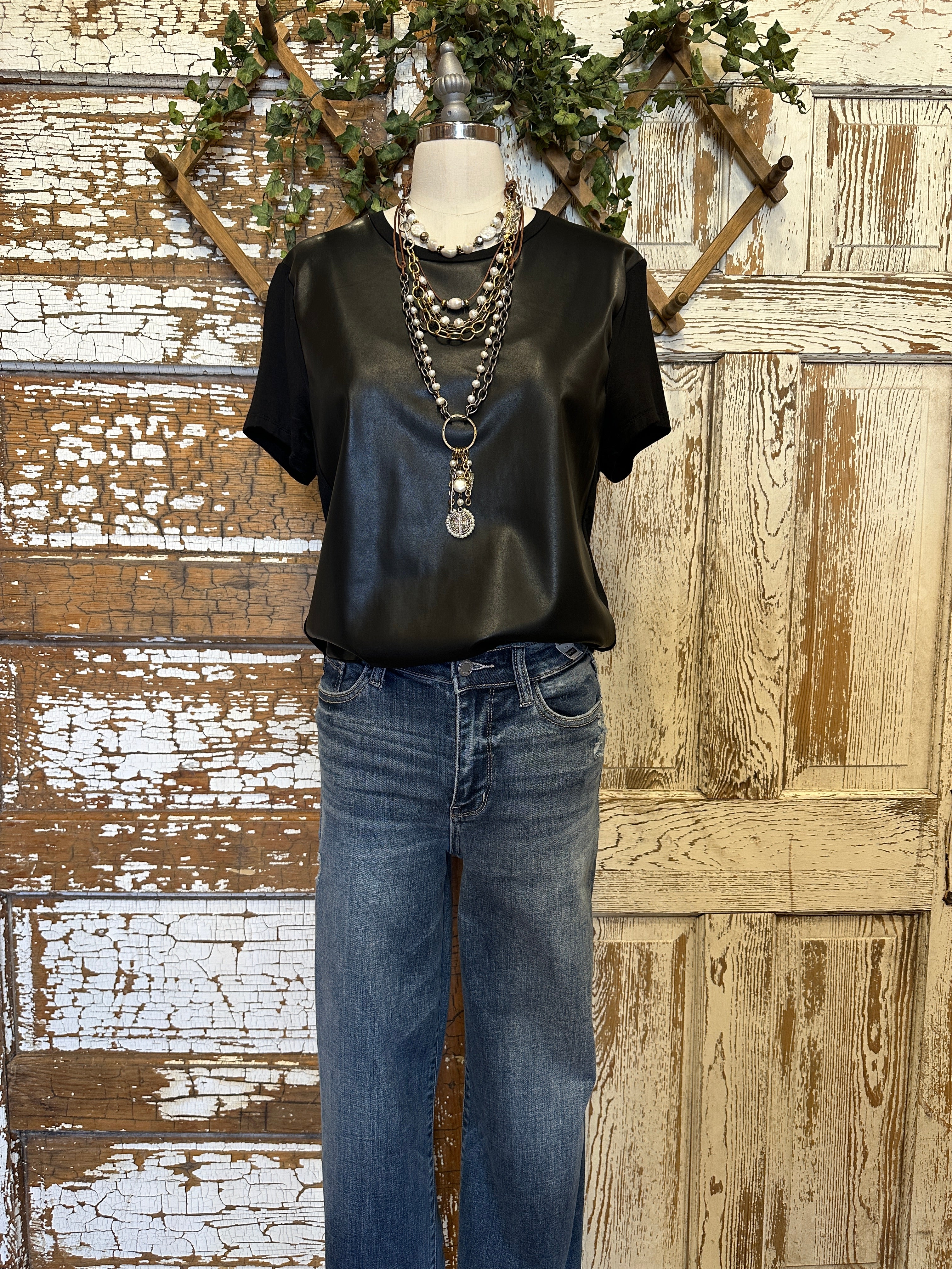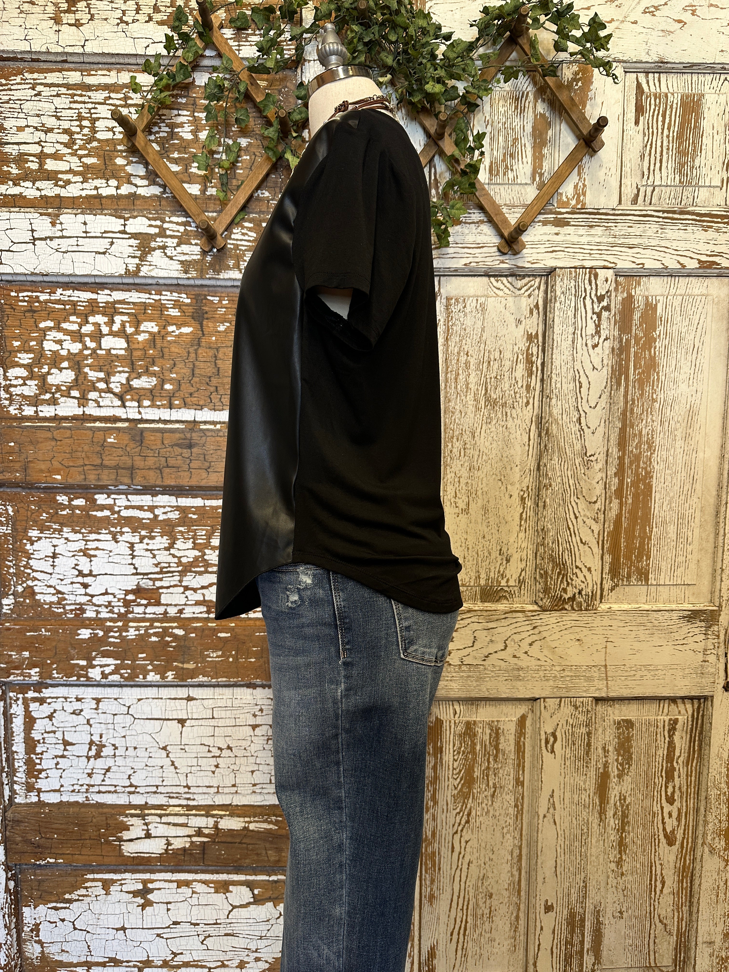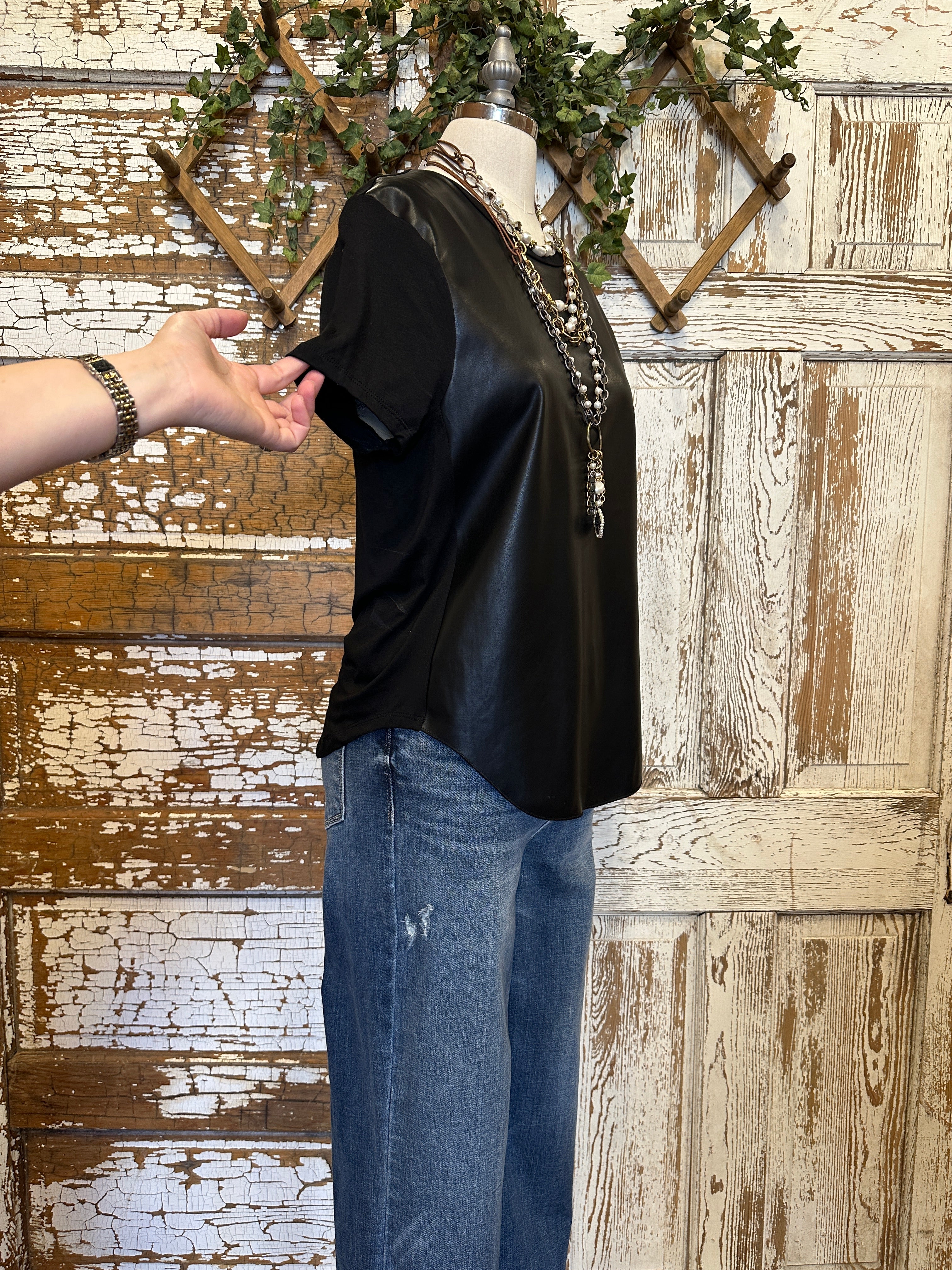 Black vegan mix media top with a crew neck finish, short sleeves front bodice in vegan leather. On trend leisure for any Occassion... Let's rock! Solid color pleather on standard fit.