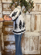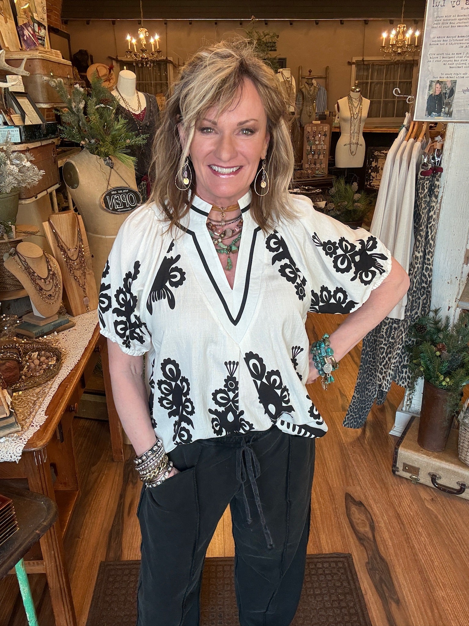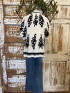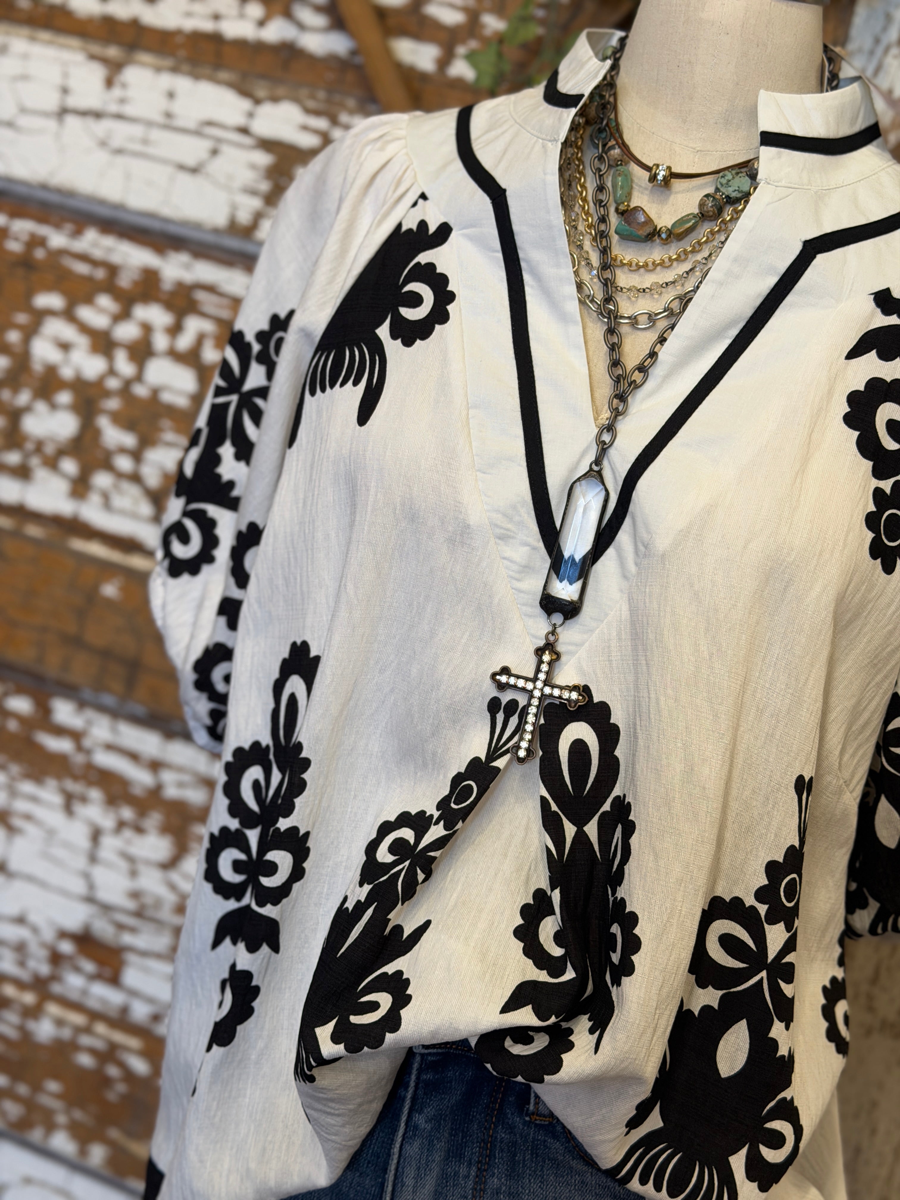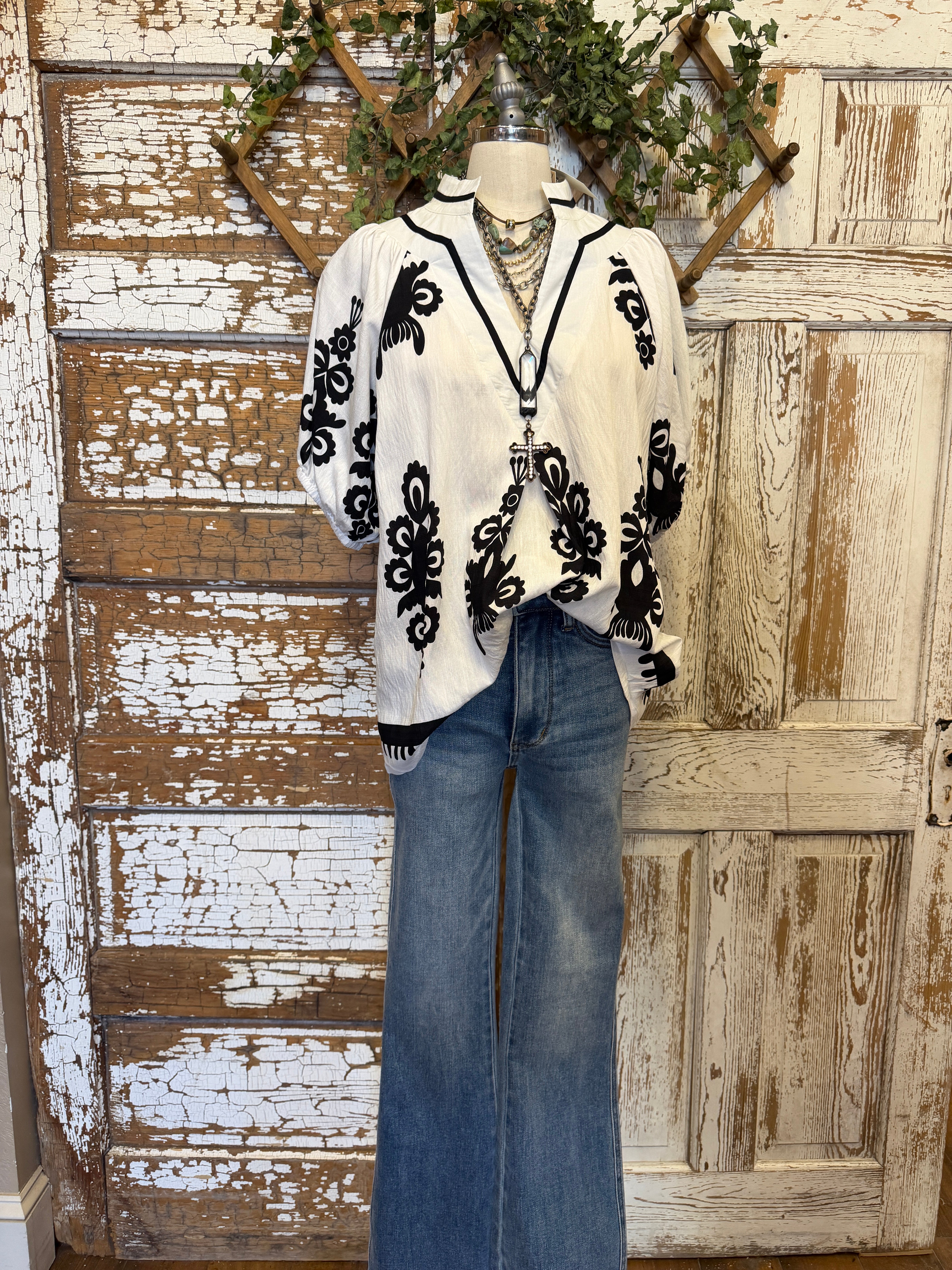 This striking black and white blouse brings bold contrast and artistic flair to your wardrobe. Designed with a relaxed silhouette and lightweight feel, it’s perfect for dressing up denim or pairing with tailored bottoms for a polished boutique look.