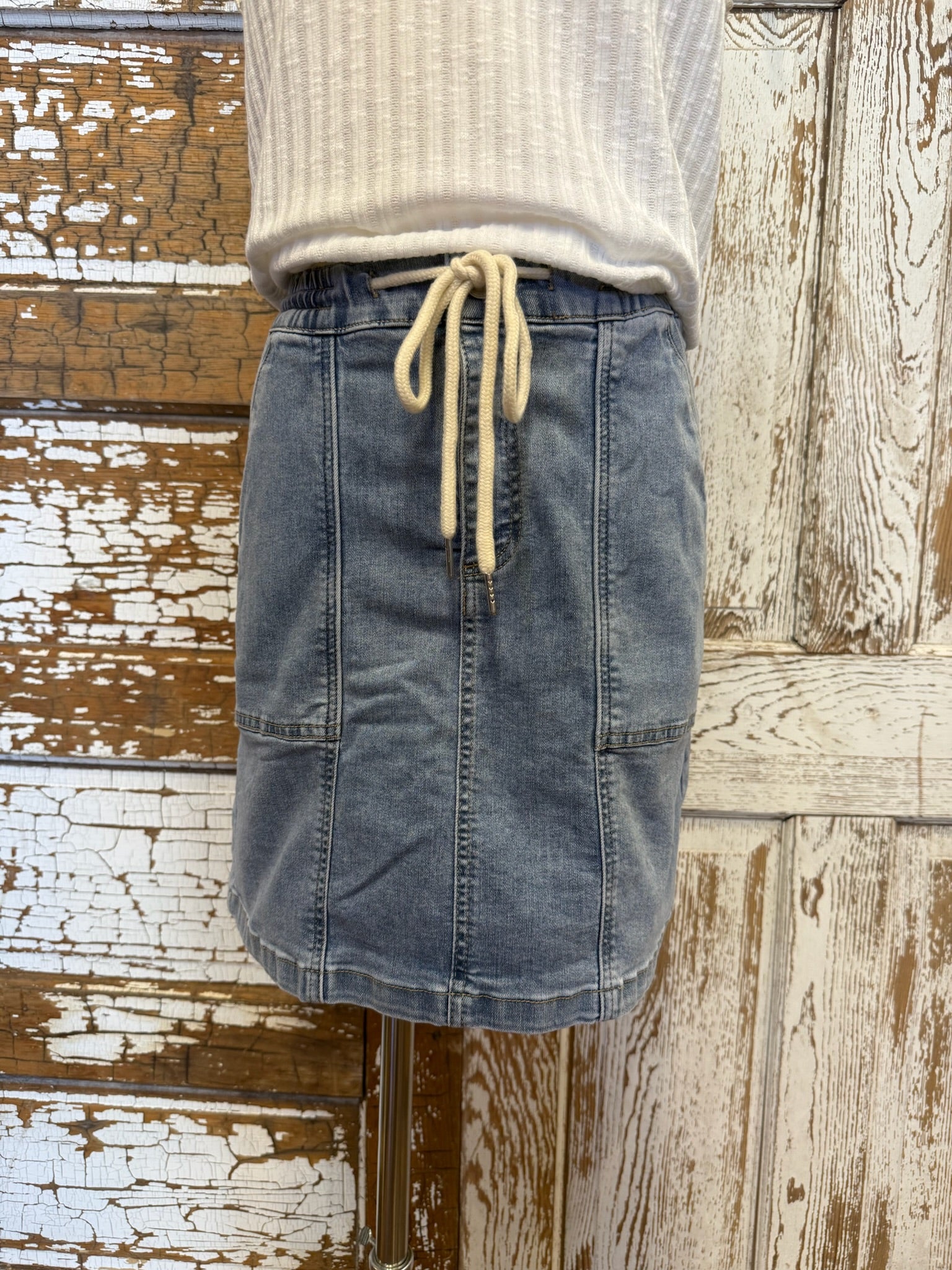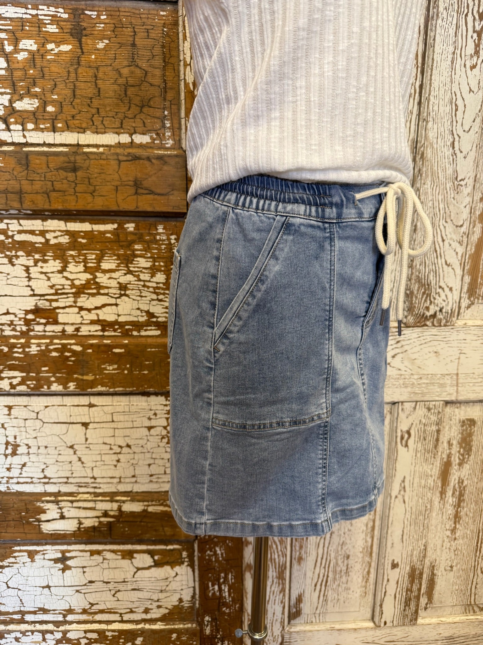 Discover the ultimate spring and summer essential with our versatile drawstring skort, crafted from stretch denim for the perfect balance of style and comfort. Designed for an active lifestyle, it offers a flattering fit with an adjustable waistband and practical patch pockets. From beach days to casual outings, this skort delivers a chic, effortless look.