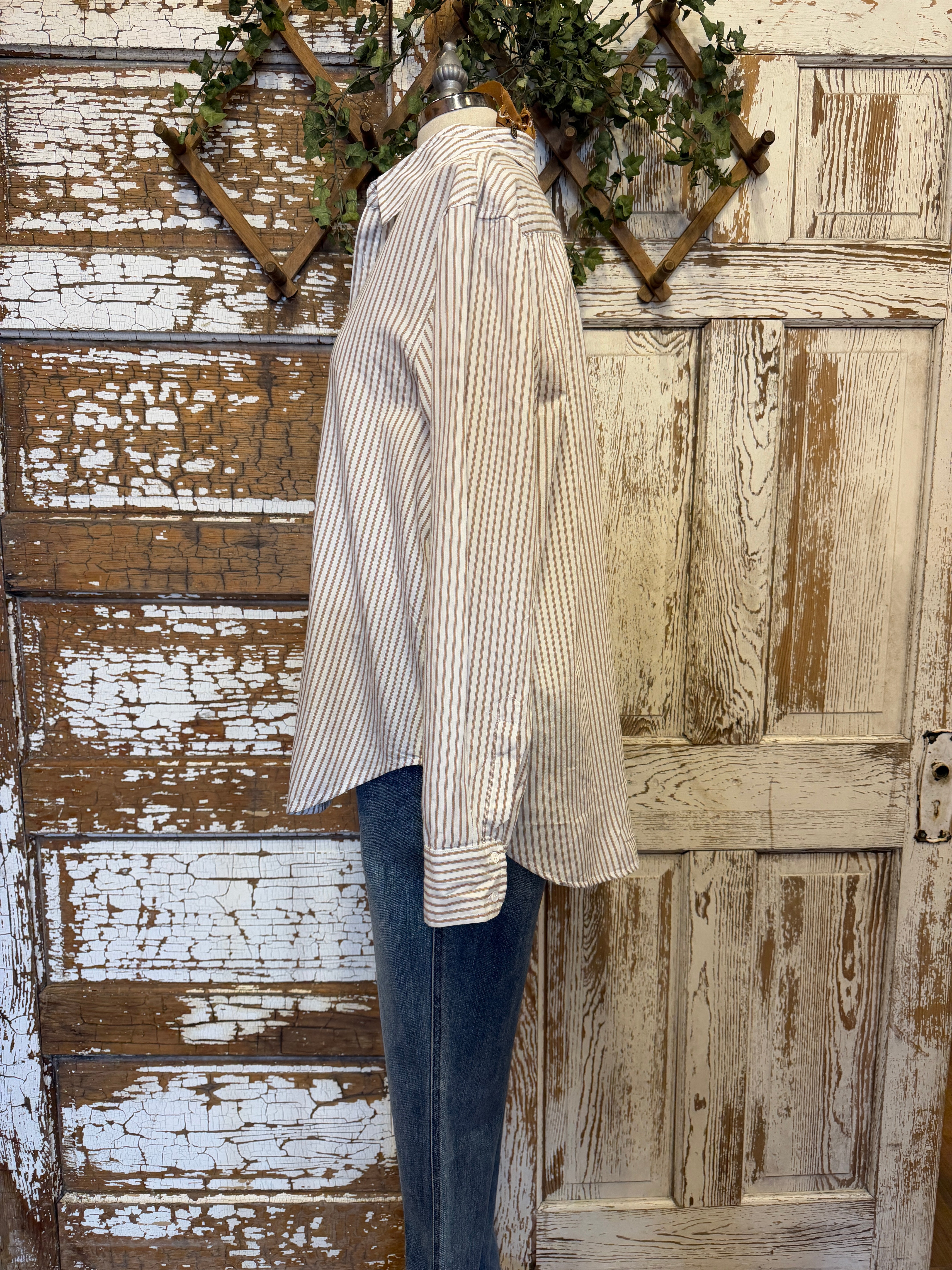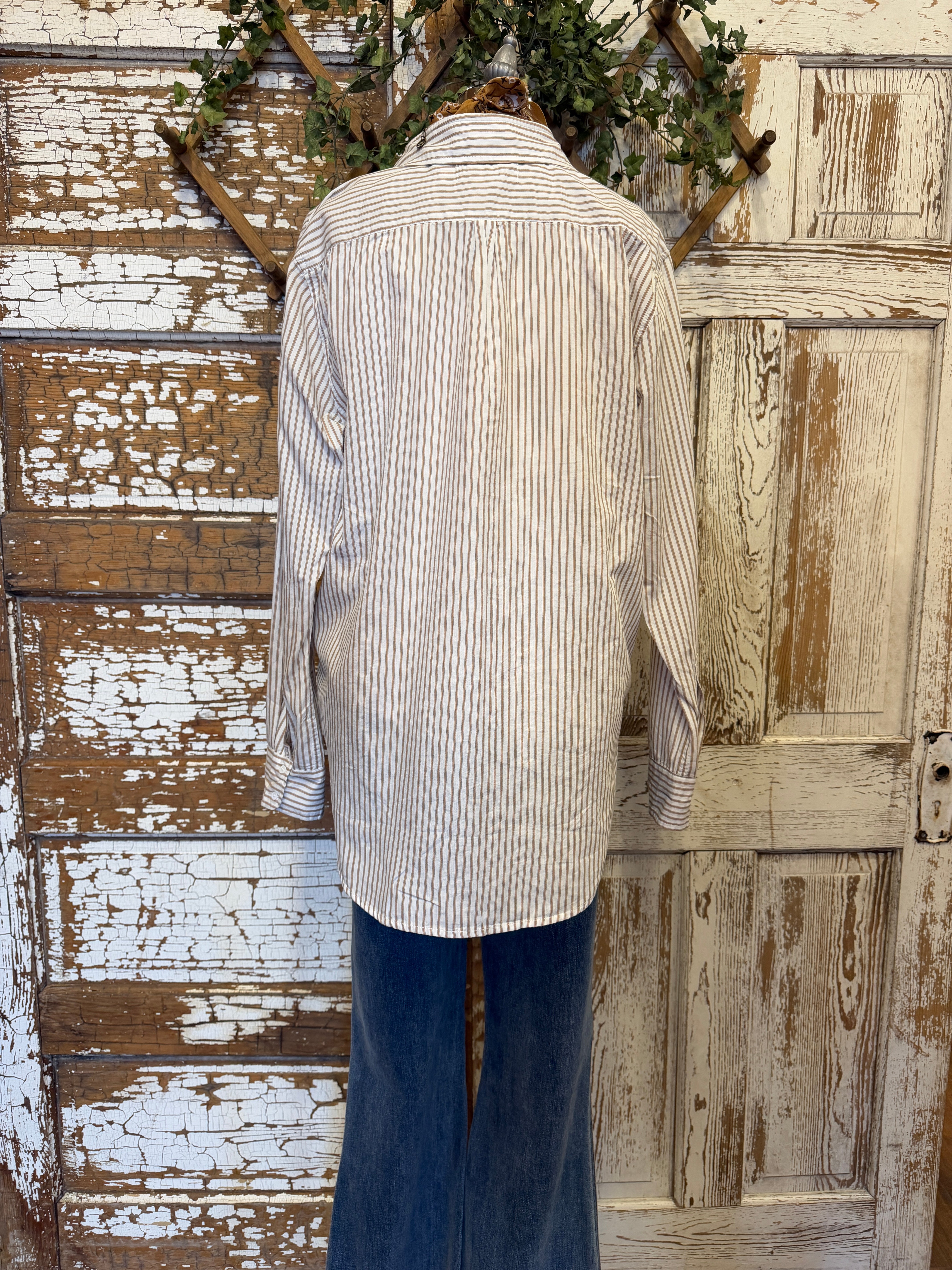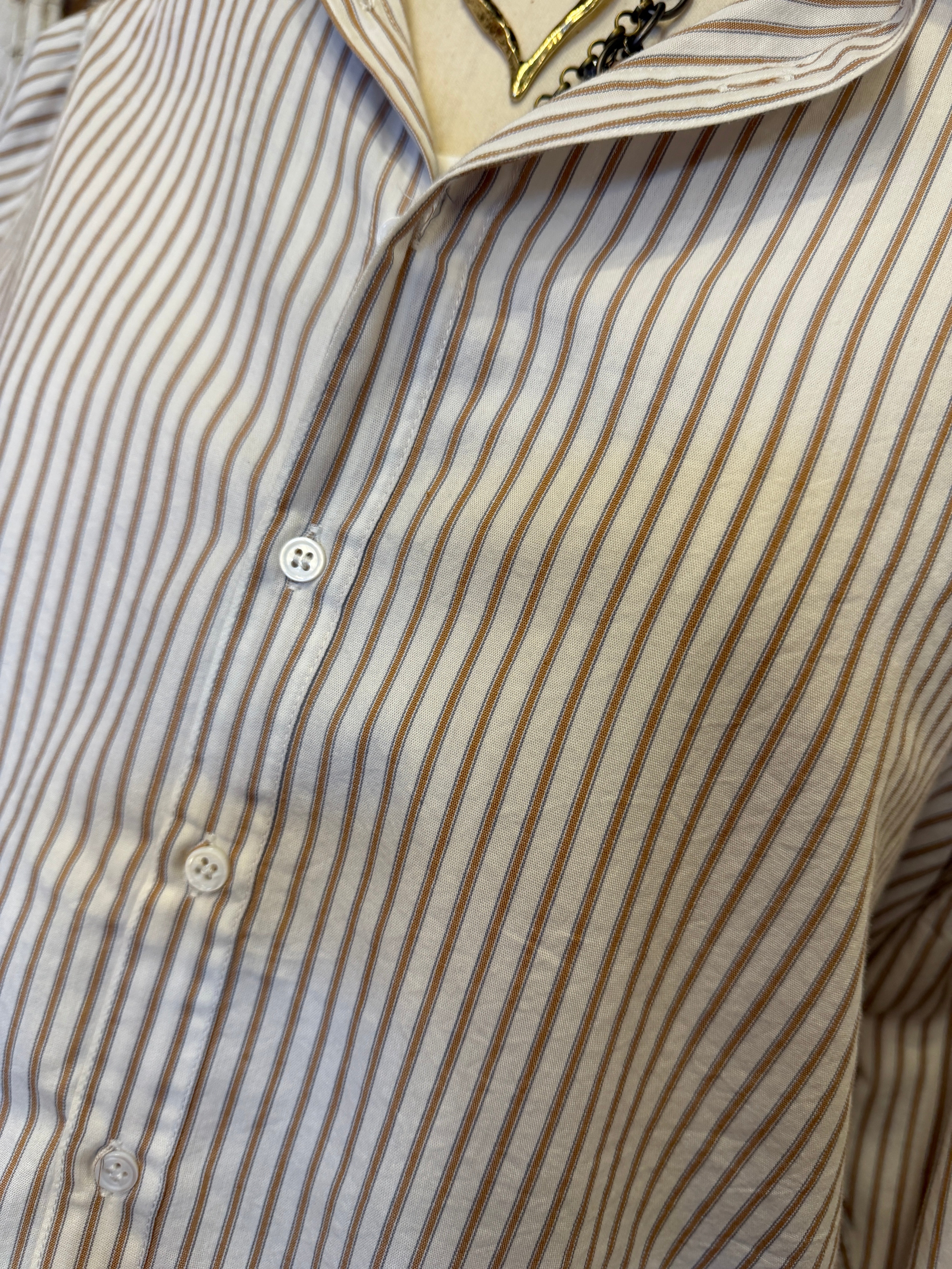 Embrace effortless style with the khaki striped shirt, a garment-dye poplin stripe masterpiece that seamlessly blends fashion with functionality.