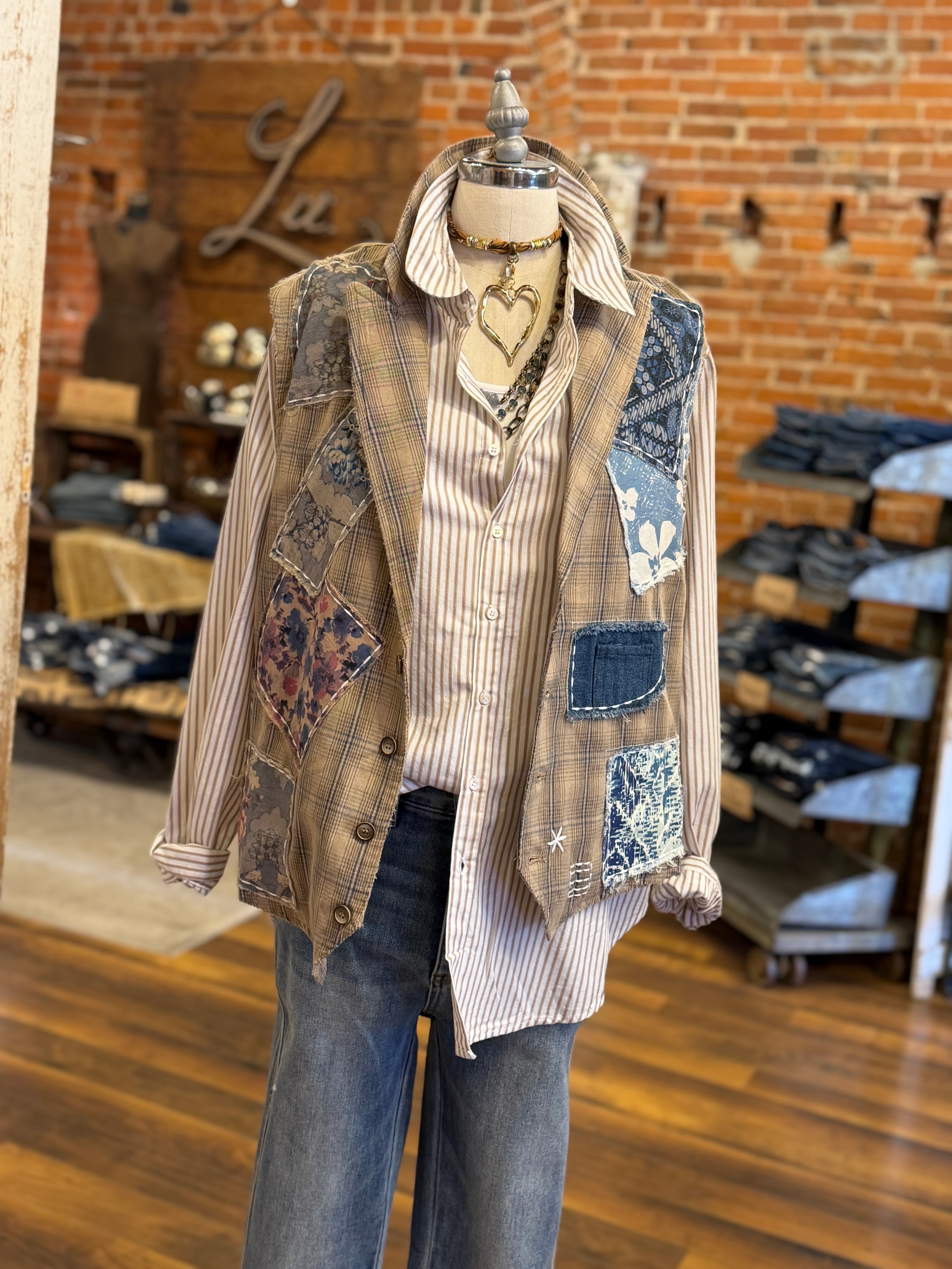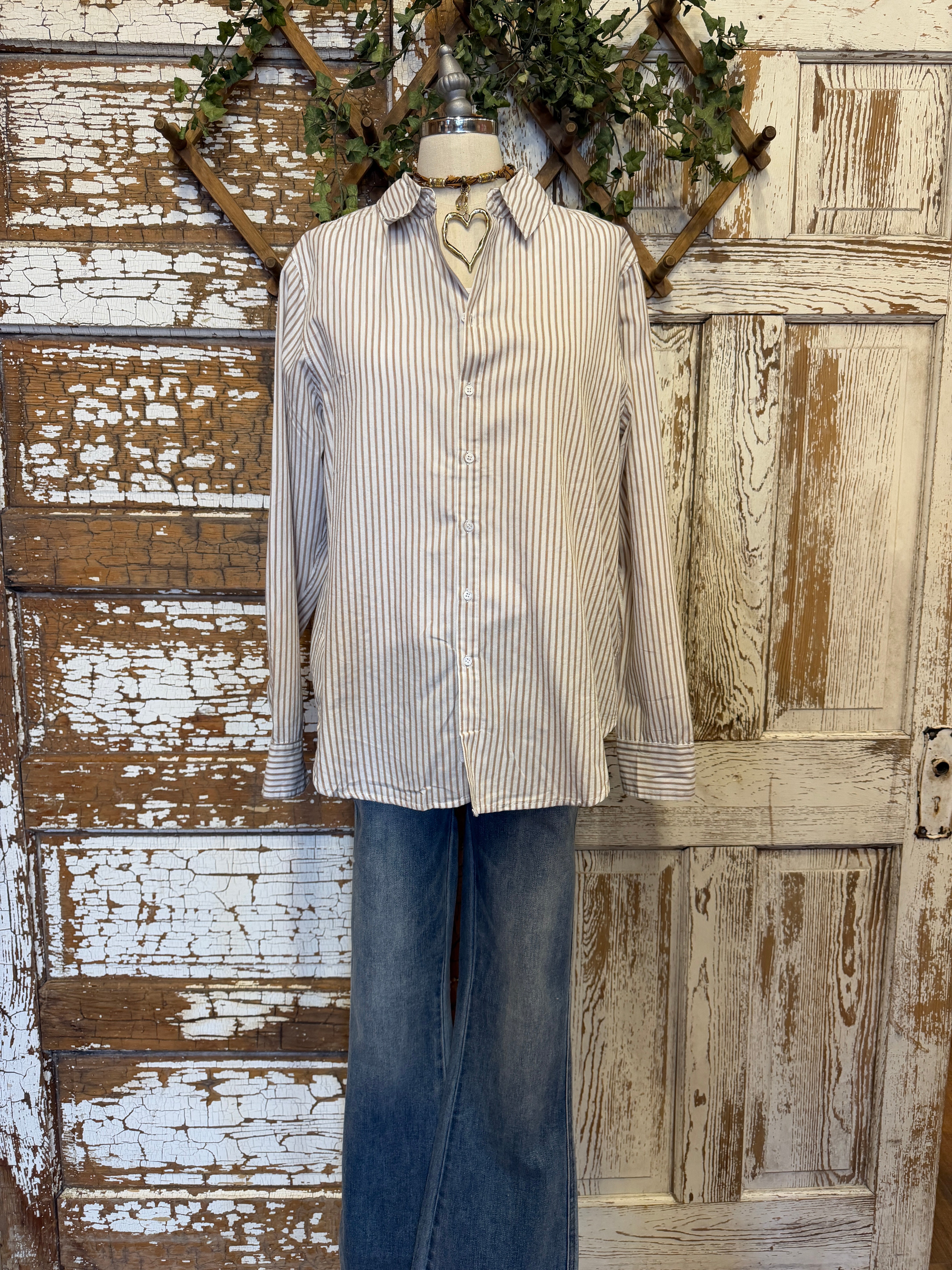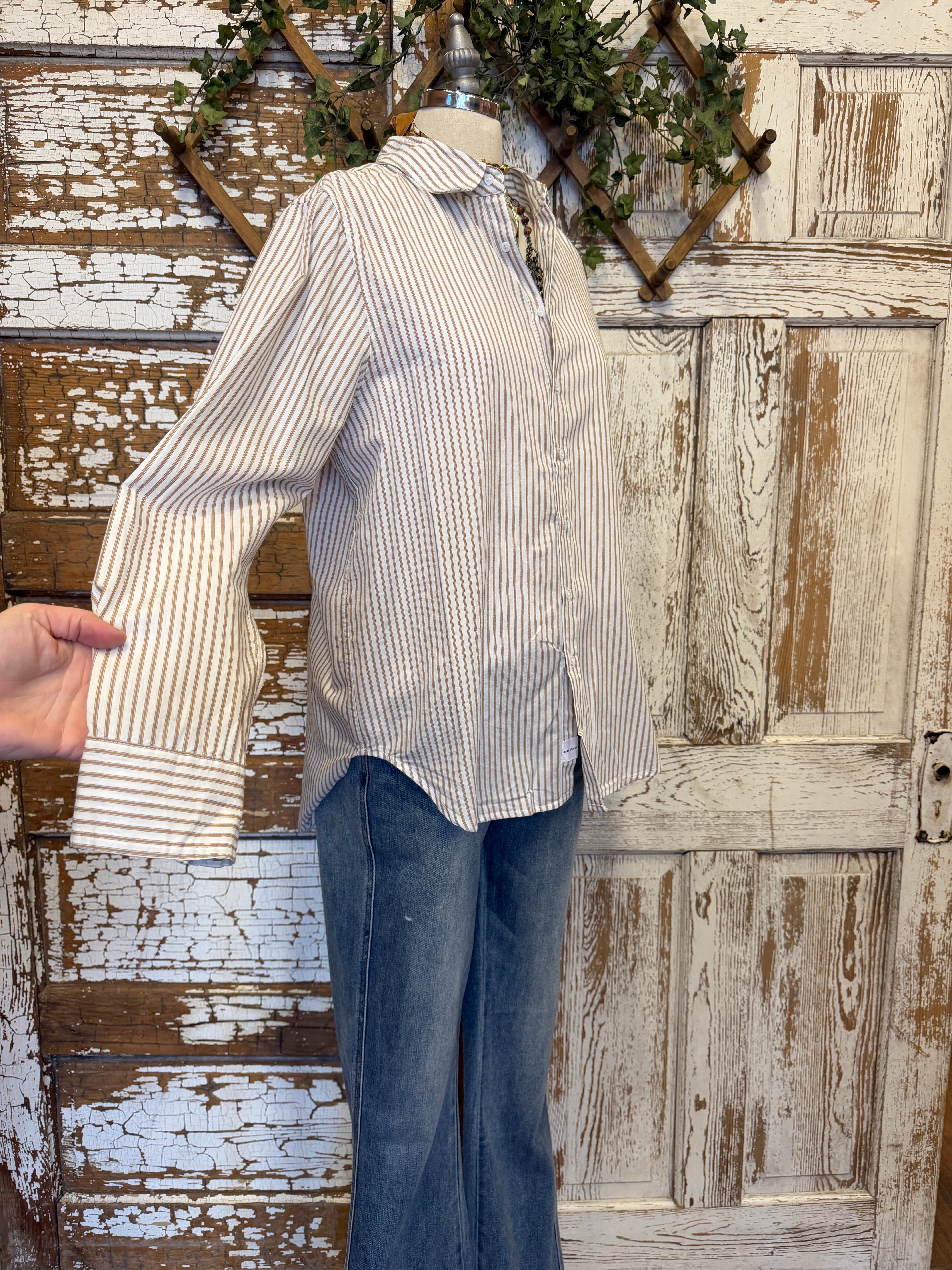 Embrace effortless style with the khaki striped shirt, a garment-dye poplin stripe masterpiece that seamlessly blends fashion with functionality.