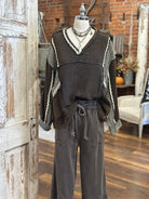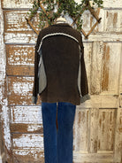 Embrace a unique blend of comfort and style with our Boho Chic Distressed Patchwork V-Neck Knit Top. This one-of-a-kind piece features an effortlessly relaxed fit, perfect for those who love to express their individual style through their wardrobe. It's an ideal choice for creating cozy, layered looks or as a stand-alone statement top for any casual outing. The rich brown waffle knit, combined with intriguing grey panels and delicate distressed white trim, offers a textured appeal that sets it apart.