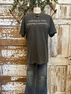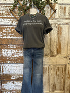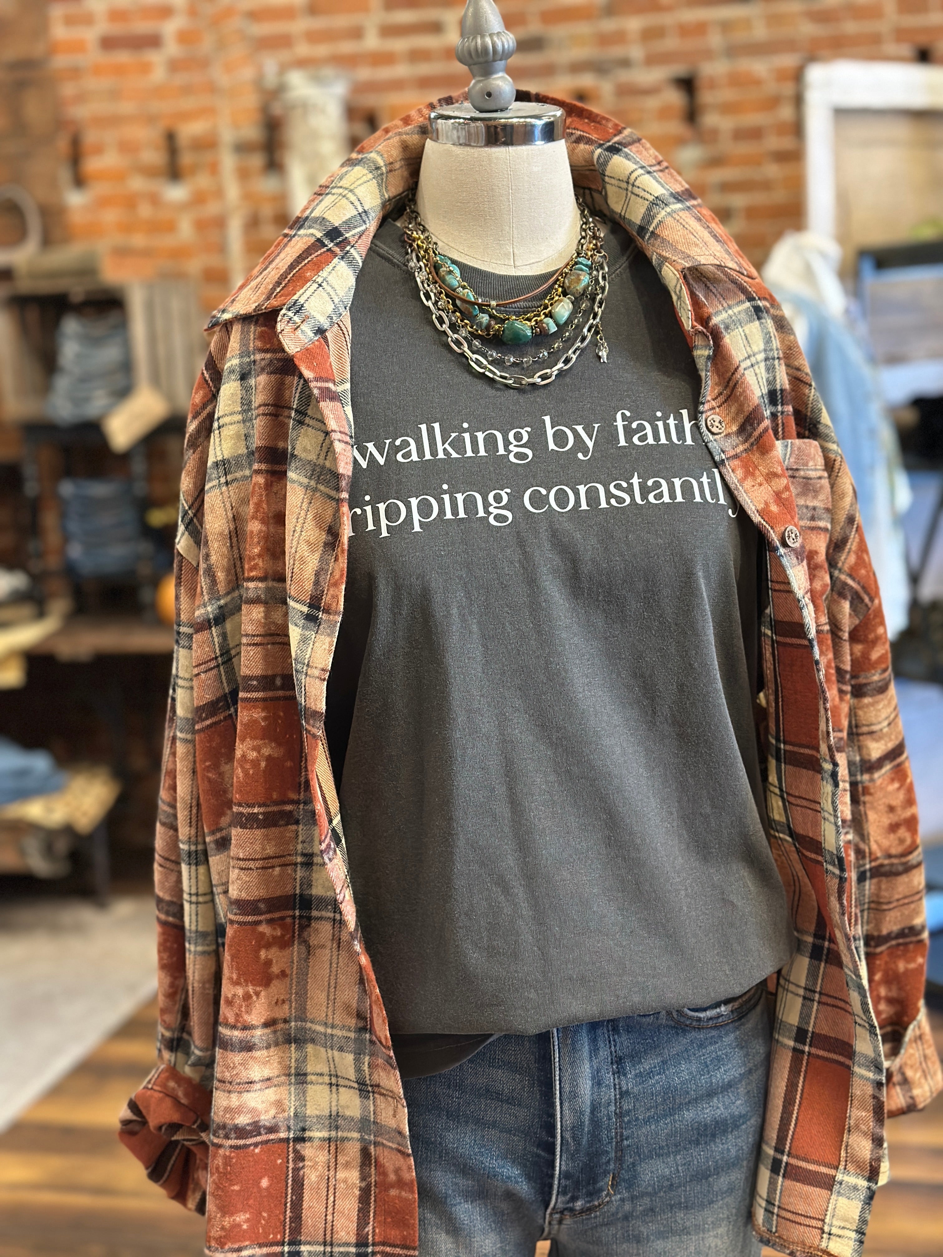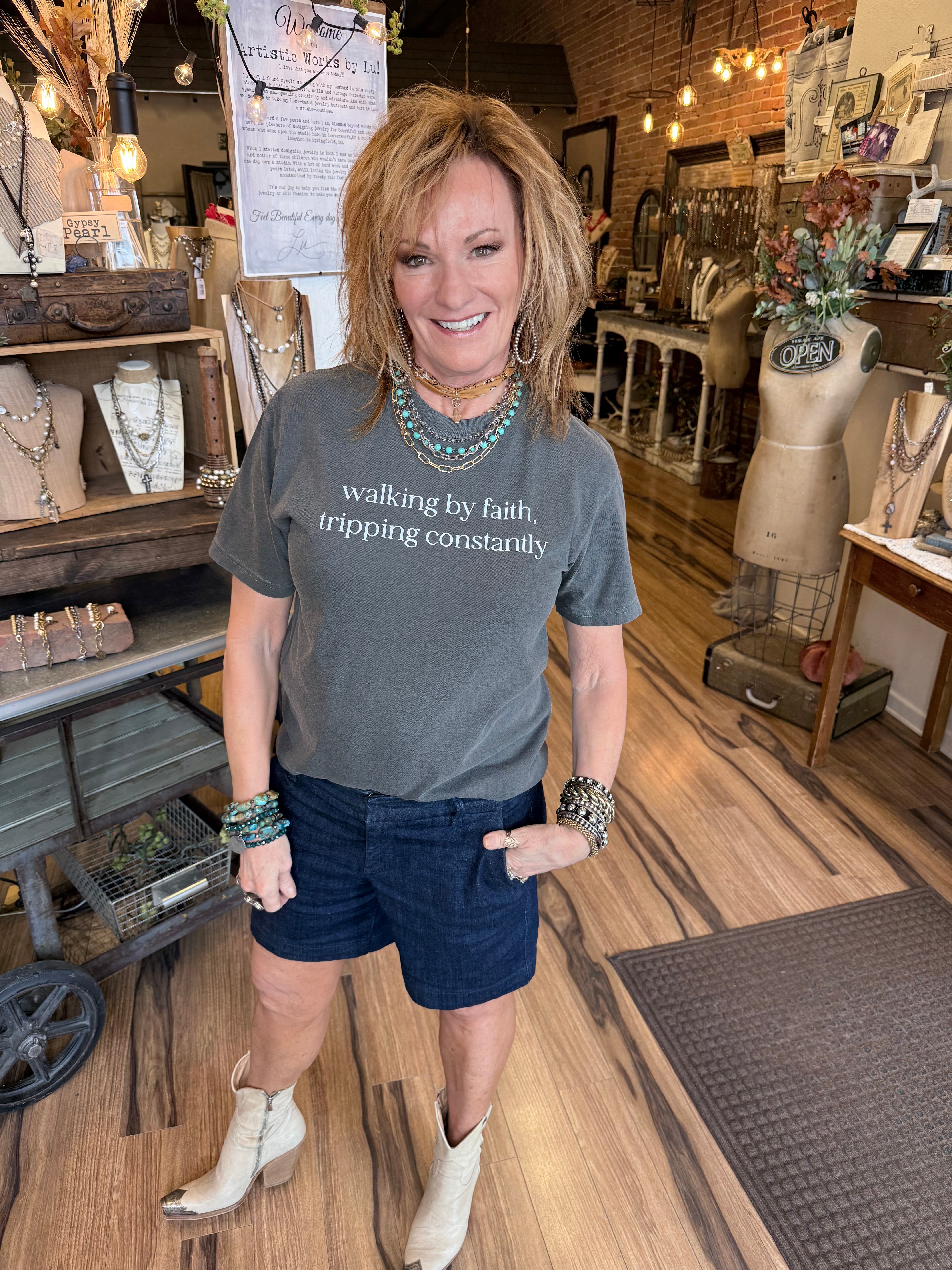 Keep it real and faith-filled in our Walking by Faith Graphic Tee! This soft, washed black tee brings humor and heart together with the message: “walking by faith, tripping constantly.” Designed for the woman who embraces life’s imperfections with grace and laughter, this piece blends comfort, personality, and boutique style perfectly.