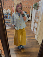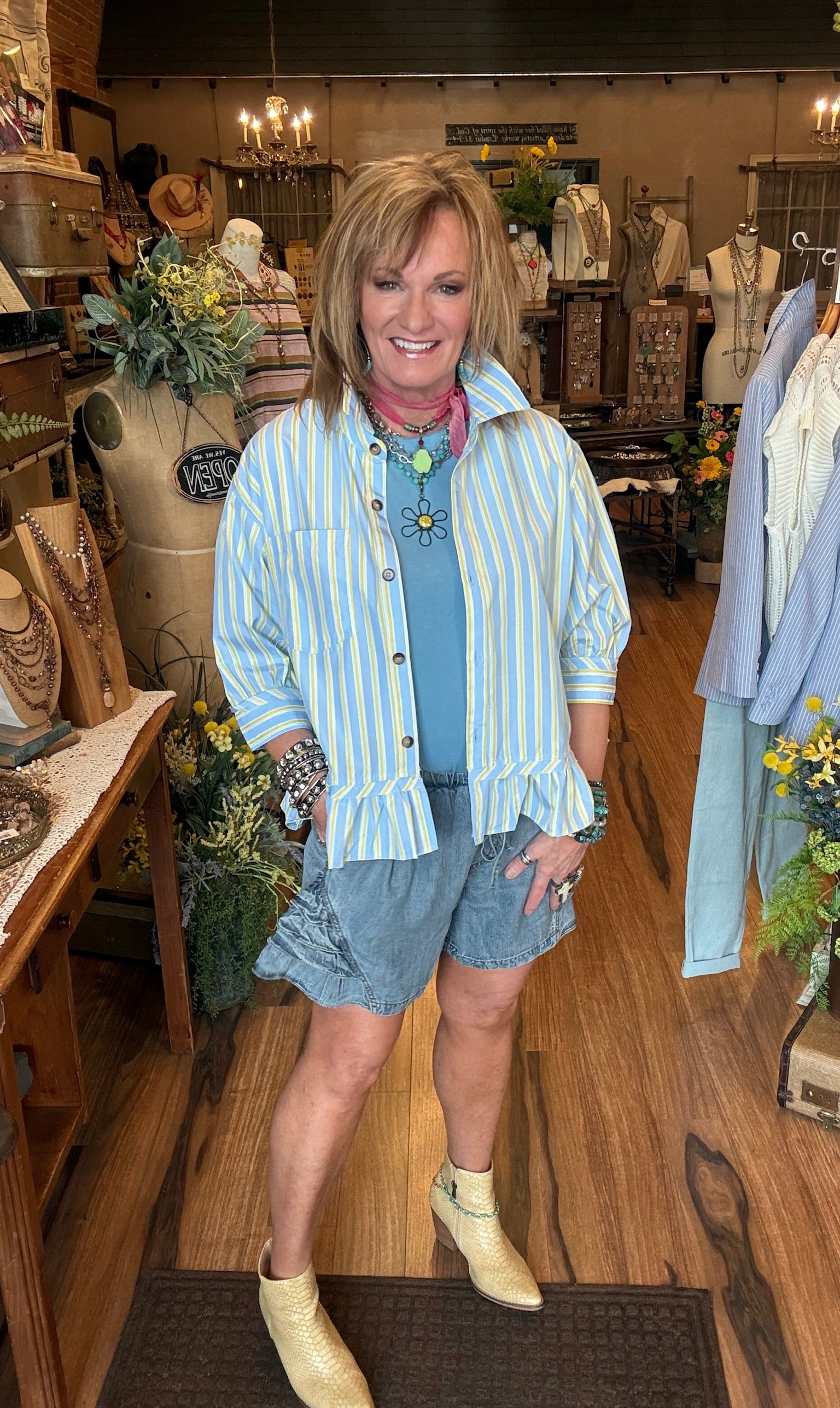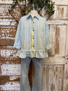 The Blue Skies Stripe Babydoll Top offers a refined aesthetic with its button-up design and ruffled hem, crafted from a blend of blue, yellow, and white stripes. The three-quarter length sleeves provide a balanced silhouette, while the fit ensures a comfortable and flattering shape for various body types.