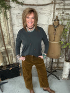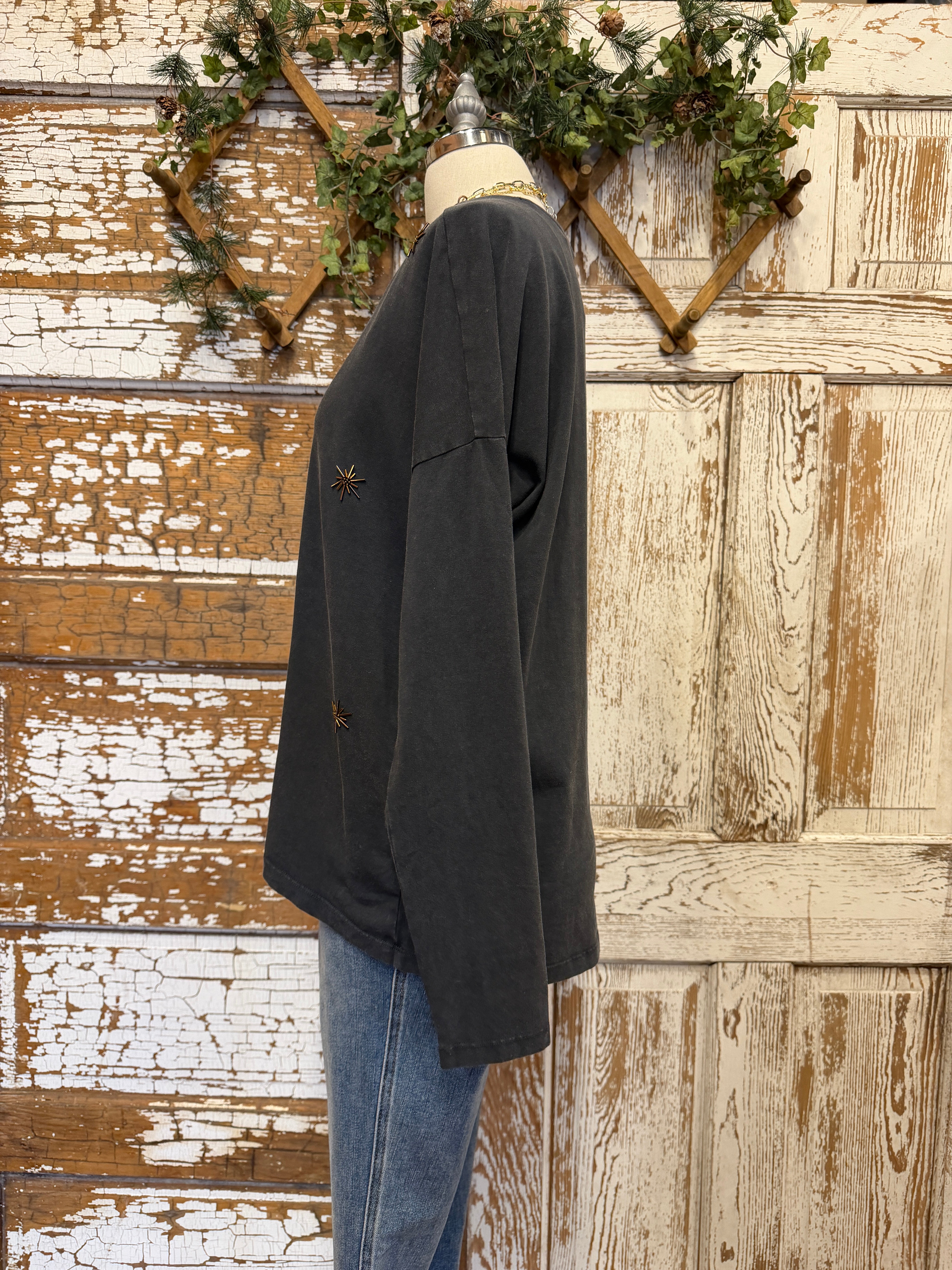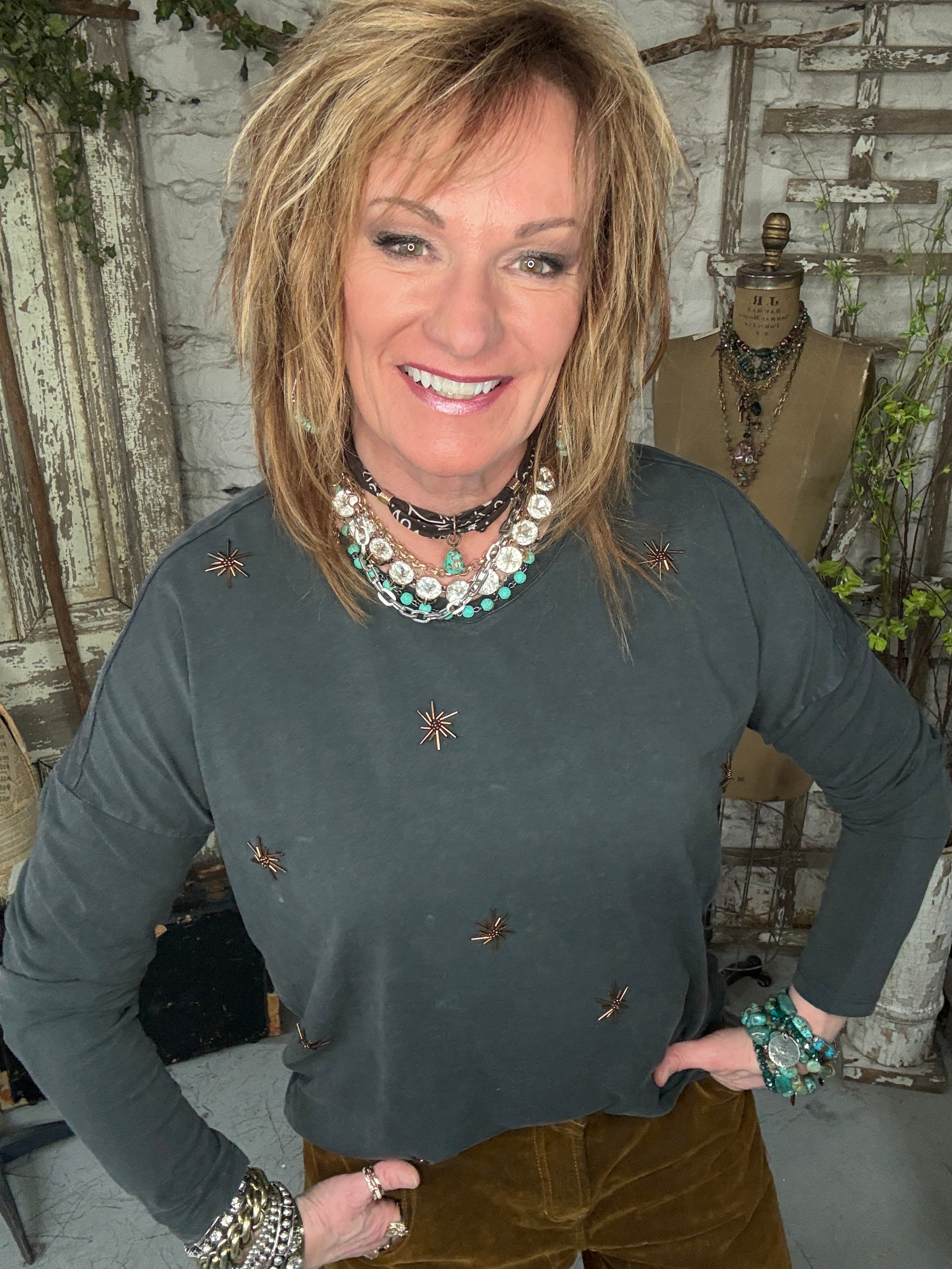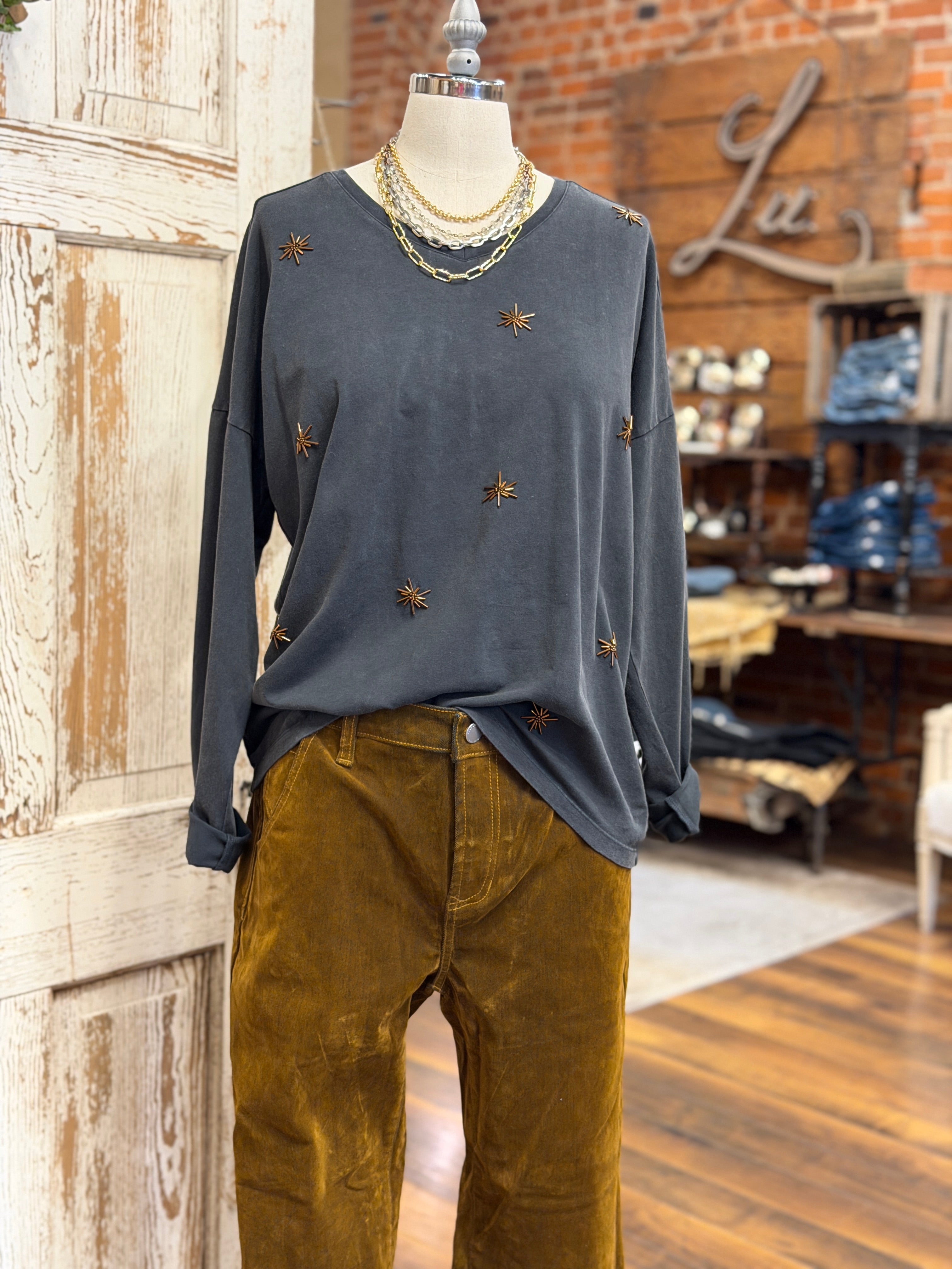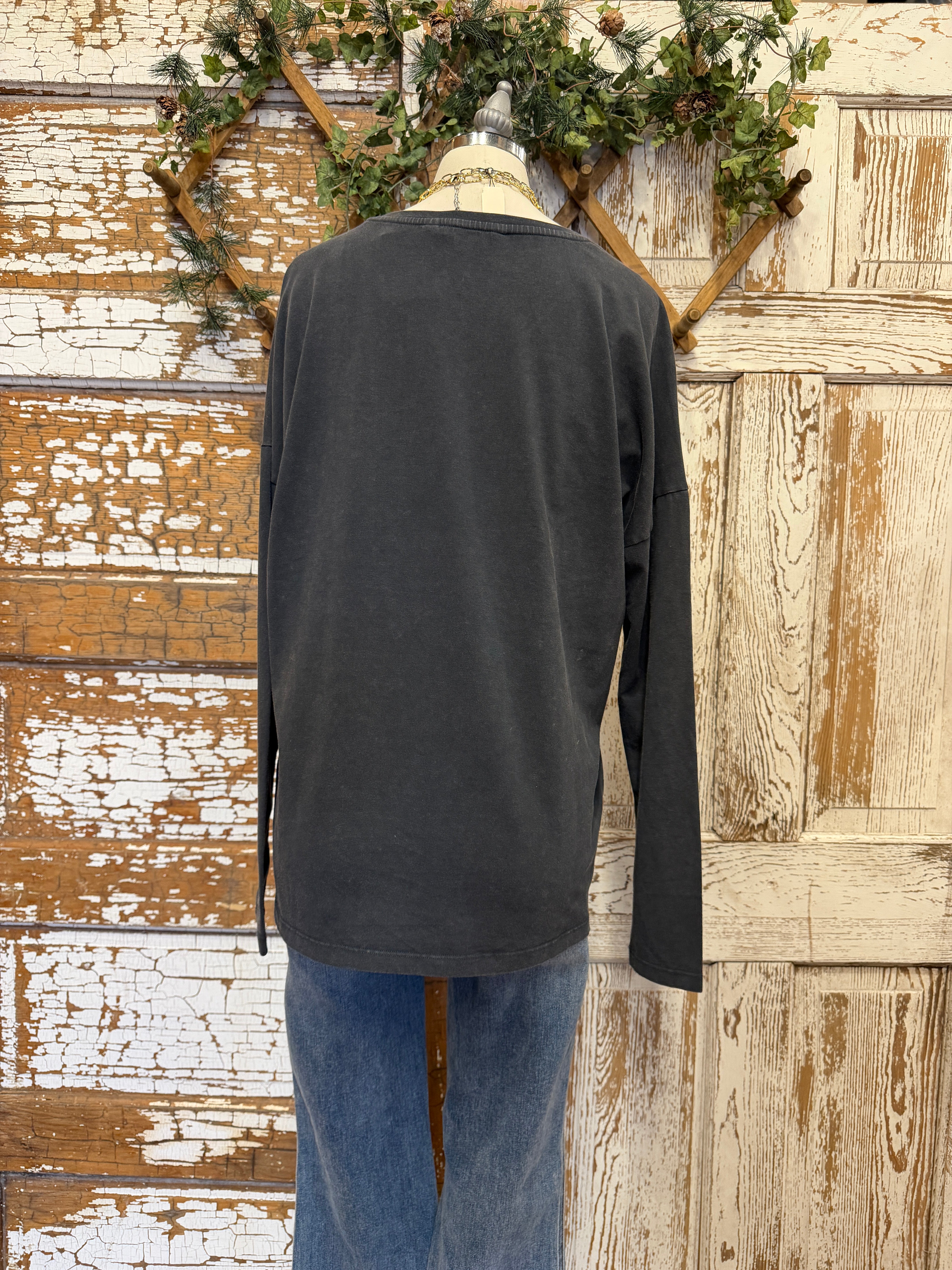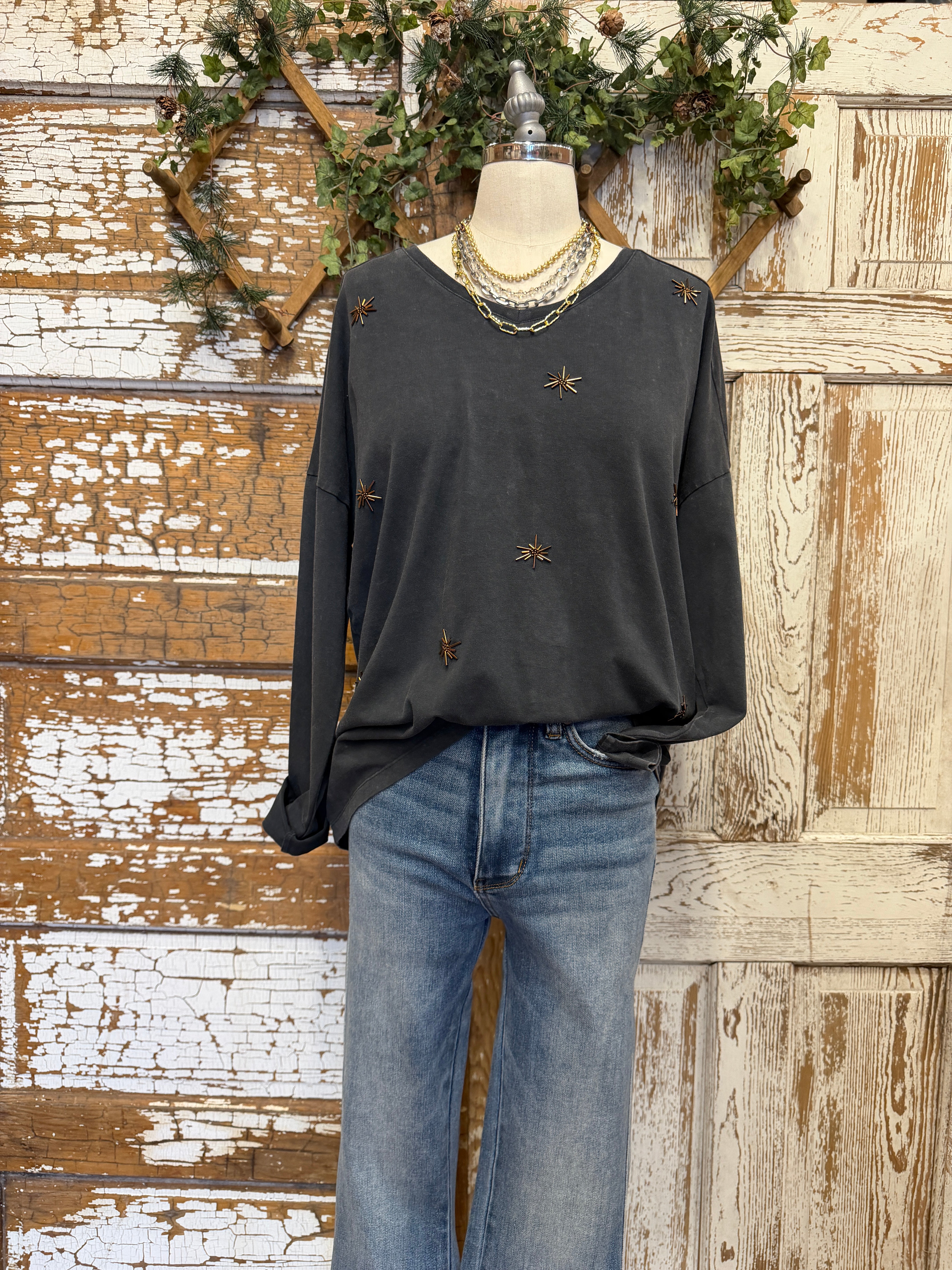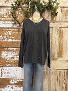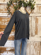 Elevate your casual style this fall with our Beaded V-Neck Knit Top in a vintage charcoal hue wash, delicately embellished with bronze beading. This piece blends comfort and style with ease, featuring long sleeves and a soft knit that make it effortlessly versatile across seasons. Embrace stylish comfort and everyday ease with this must-have wardrobe essential.