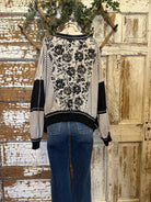 - Unique mixed media design featuring a prominent black and white floral front with striped sleeves and back.