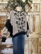 Embrace effortless style with our captivating Bohemian Floral & Stripe Mixed Print Tunic Top. This unique piece artfully blends classic elegance with a free-spirited vibe, featuring a prominent black and white rose floral print on the front panel complemented by chic black and white striped sleeves and back. Designed for the fashion-forward individual, its relaxed fit ensures ultimate comfort without compromising on flair.