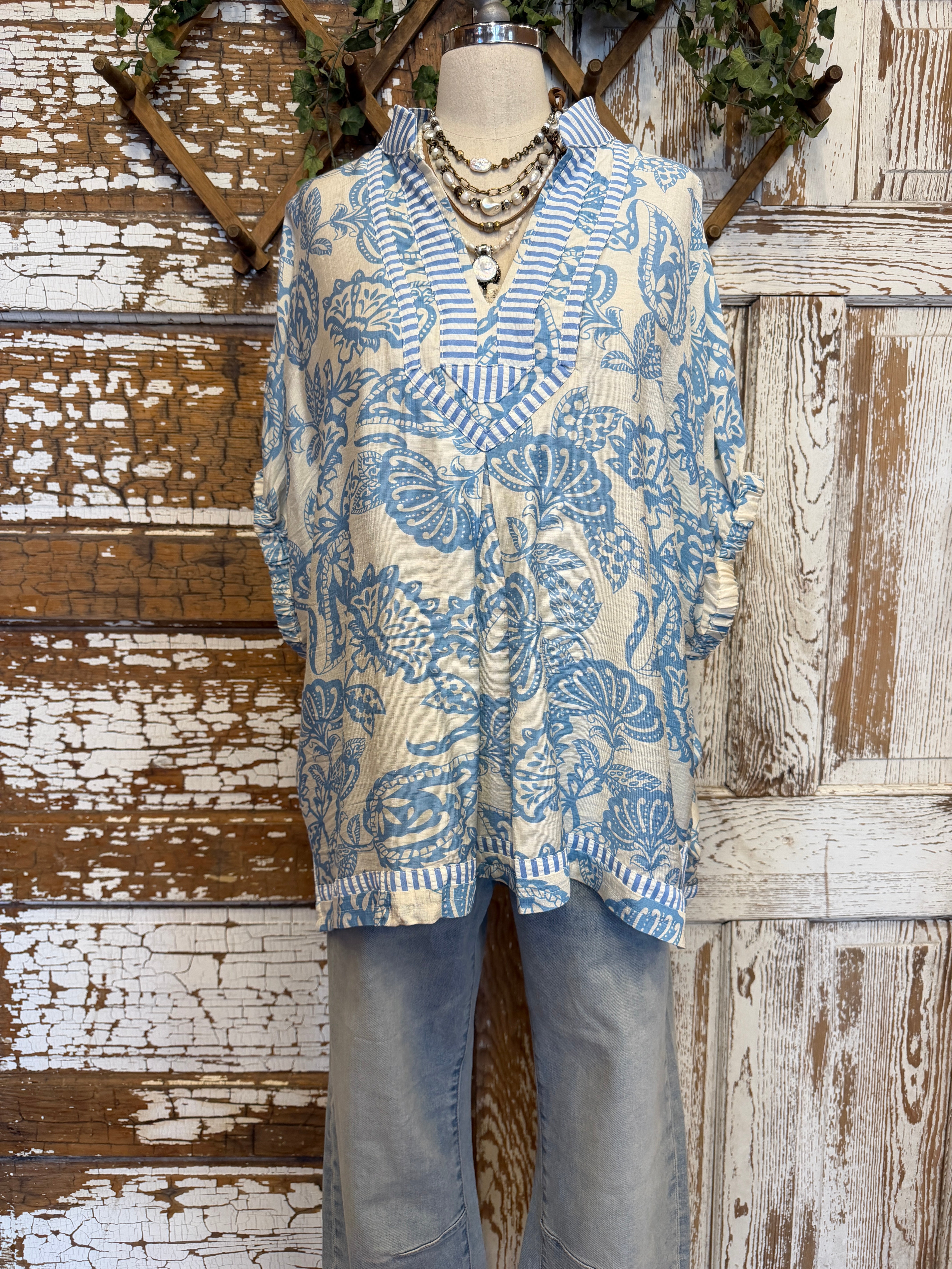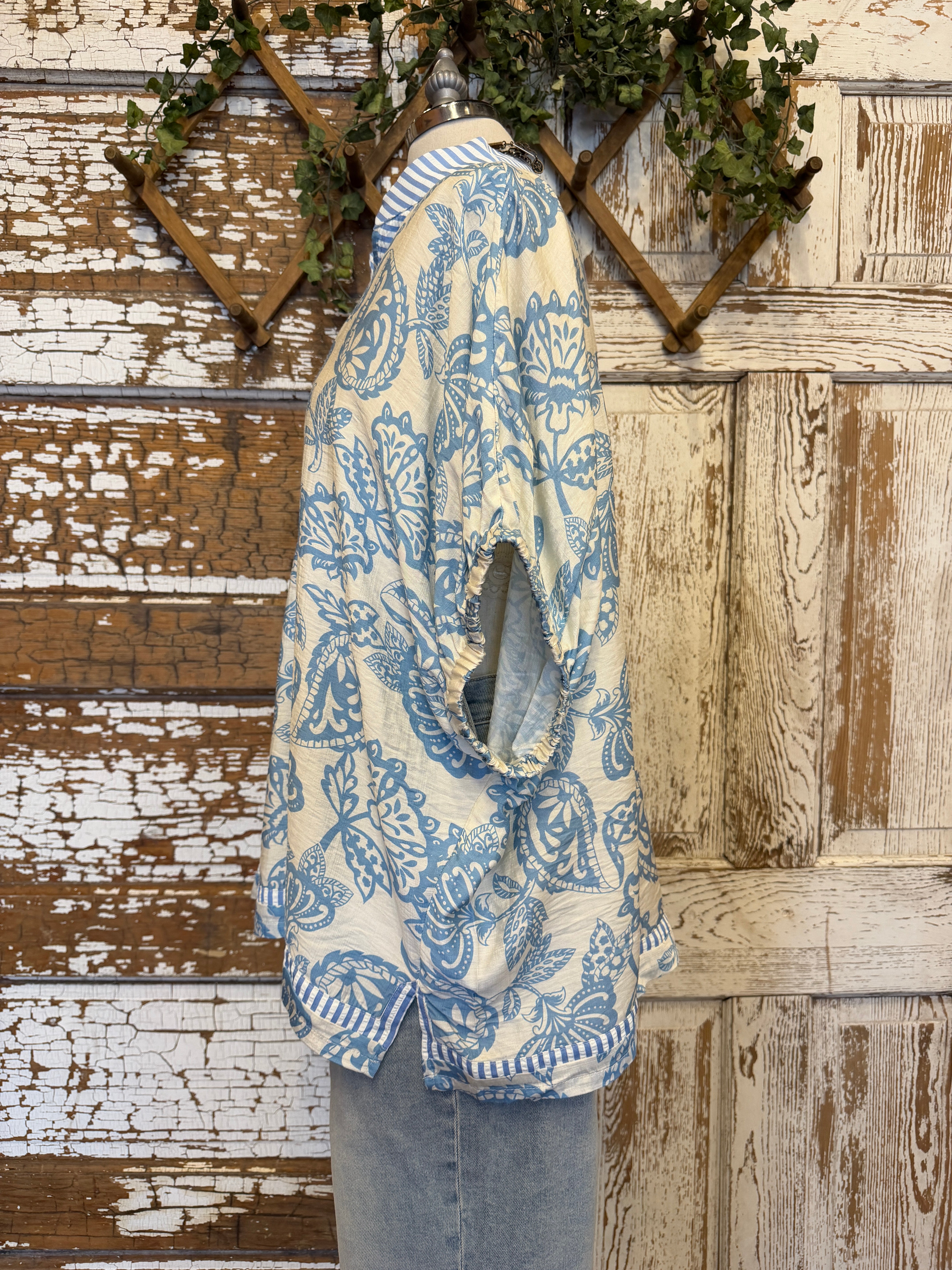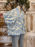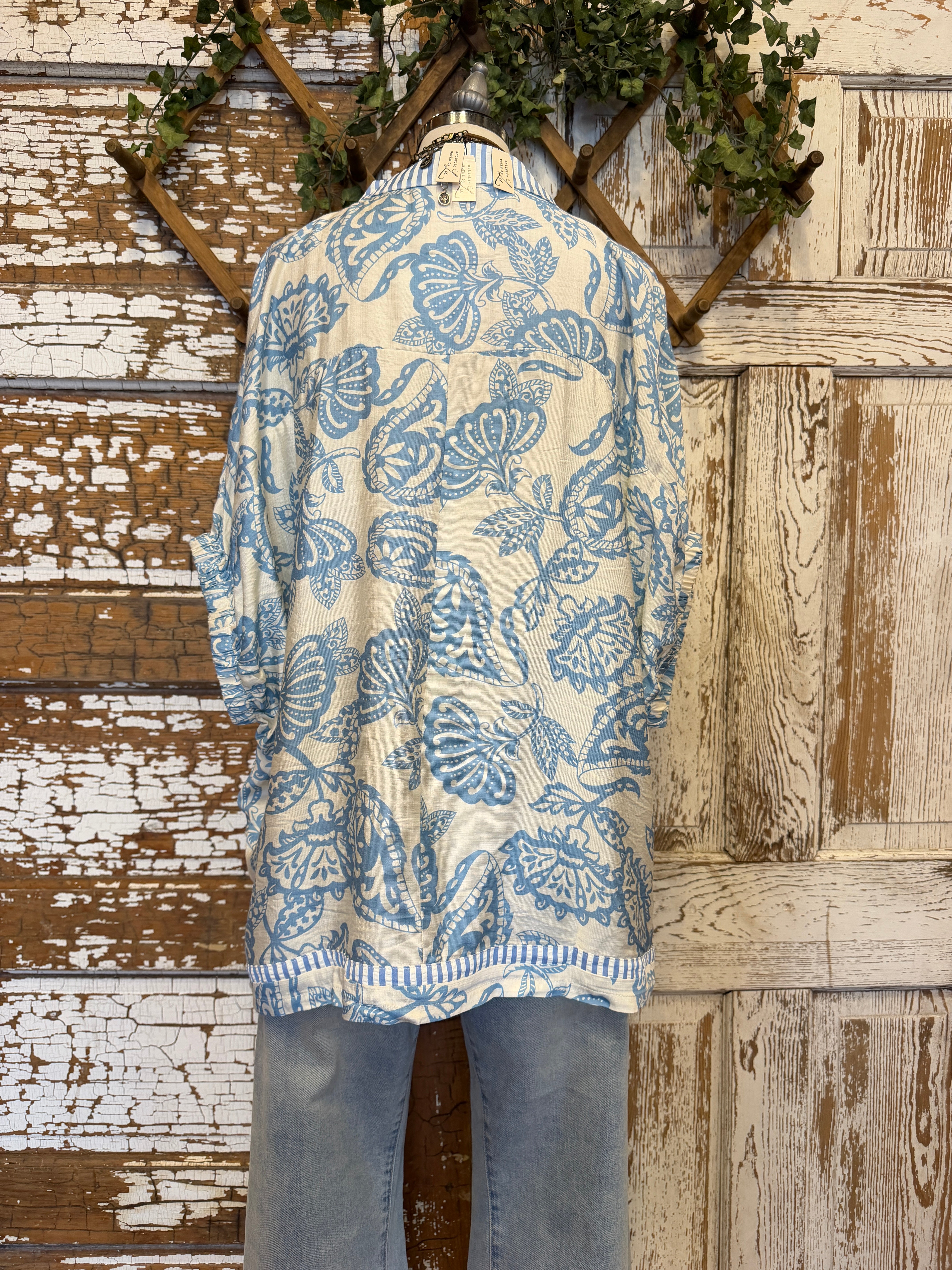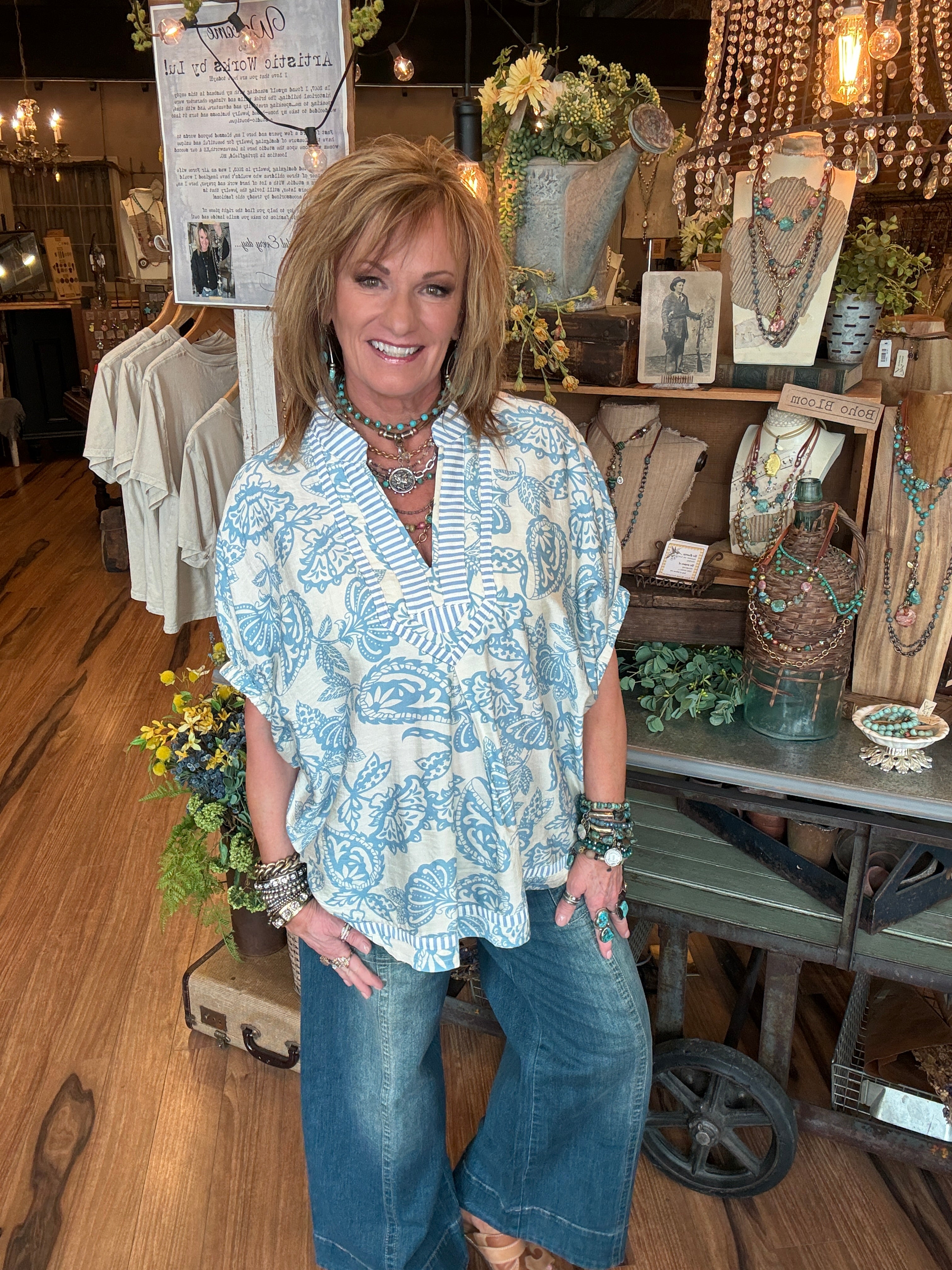 A dreamy mix of soft blue tones and boho patterns, this flowy top gives you that laid-back, boutique feel while still making a statement.