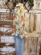 The Golden Ray Floral Blouse features a lightweight, button-front design with a semi-sheer fabric, enhancing breathability and comfort for daily wear. The unique button details add a touch of sophistication, making this blouse suitable for both casual and formal settings.