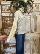Soft, feminine, and full of character—this ivory Henley brings vintage charm to your fall wardrobe. The delicate lace cuffs and subtle button-front detail make it perfect for layering or wearing solo.
