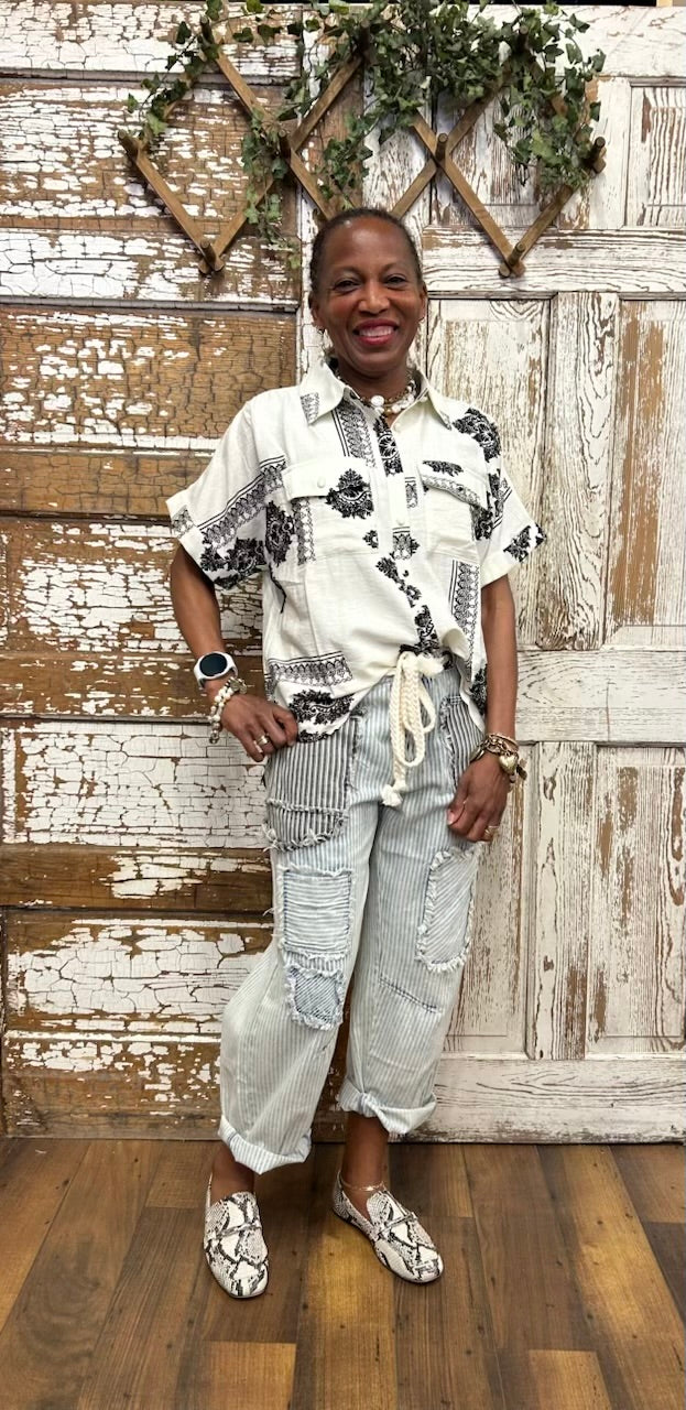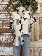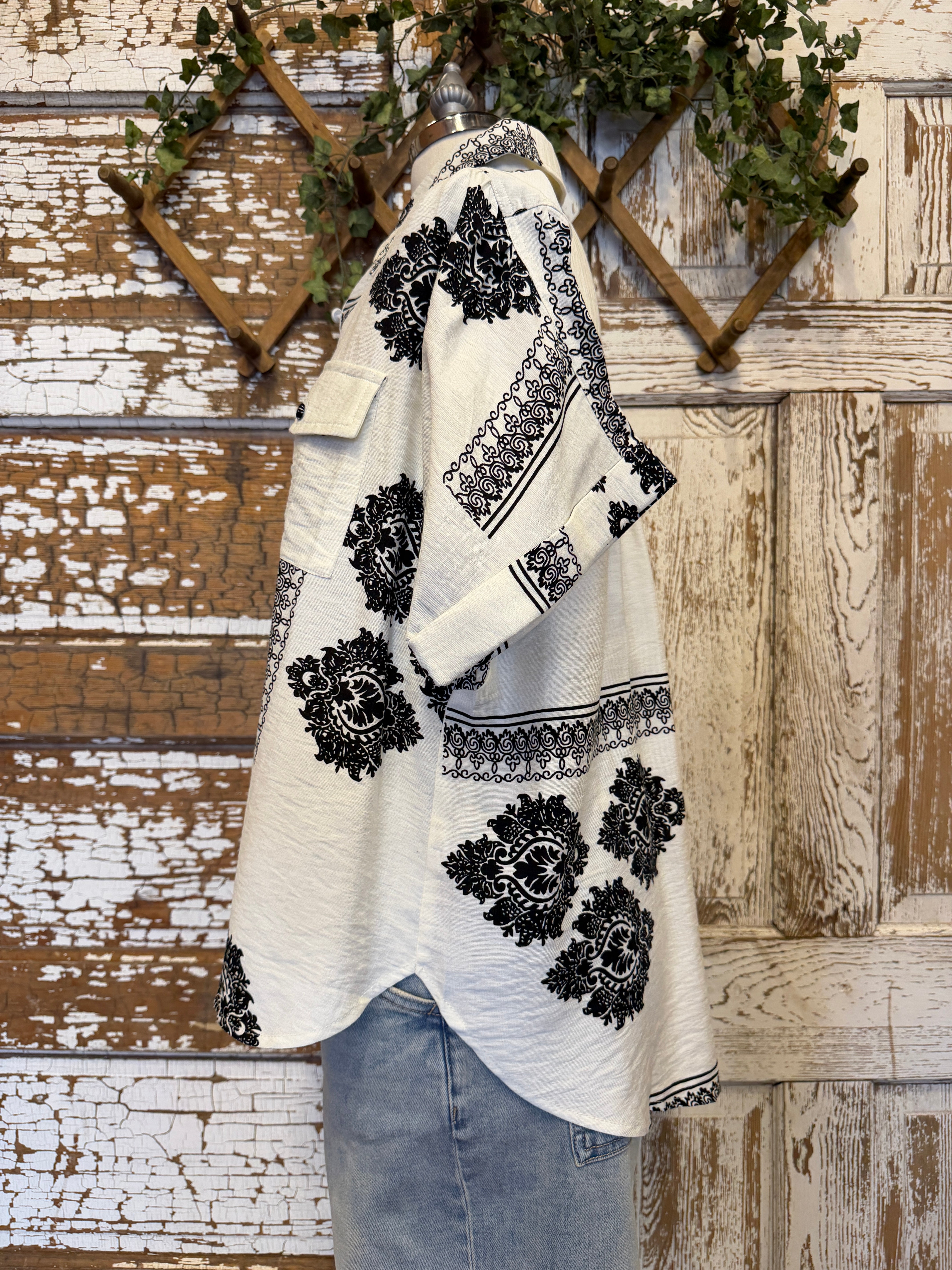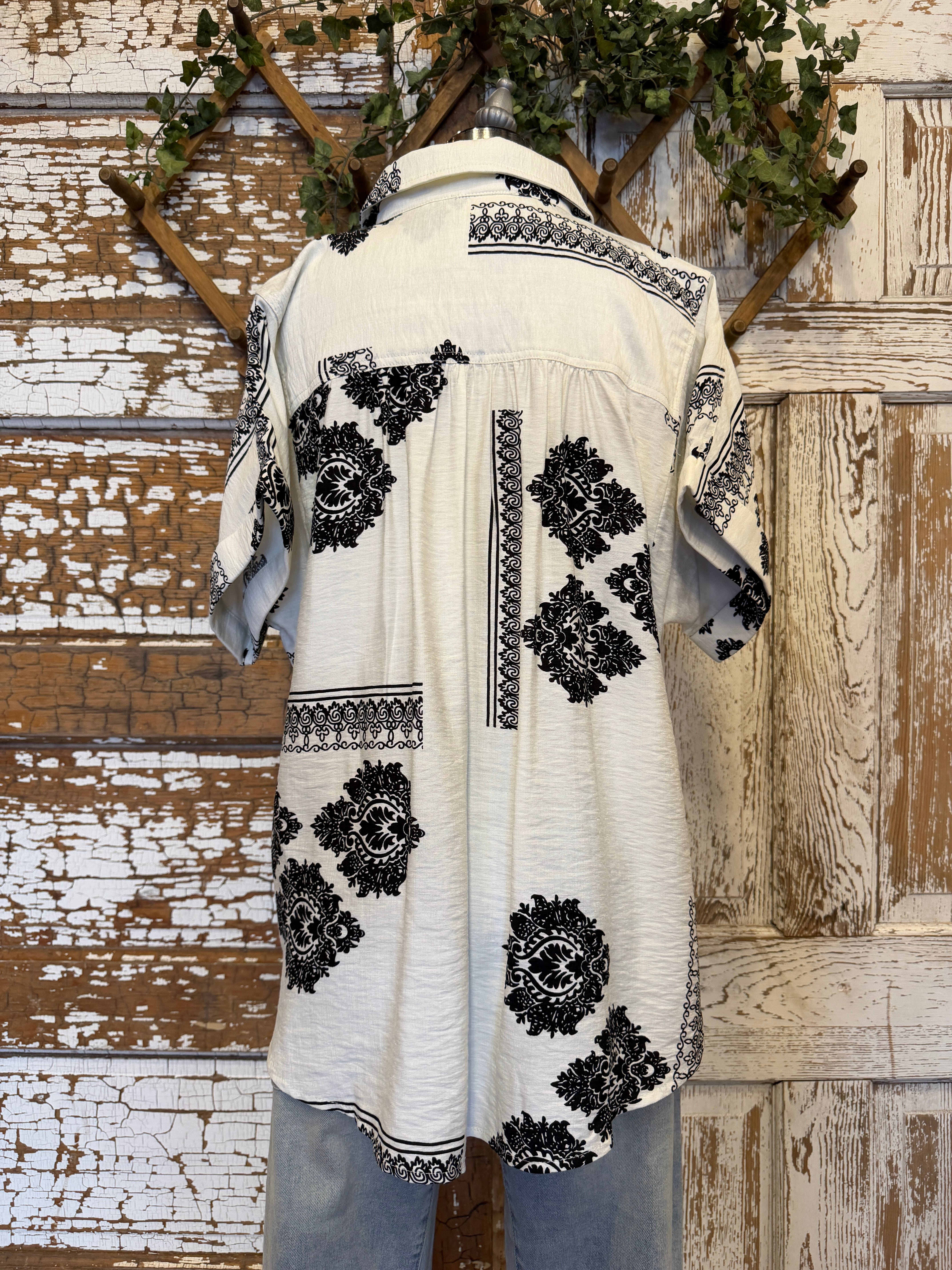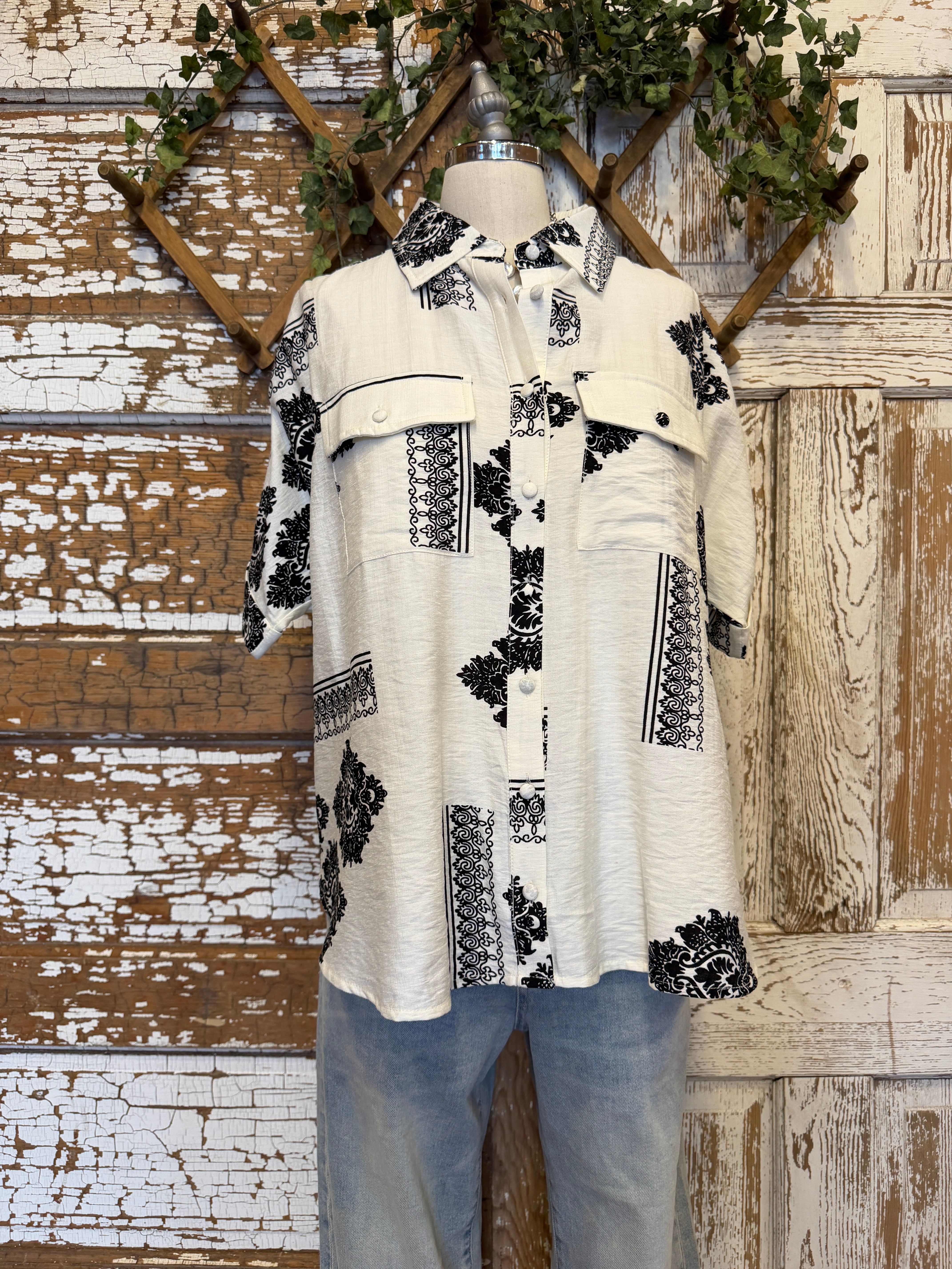Timeless with a twist—this black and ivory print top is polished, versatile, and perfect for everyday boutique style.