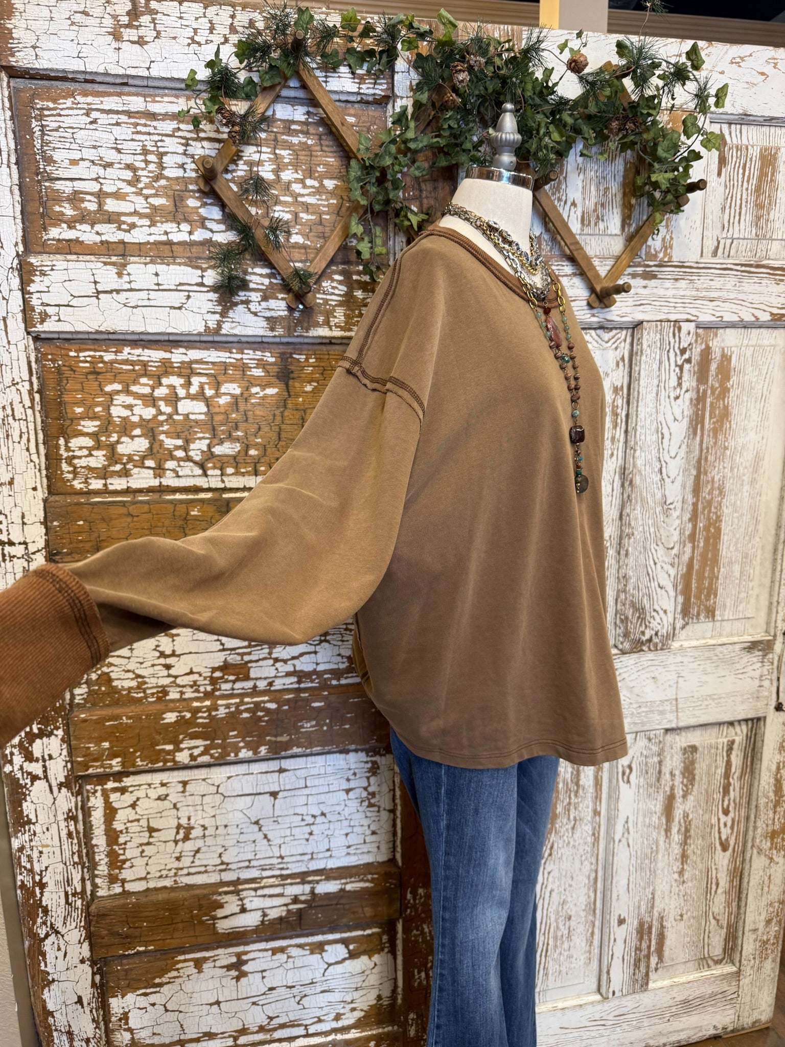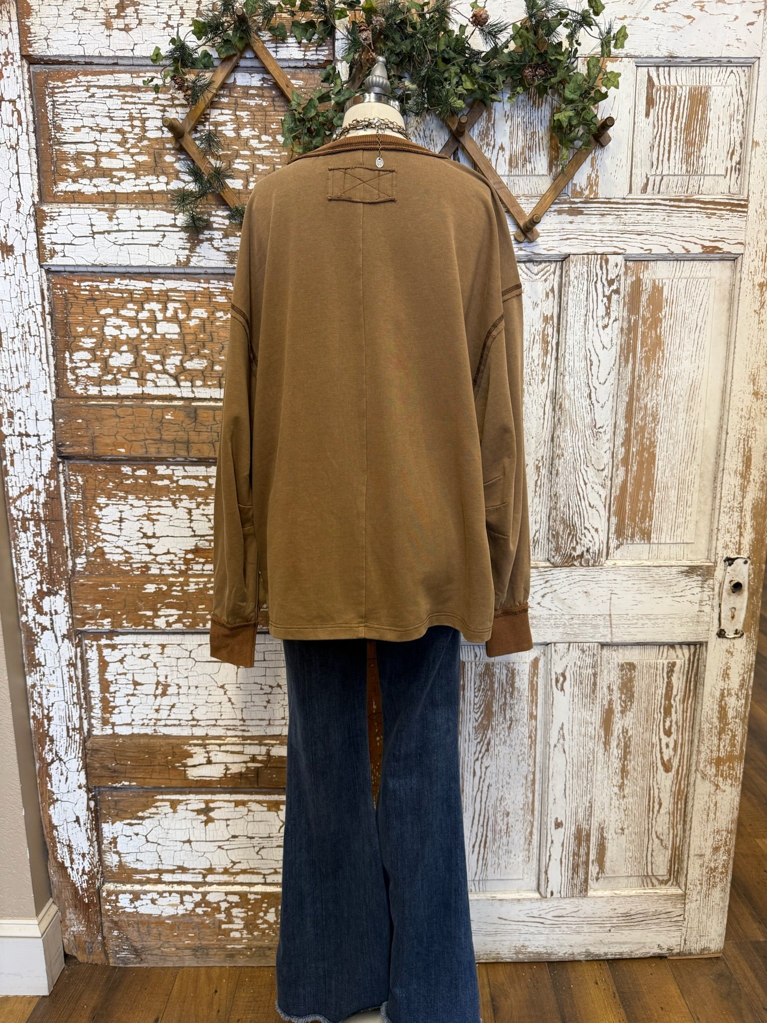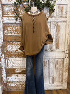 Slip into this boyfriend-cut popover top in a rich milk chocolate shade that's equal parts cozy and chic. Crafted from a breathable cotton-blend fabric with just enough stretch, it's the kind of piece that feels as good as it looks. Perfect for effortless layering or wearing solo.