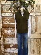 Pair it with a long-sleeve tee and jeans for a classic, laid-back vibe, or layer it over a delicate blouse for a smart-casual ensemble. This olive green knit vest is a timeless addition that promises to elevate your everyday style with its comfortable fit and appealing texture. Embrace versatility and comfort with this must-have piece.