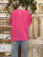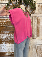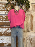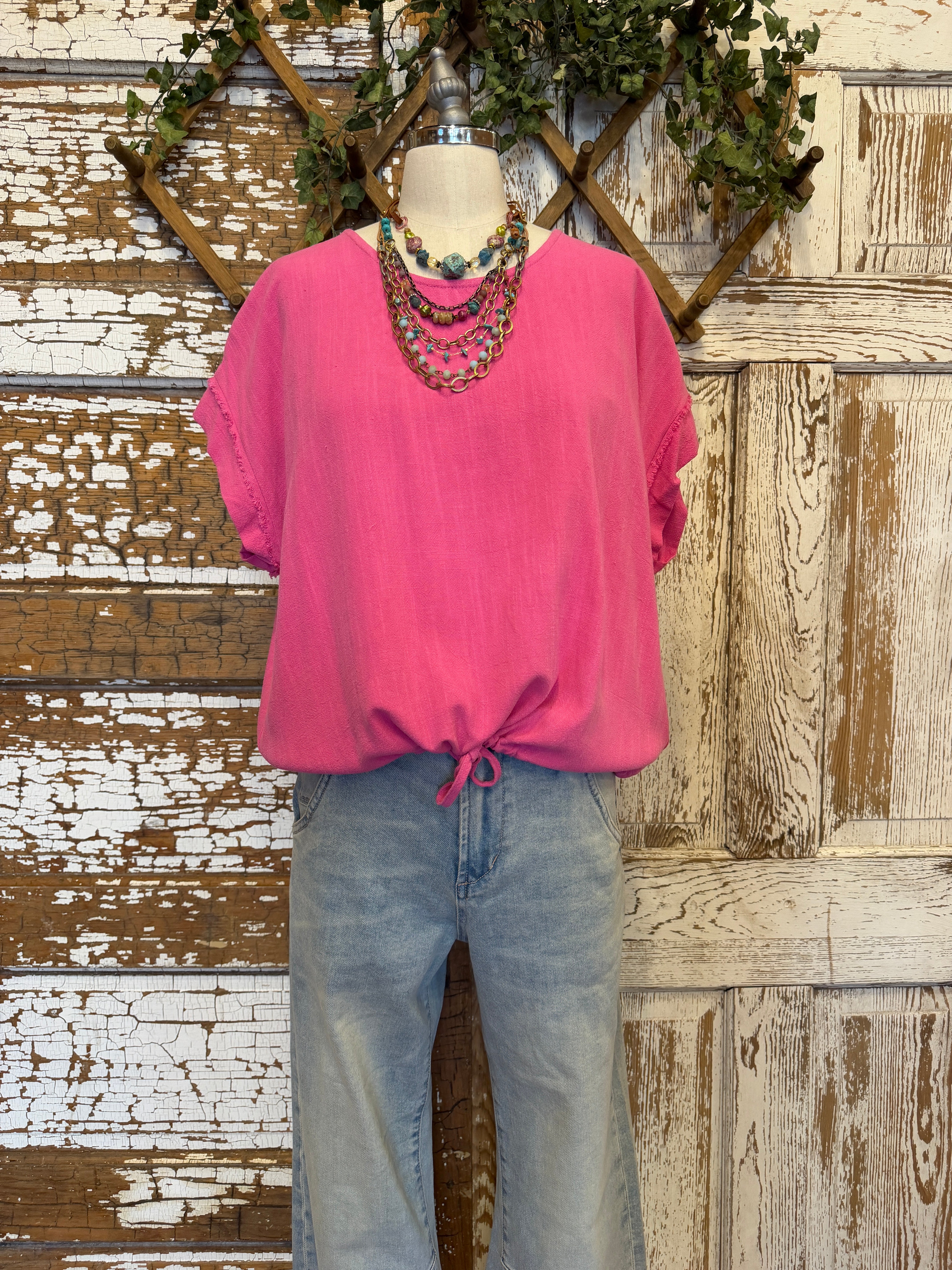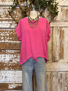 Bright, bold, and fun—this pink top features a flattering tie front detail that adds a little extra shape to your everyday look.