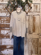 The blouse features a timeless polka dot pattern throughout its relaxed silhouette, offering a playful yet elegant aesthetic. A distinctive contrast comes from the striped detailing on the sleeves and rolled cuffs, adding an unexpected edge that elevates the design. Complete with a stylish collar, a practical button-up placket, and a subtle front pocket, this top is designed for both ease and fashion-forward appeal.
