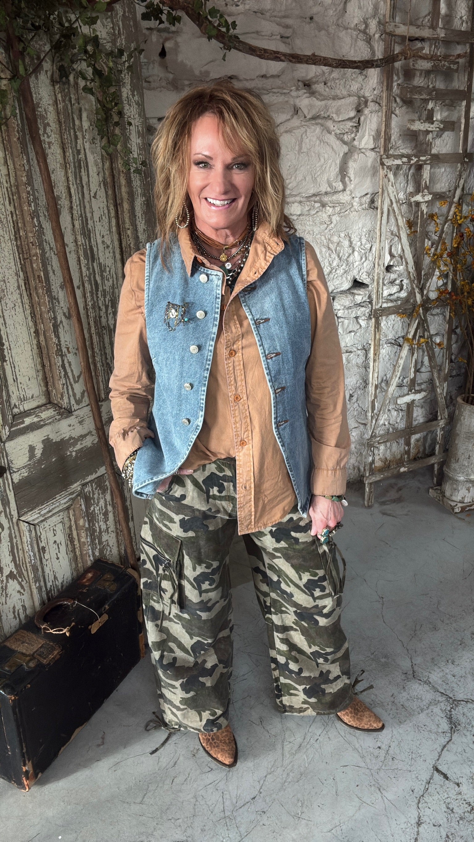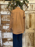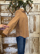 Classic with a touch of rustic charm, this lightweight button-up adds warmth and versatility to your closet. The soft whiskey hue pairs beautifully with denim for an effortlessly chic boutique look.