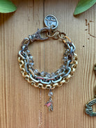 Elevate your wrist game with our exquisite Boho Chic Mixed Metal Layered Bracelet. This stunning piece masterfully combines multiple strands of diverse chains, creating a rich tapestry of texture and shine. Its versatile design effortlessly blends bohemian flair with contemporary elegance, making it an essential accessory for any fashion-forward individual. Designed by Lu and crafted with attention to detail, this bracelet features a captivating blend of matte gold-tone and polished silver-tone flat link and rounded link chains. Interspersed are delicate strands of sparkling faceted crystal beads, adding a touch of glamorous shimmer. A charming assortment of delicate leaf-shaped pendants in varying metallic finishes, including a subtle rose gold accent, along with a distinctive etched silver medallion, complete its unique aesthetic. Whether you're dressing up a casual outfit or adding a statement piece to an evening look, this multi-layered bracelet is sure to draw admiration. Its secure and ornate lobster claw clasp ensures comfortable wear while providing an additional touch of intricate design. Embrace effortless style and showcase your individuality with this truly captivating accessory.