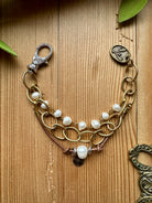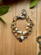 Handmade triple bracelet with gold chain, freshwater pearls, and brown leather cord.