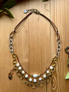 Multi-strand necklace with gold oval chain, antique brass paperclip chain, freshwater pearls, and brown leather accents.
