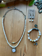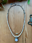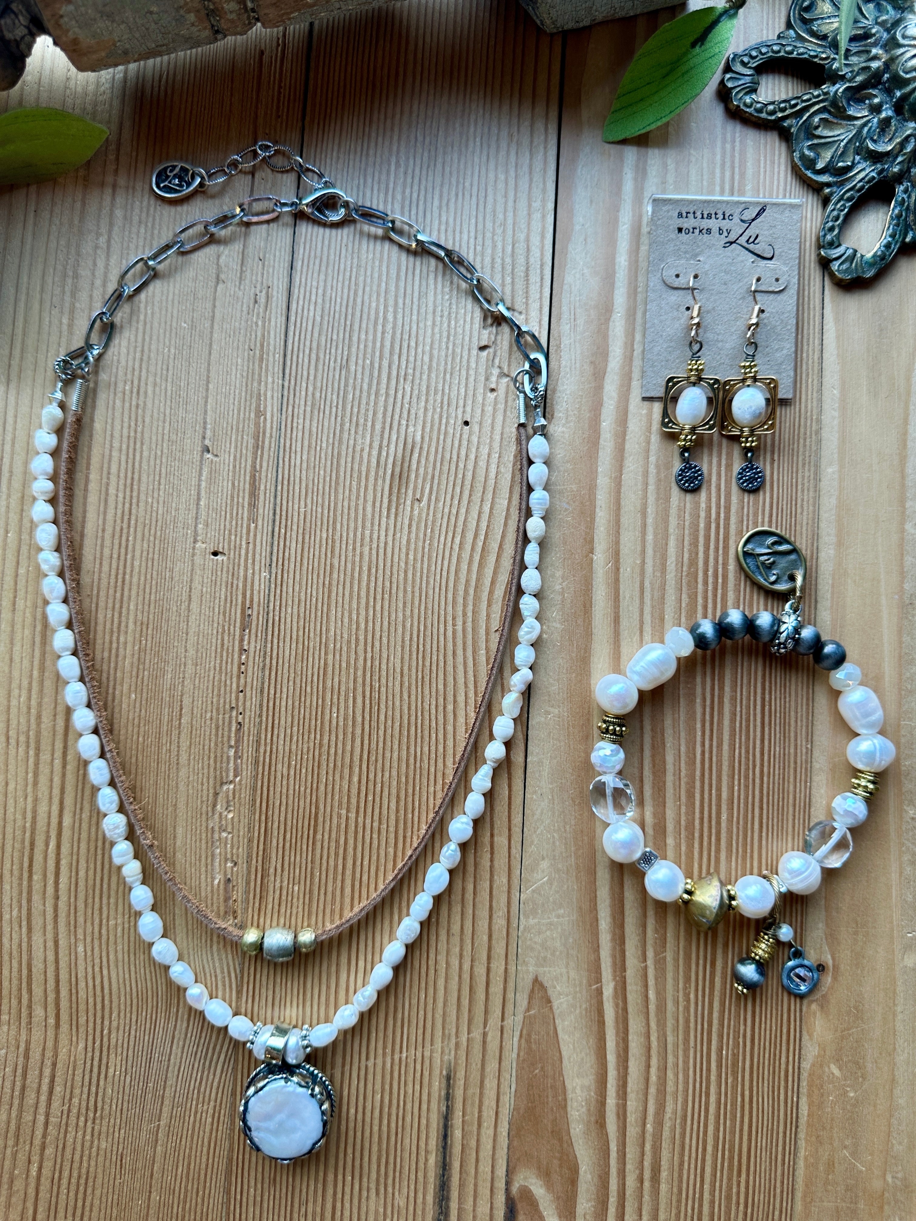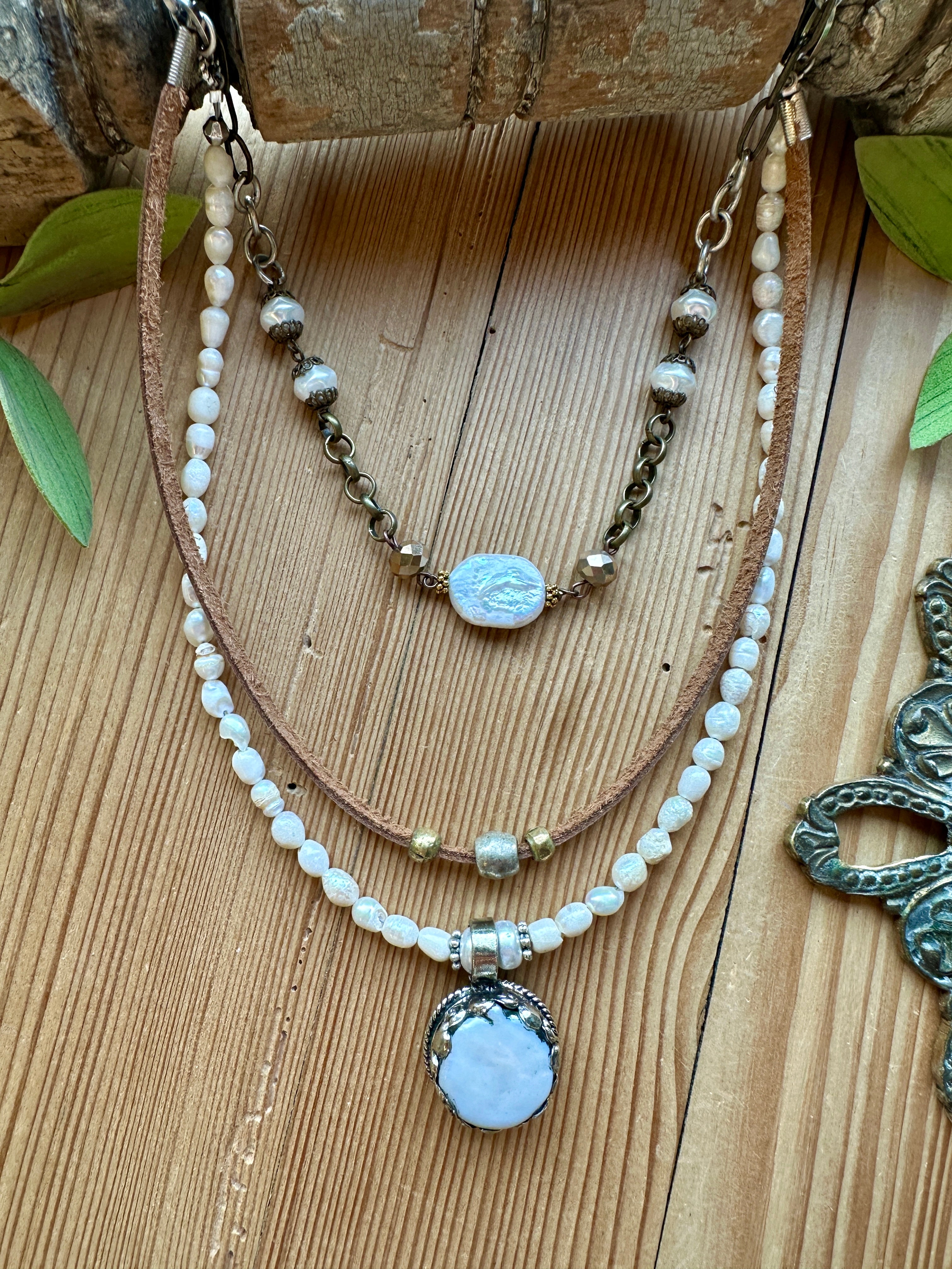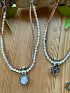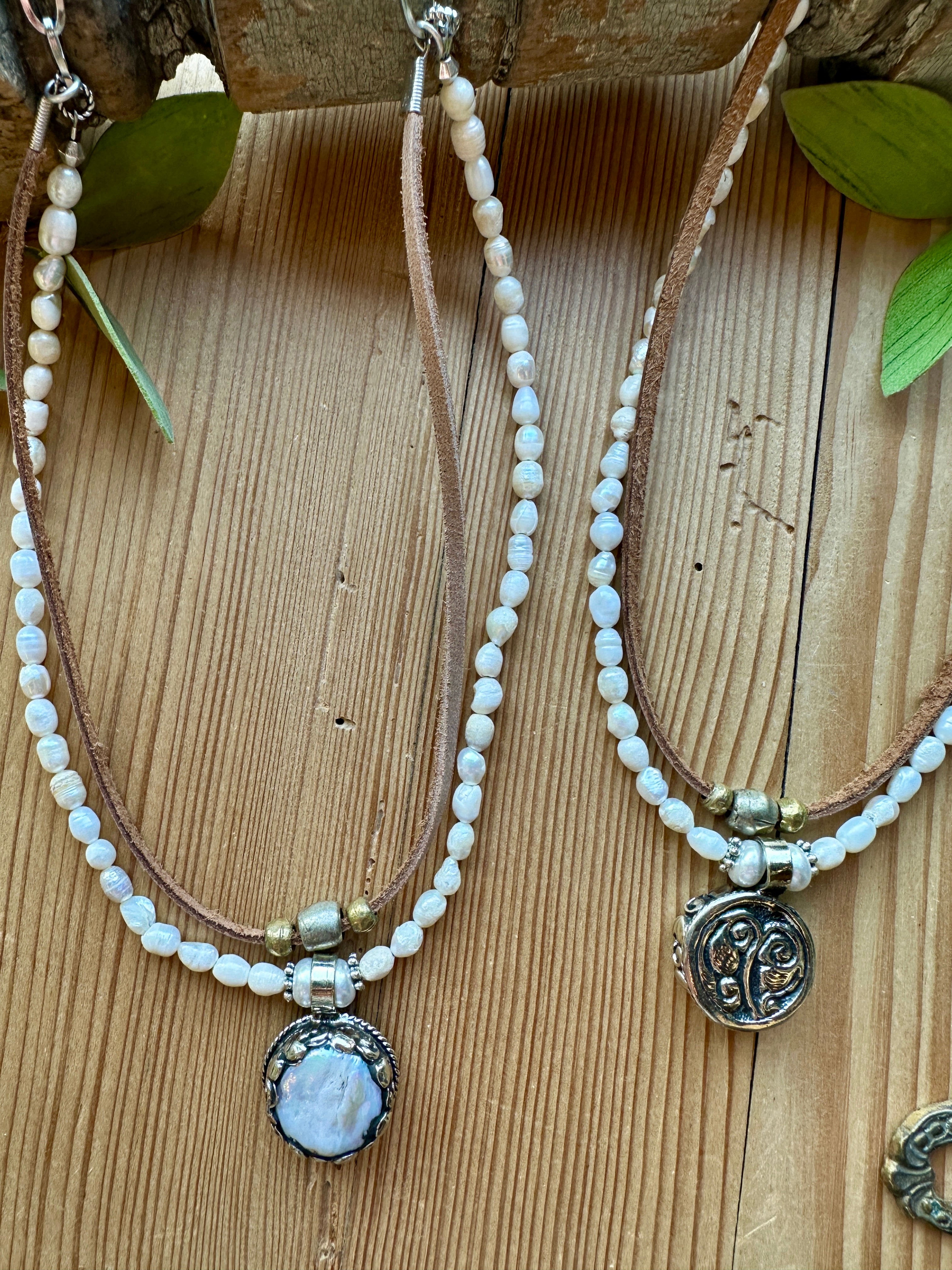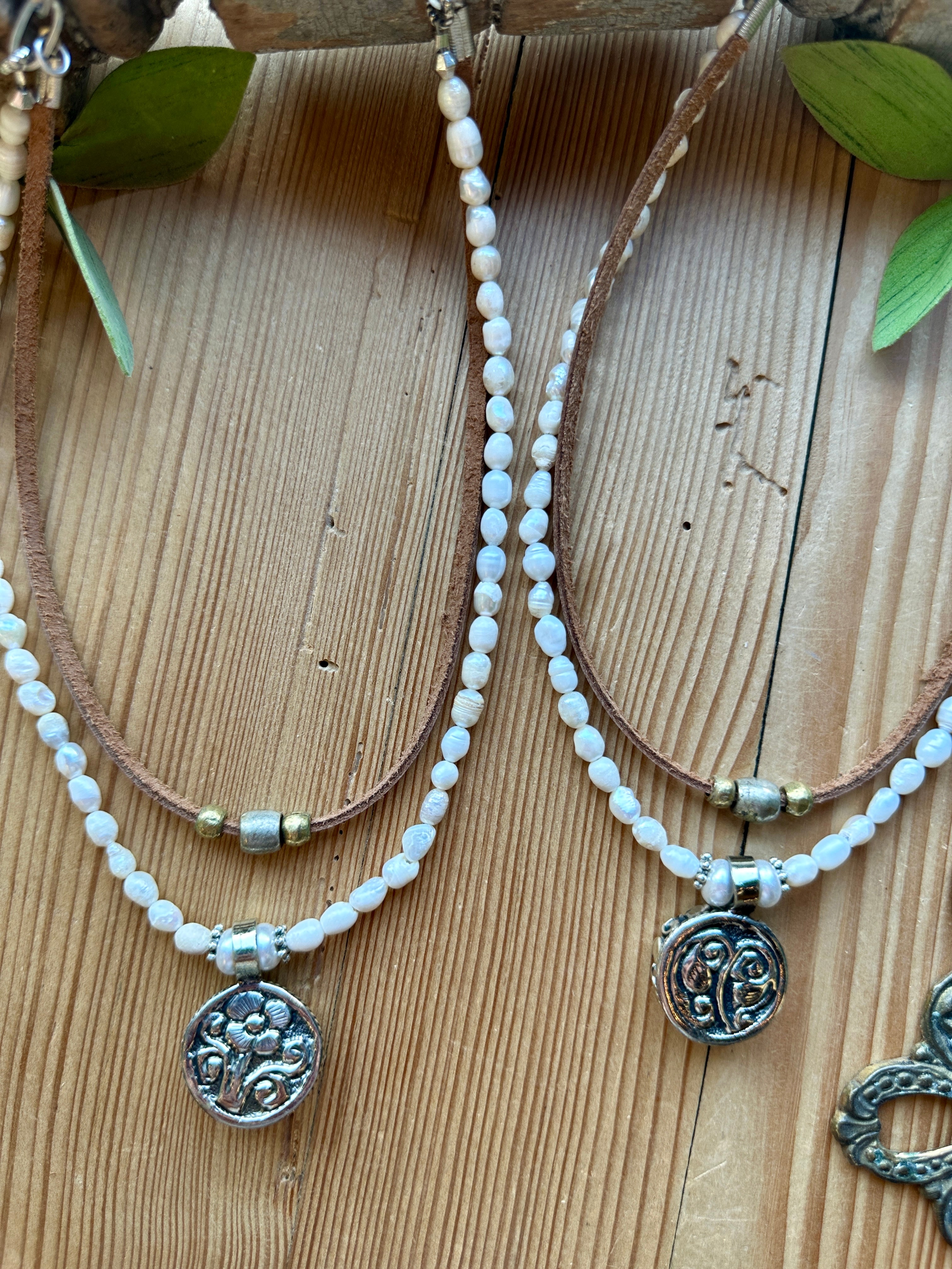 Earthy texture meets timeless elegance in the Tibetan Silver Medallion Necklace from Lu’s Gypsy Pearl Collection. This layered design features soft, luminous pearl beads paired with warm leather and accented by a striking natural pearl set in Tibetan silver. Effortlessly blending rustic charm with refined detail, this piece adds a soulful, artisan touch to any look.