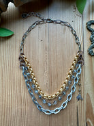 Elevate your everyday style with our stunning Bright Mixed Metal Triple Necklace. This versatile piece effortlessly combines the warmth of gold-tone, the coolness of silver-tone, and the rich depth of bronze-tone chains into one cohesive and captivating design. Perfect for those who love a stacked look but prefer the convenience of a single accessory, it's designed to make a sophisticated impact. Each of the three distinct layers offers a unique texture and appeal, from the bold, flattened oval links to the classic curb chain, and a delicate strand adorned with sparkling, clear-grey beads. The thoughtful blend of finishes and chain styles creates a dynamic visual interest that complements a wide range of fashion aesthetics, from bohemian chic to modern minimalist. Crafted for both beauty and comfort, this necklace features an adjustable lobster clasp with an extender, allowing you to customize the length to perfectly suit your neckline or outfit. Whether you're dressing up a simple tee or adding a touch of glamour to an evening ensemble, this mixed metal necklace is your go-to accessory for instant elegance and on-trend sophistication.