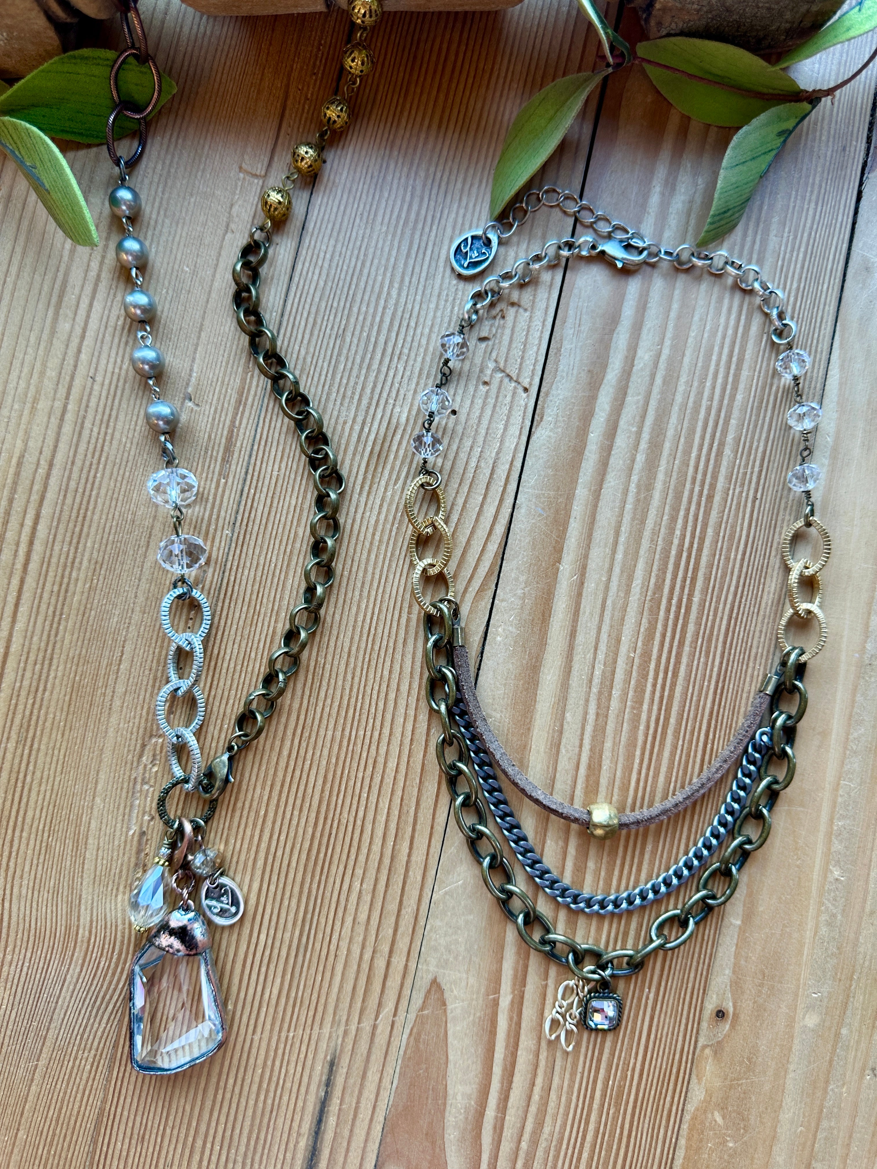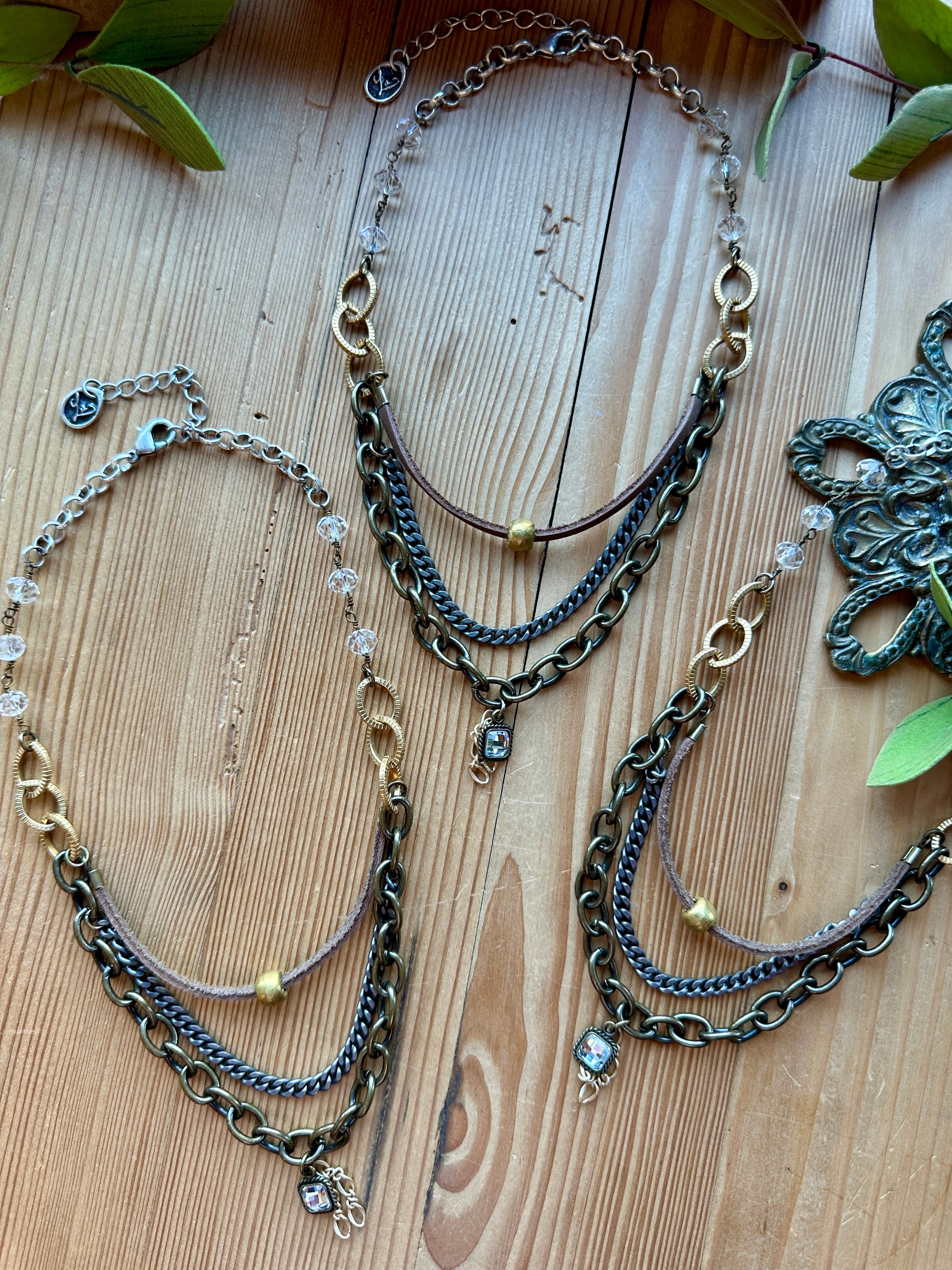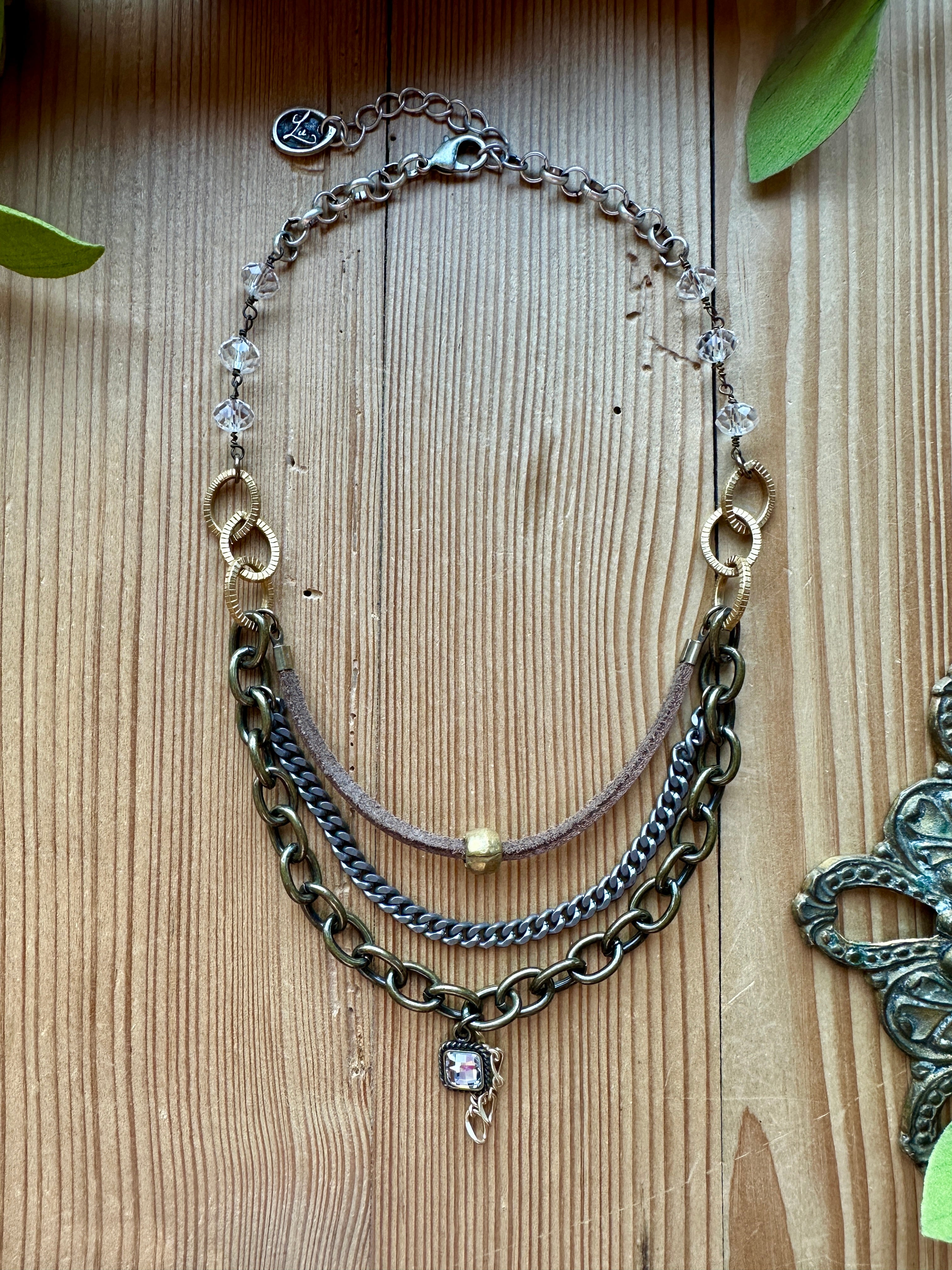 This stylish triple-layer mixed metal necklace blends modern edge with rustic charm for the perfect everyday statement piece. Featuring layered chains, a soft suede accent, and a subtle crystal detail, it’s an easy-to-wear necklace that adds texture and shine to any outfit—casual or dressed up.
