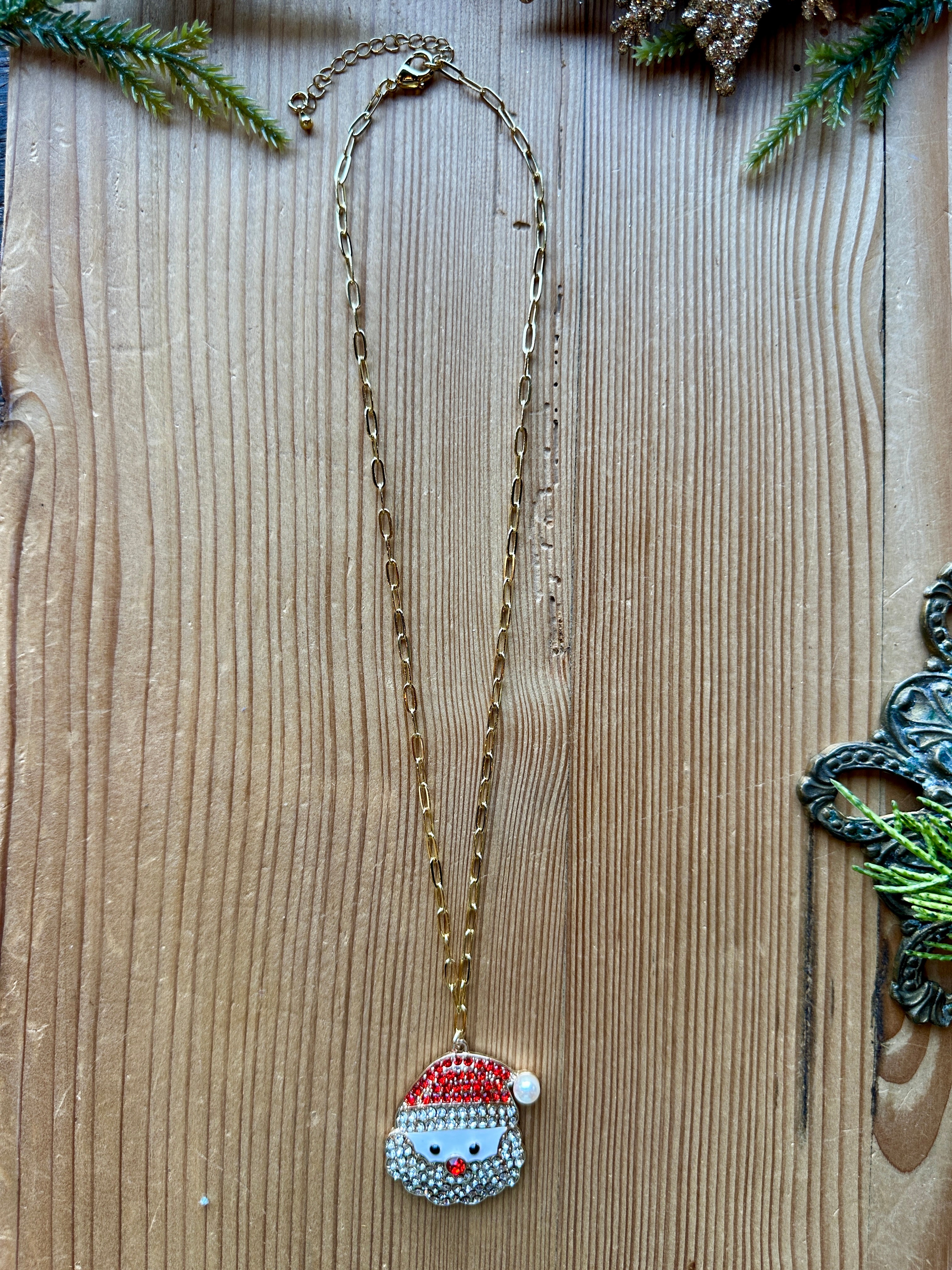 Celebrate the season with a little extra sparkle. This festive Santa necklace from Artistic Works by Lu features a joyful Santa pendant paved in clear and red crystals with a sweet pearl accent on his hat. The pendant hangs from a gold tone paperclip style chain that feels modern yet playful, perfect for dressing up cozy sweaters, graphic tees, or your favorite boutique holiday outfits.