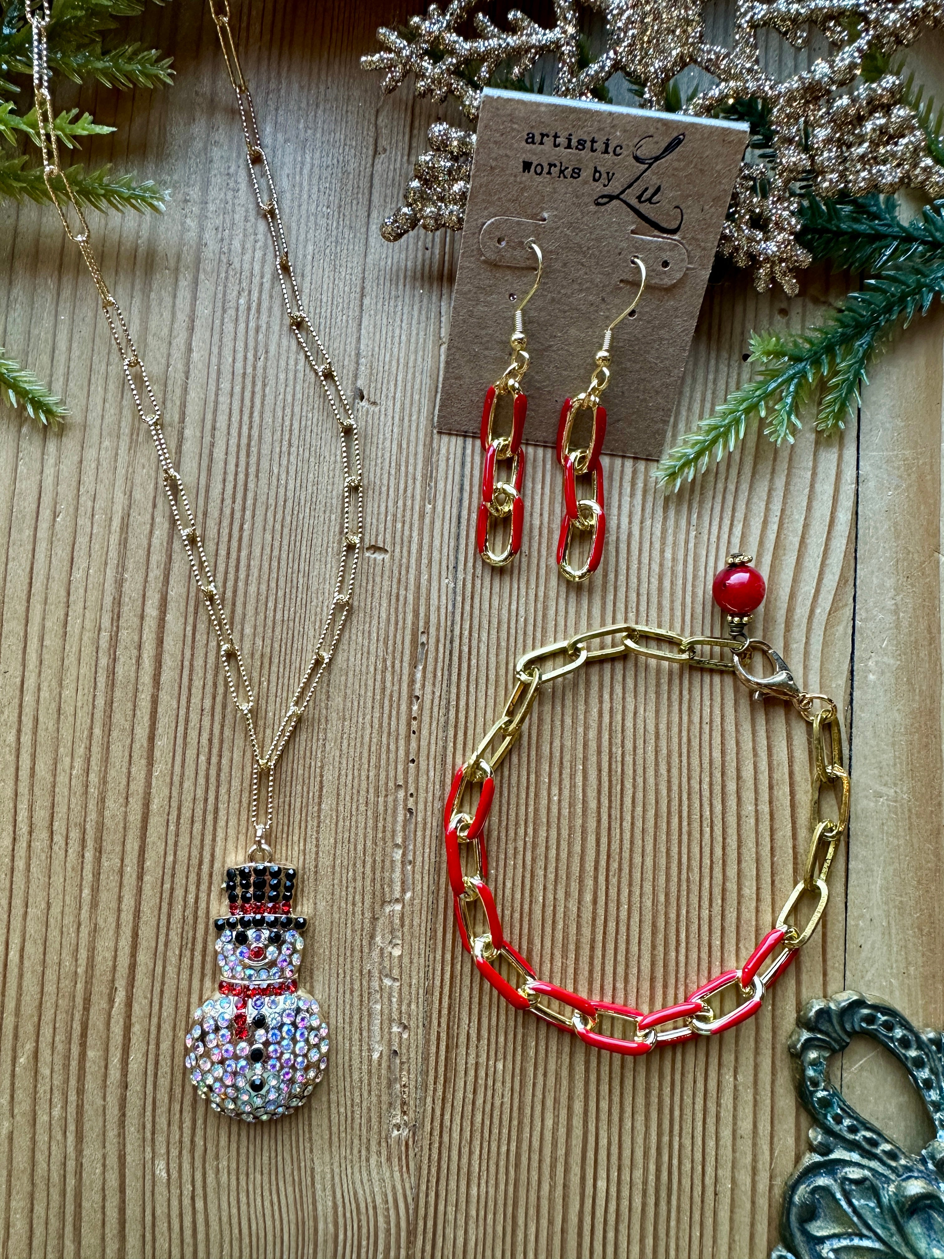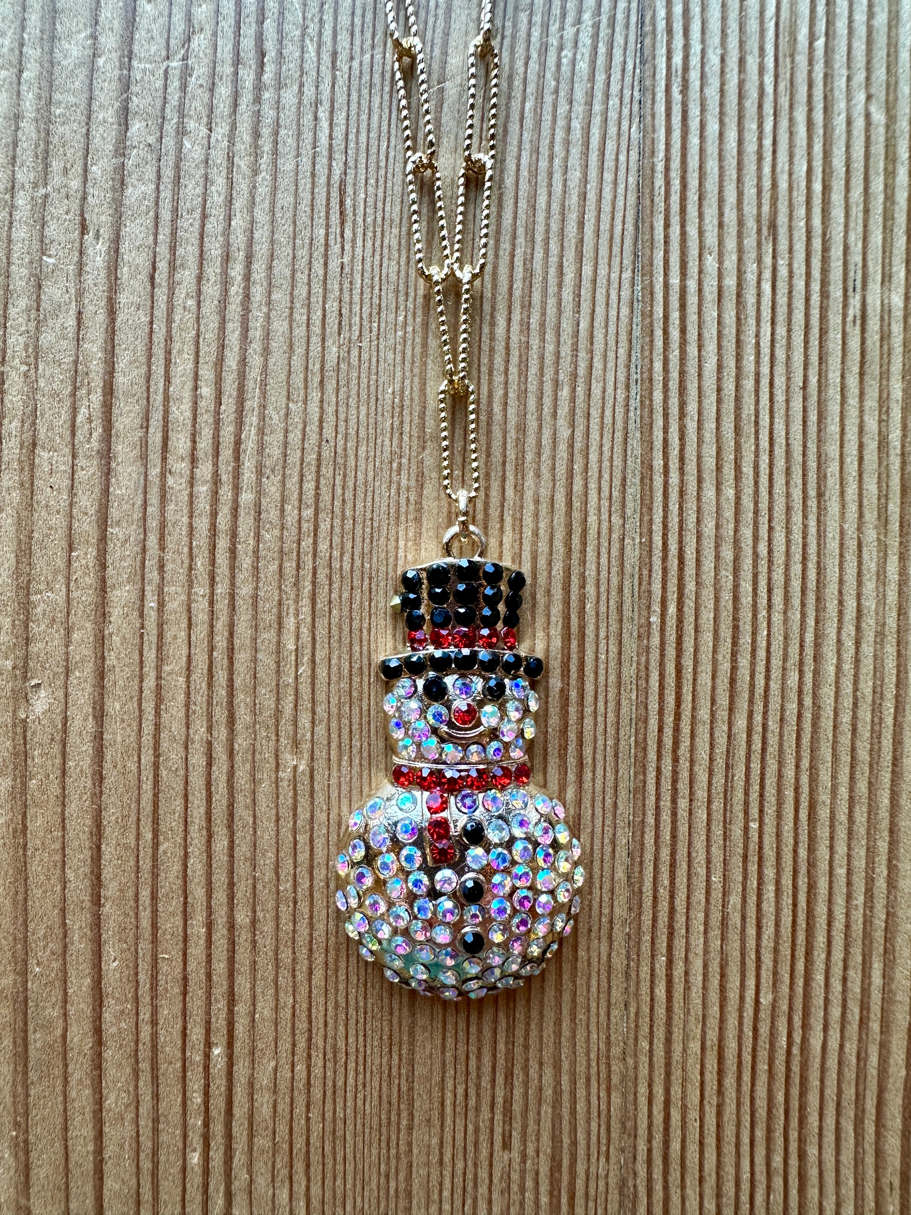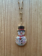 Bring a little Christmas joy to every outfit with this sparkling snowman necklace from Artistic Works by Lu. A glittering snowman pendant covered in multi colored crystals hangs from a delicate gold tone paperclip style chain, creating the perfect blend of playful charm and boutique sophistication. The stones catch the light beautifully, making this piece a fun accent for holiday parties, cookie baking afternoons, and every festive moment in between.