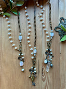 Lu used freshwater pearls and a mix of gold, silver, and copper chains to create the Gypsy Pearl Interchangeable Necklace. Accented with brown leather, this versatile piece can be styled for any occasion. Make a statement with this unique and elegant necklace.