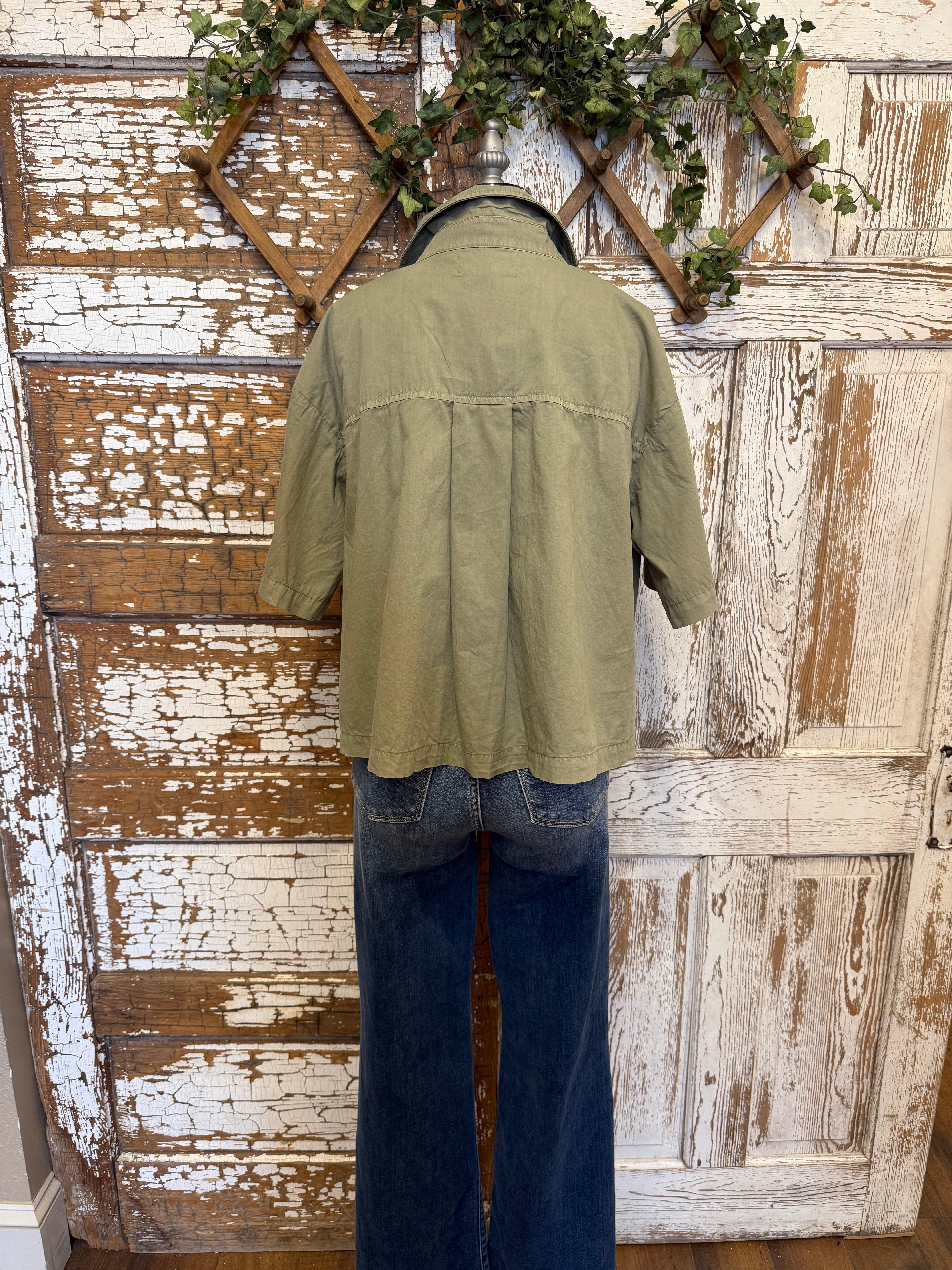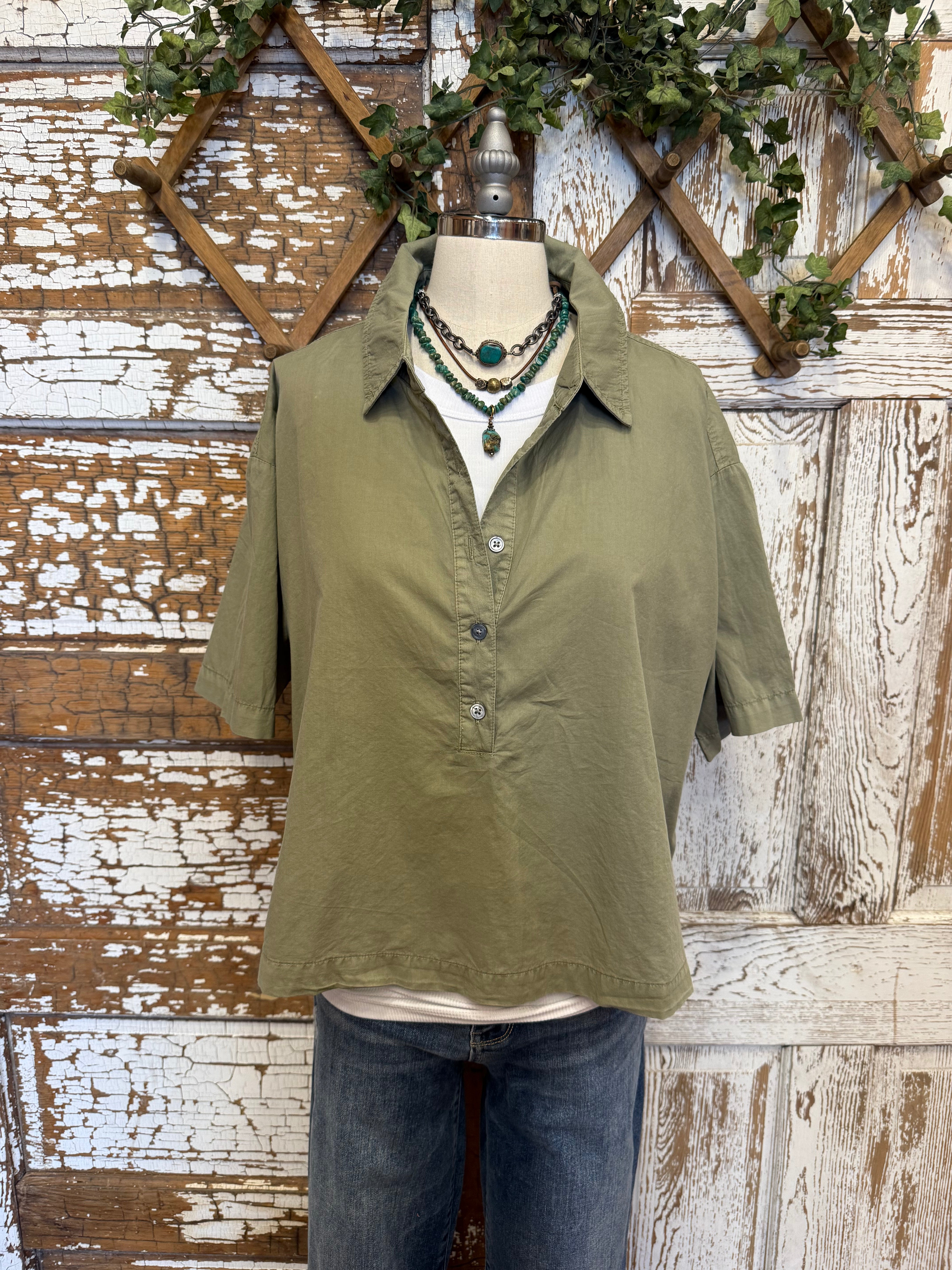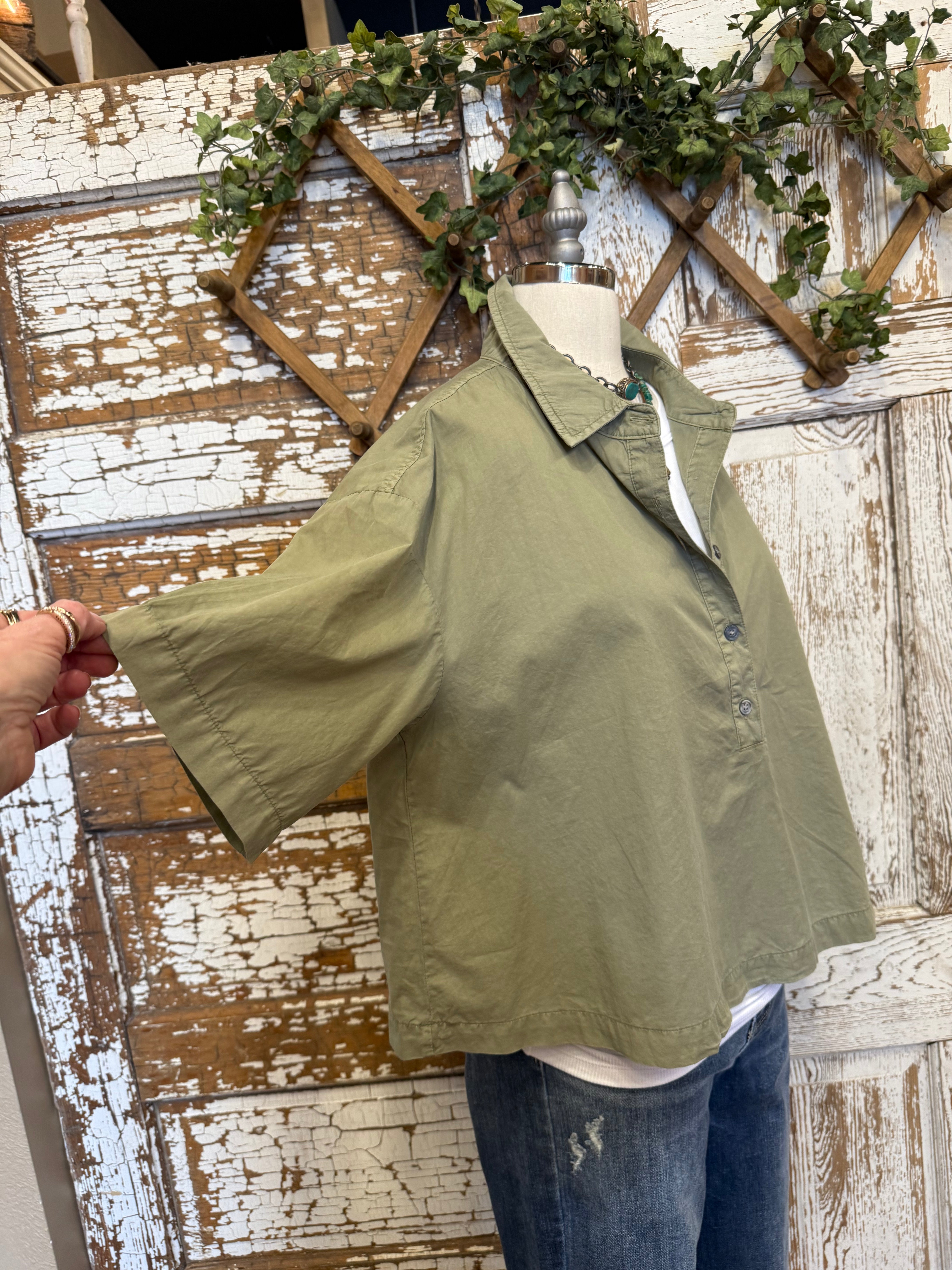 This sagebrush popover sage green top has an easygoing style. Designed with a relaxed collar and a slightly cropped length, it brings a laid-back yet put-together vibe to your everyday wardrobe. The 3/4 button placket adds just the right touch of utility detail, making it perfect for layering or wearing on its own. Soft, versatile, and endlessly wearable.