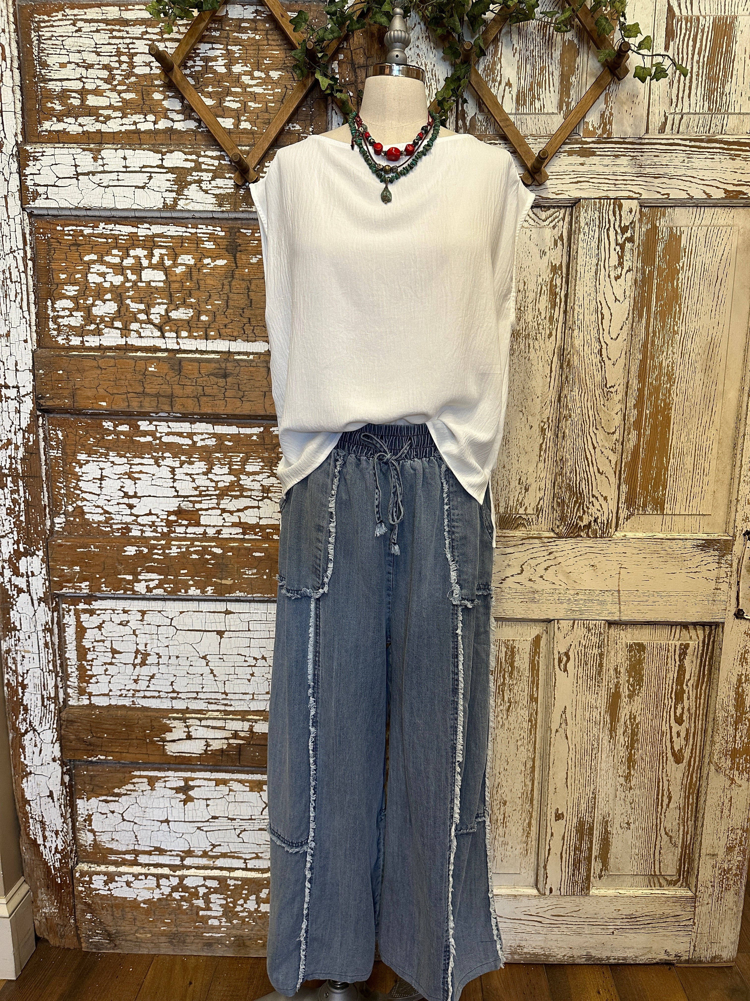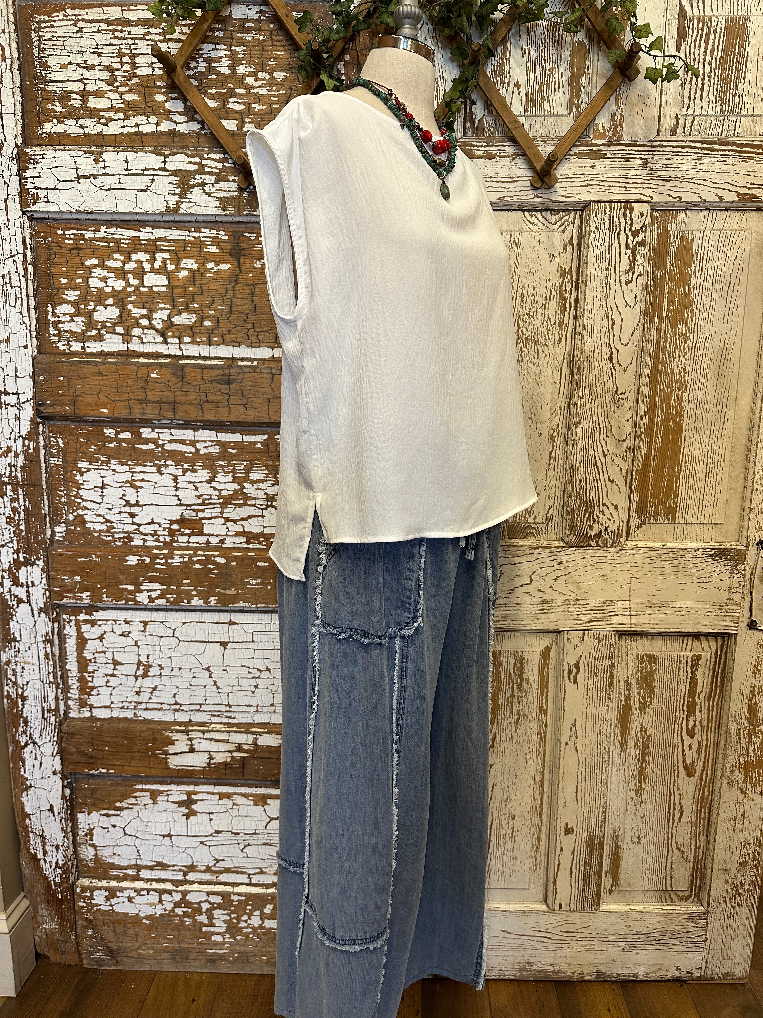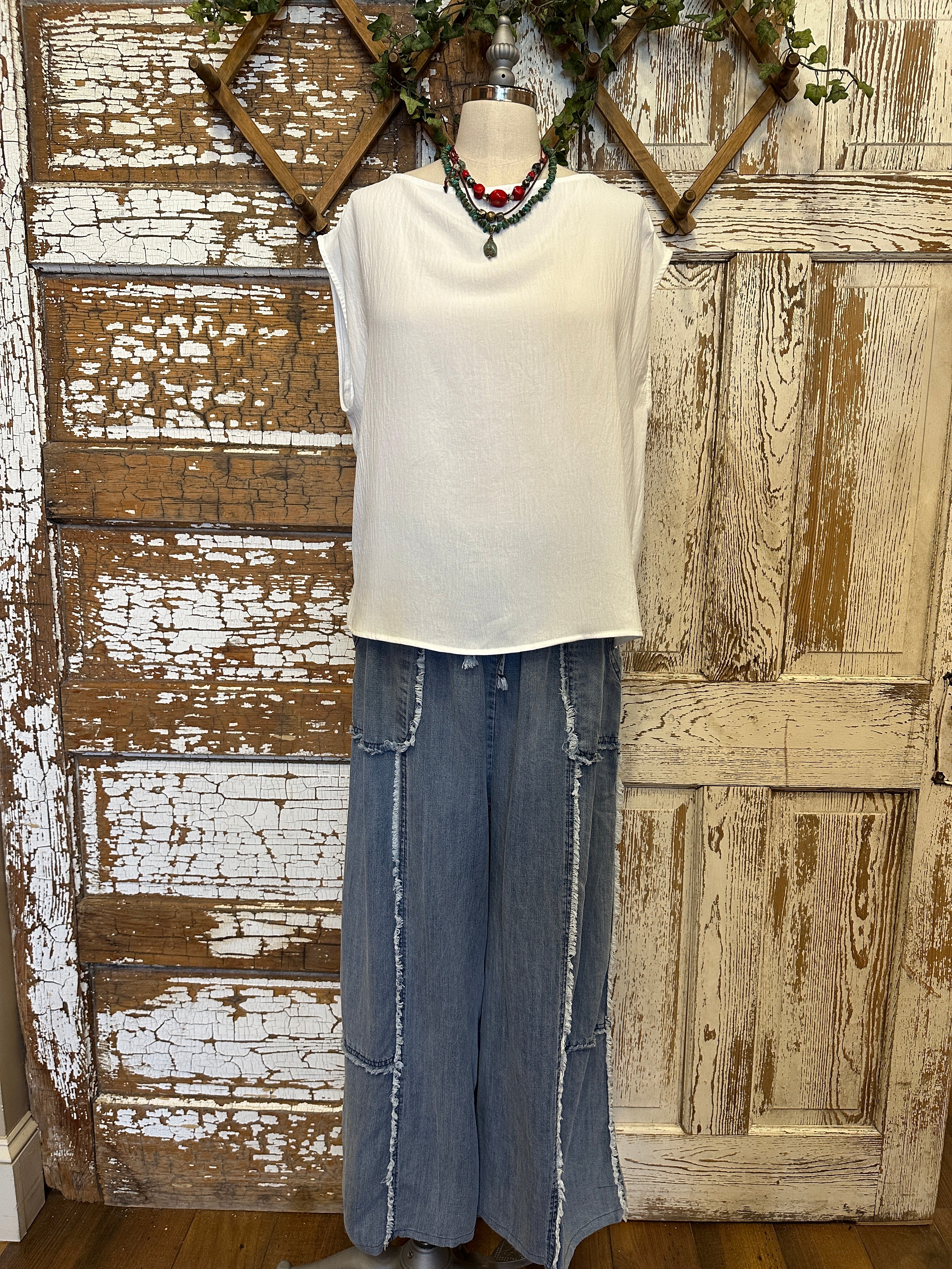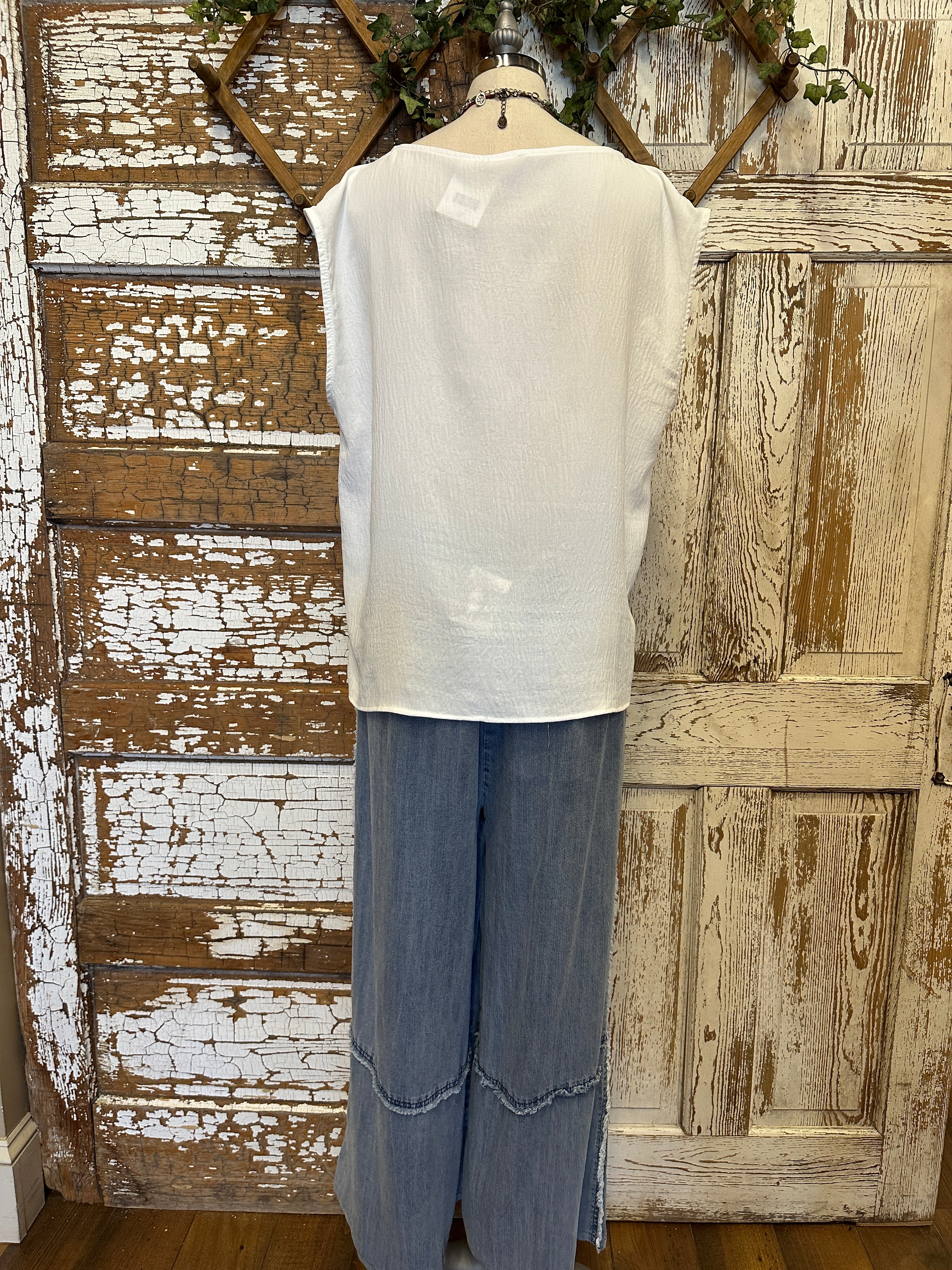 Add some fun and flair to your wardrobe with our White Crinkle Cap Sleeve Tank! With small side slits and a high/low hemline, this tank is perfect for any occasion. Go ahead, give yourself a playful update.