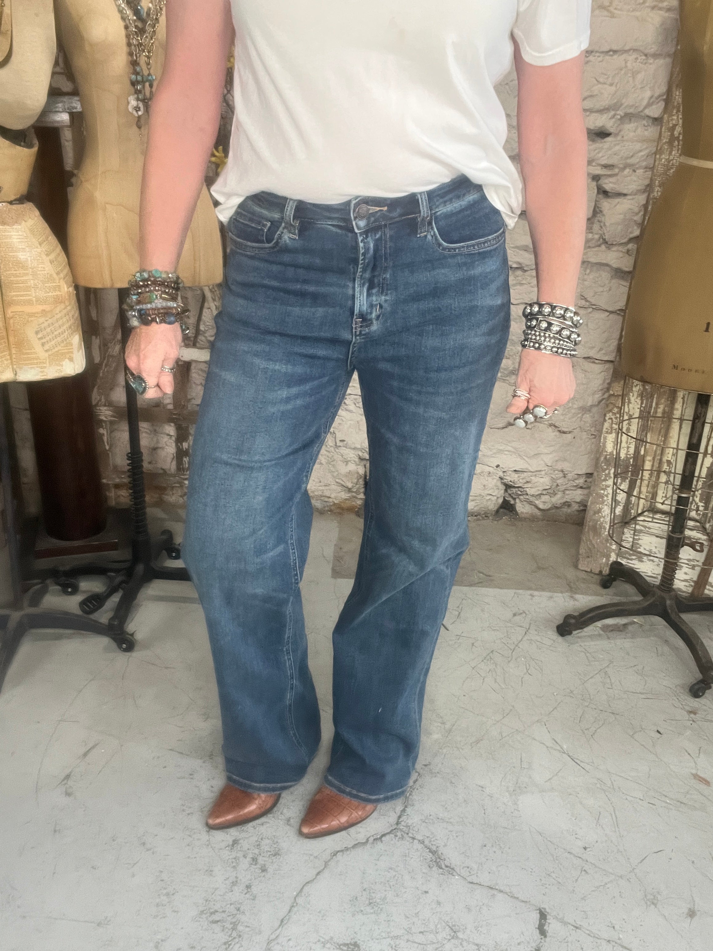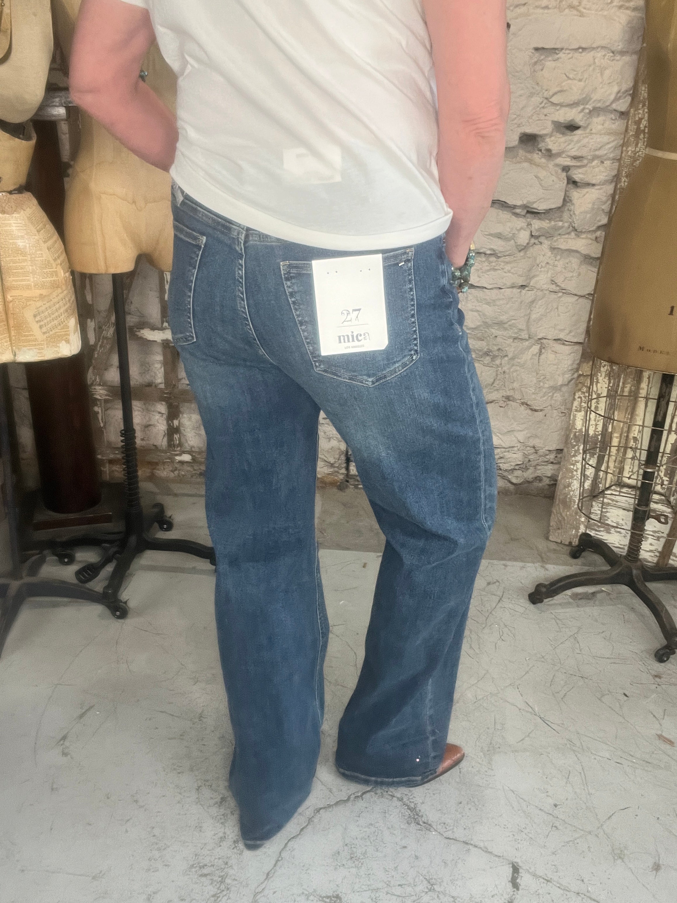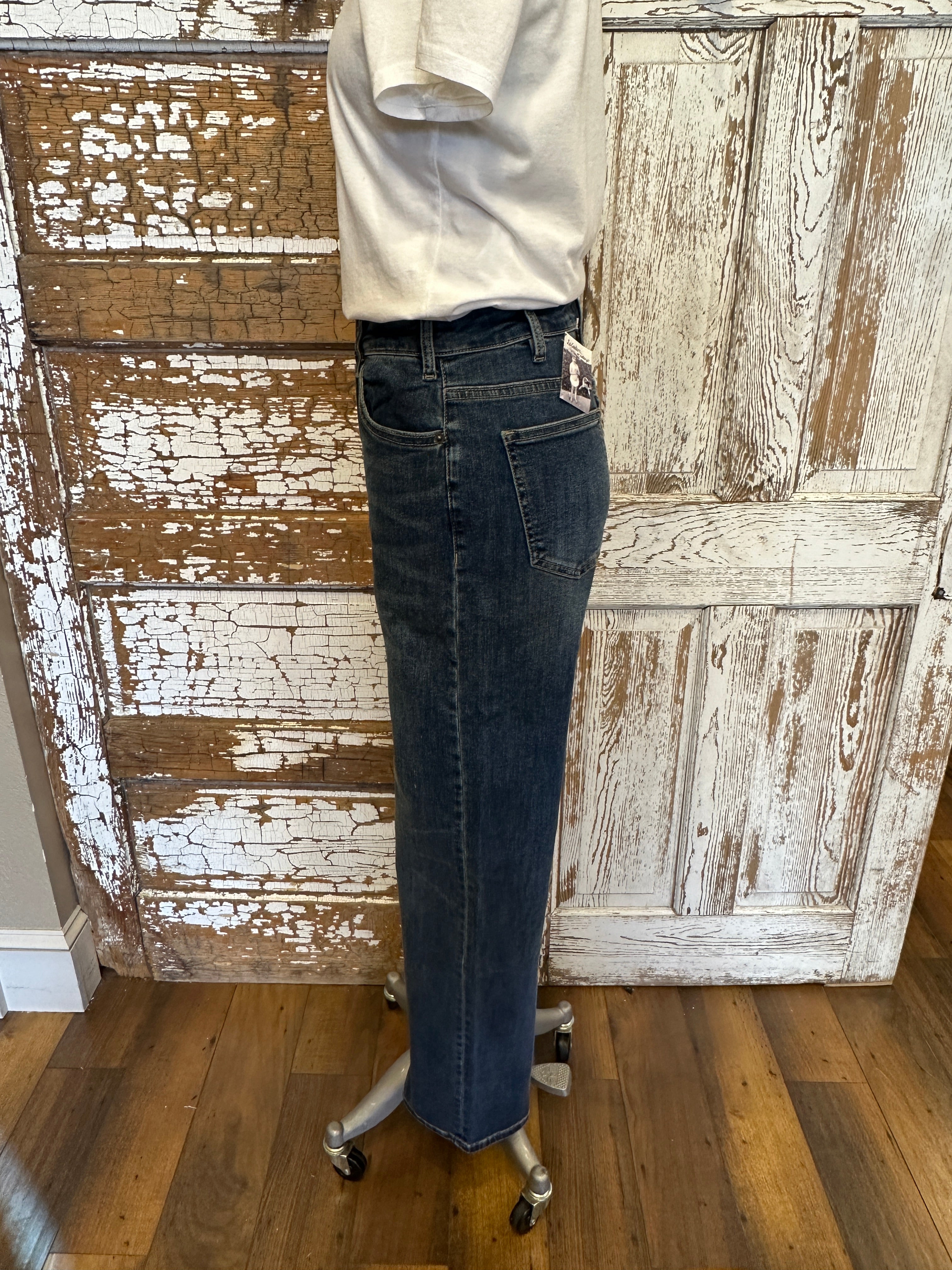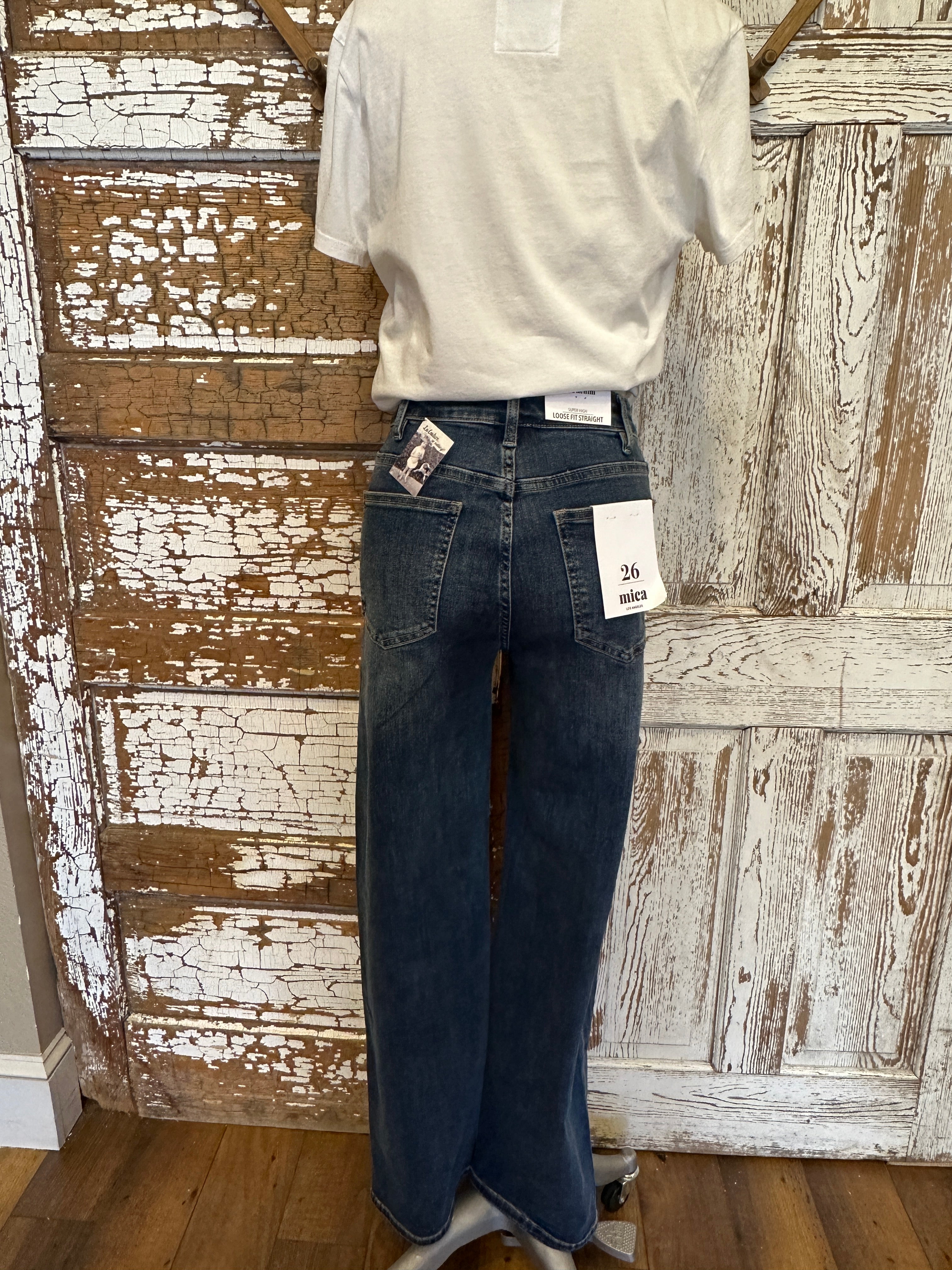 Introducing the Mica  High Straight Leg, high-waisted straight-leg jeans in a classic medium wash blue denim. These jeans offer a relaxed fit through the leg with a flattering high-rise waist and full length, making them perfect for pairing with boots or heels. Crafted from soft, durable denim with a slight stretch, they feature faded detailing for a vintage-inspired look.