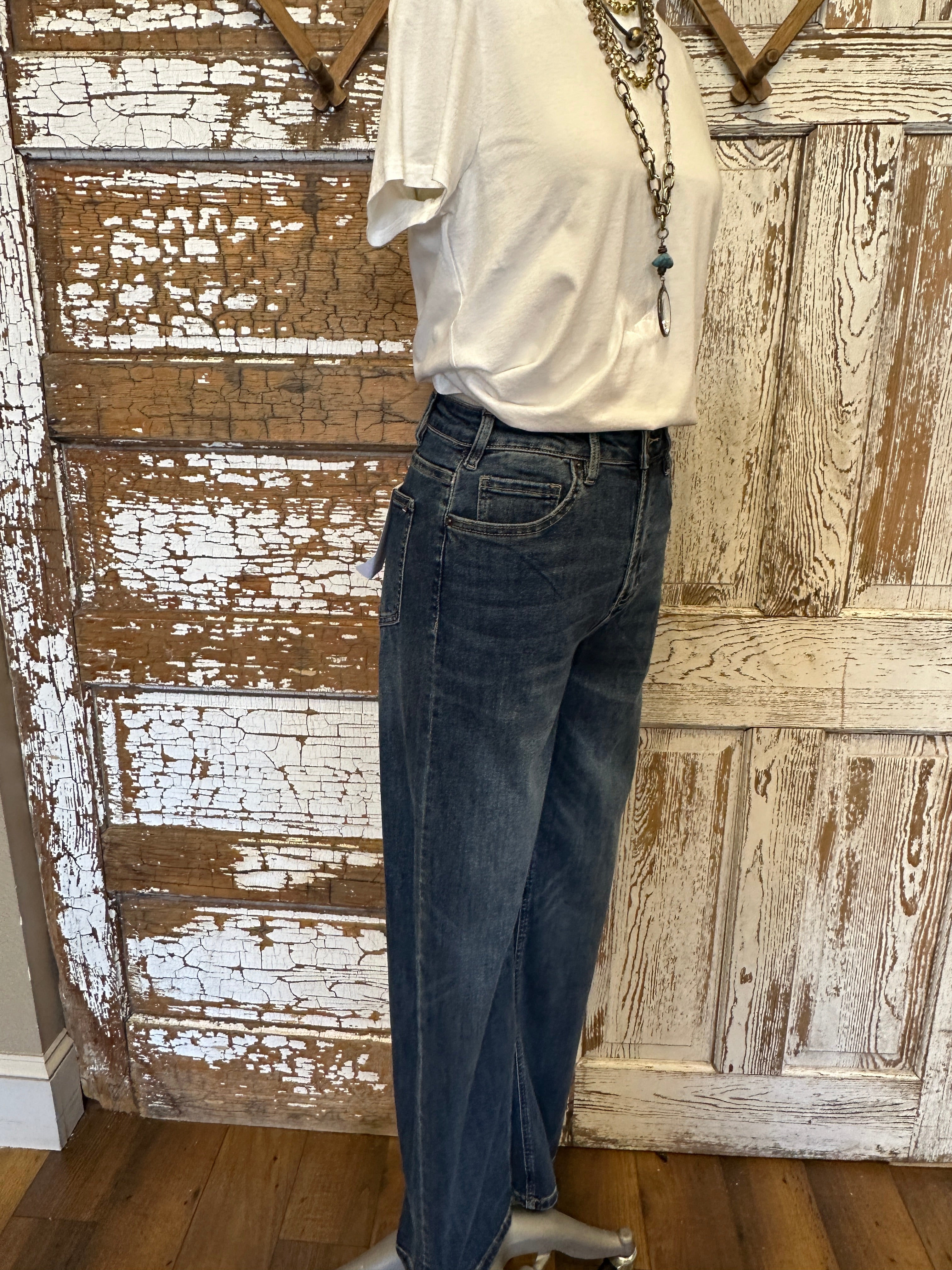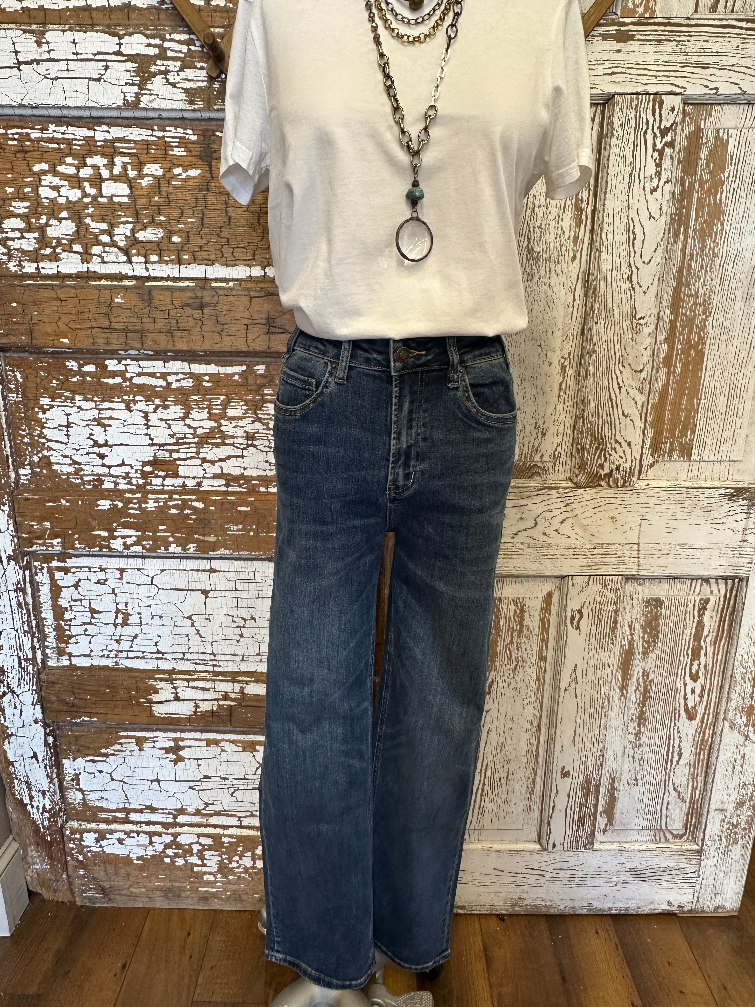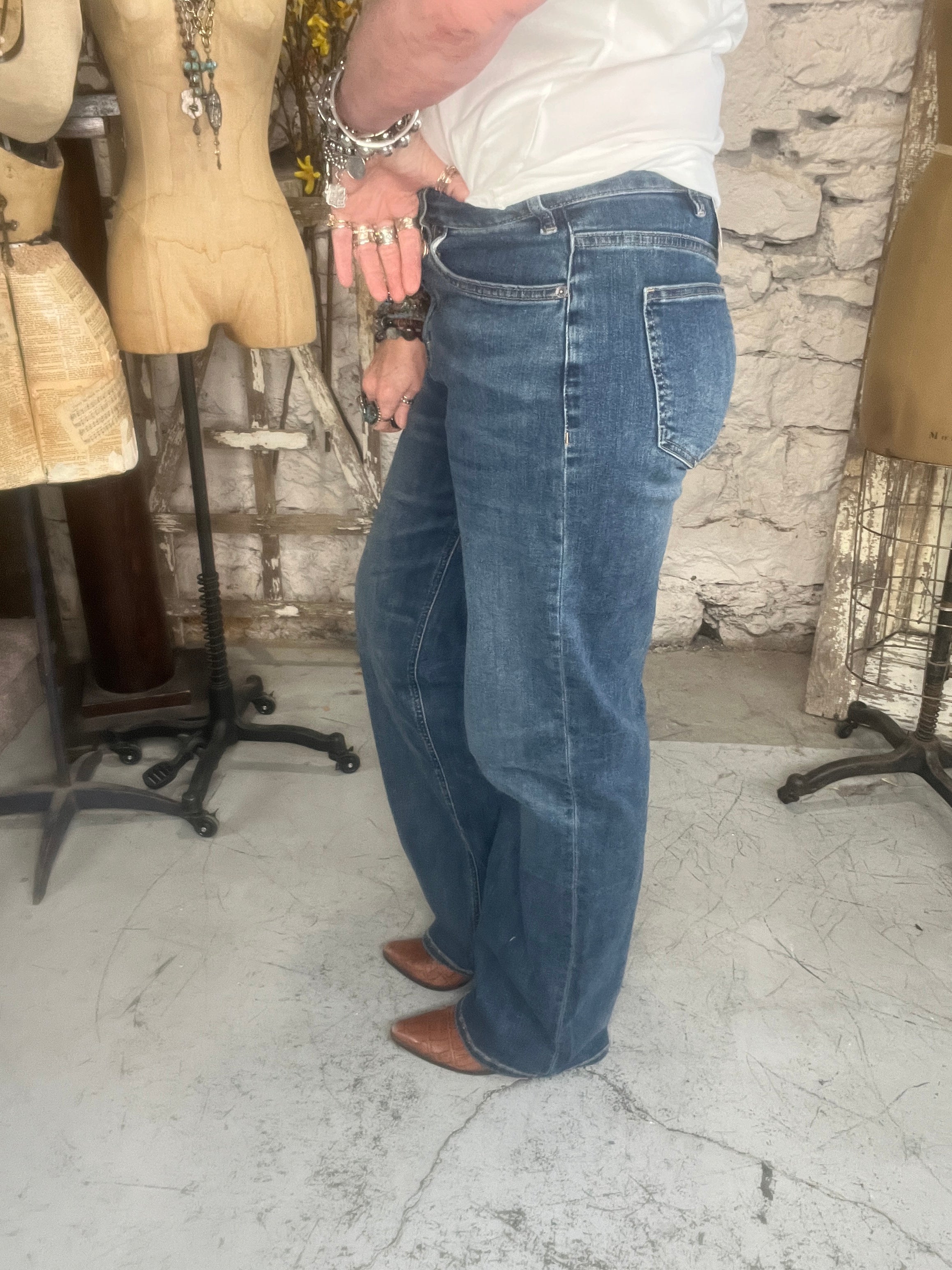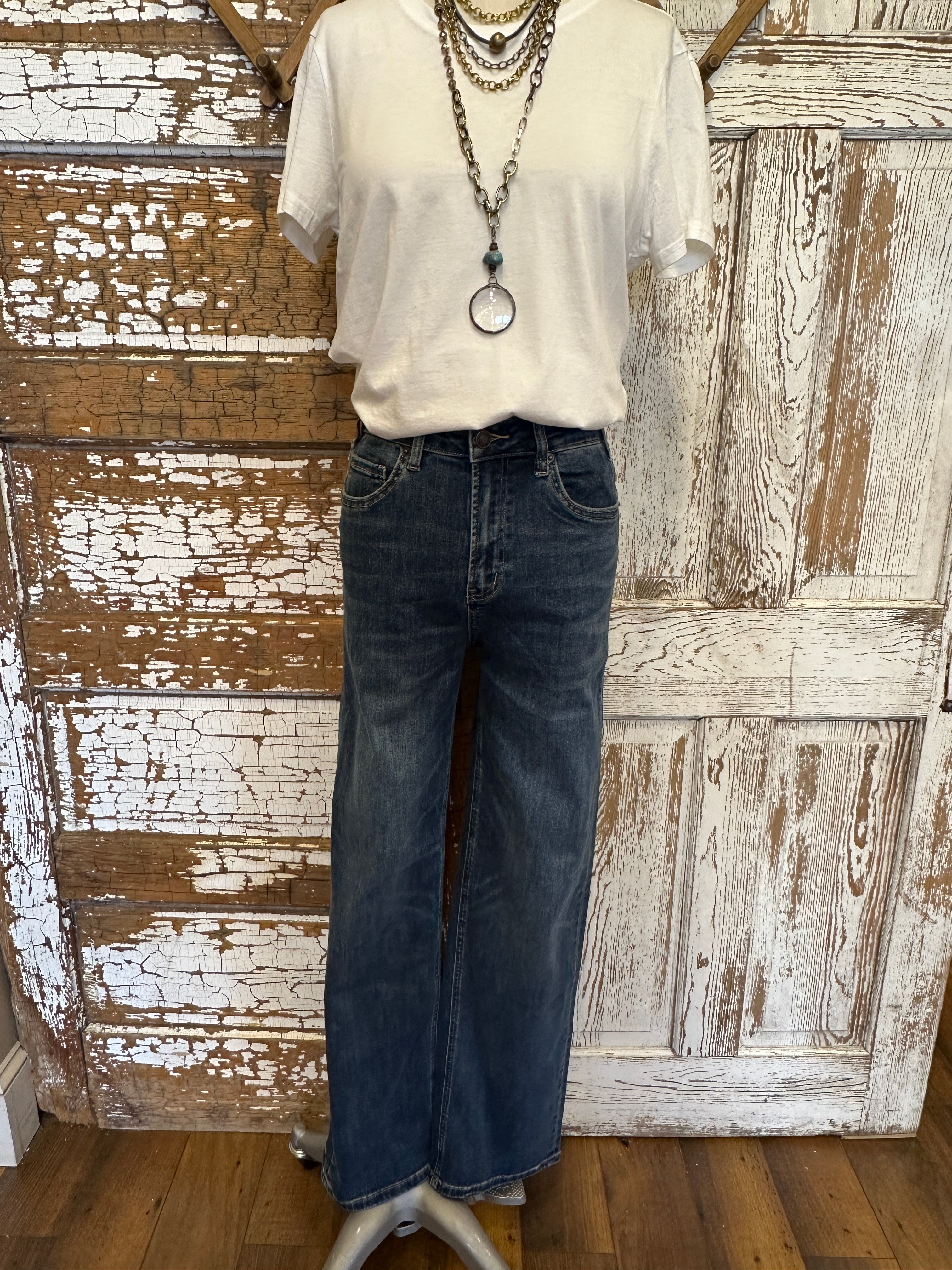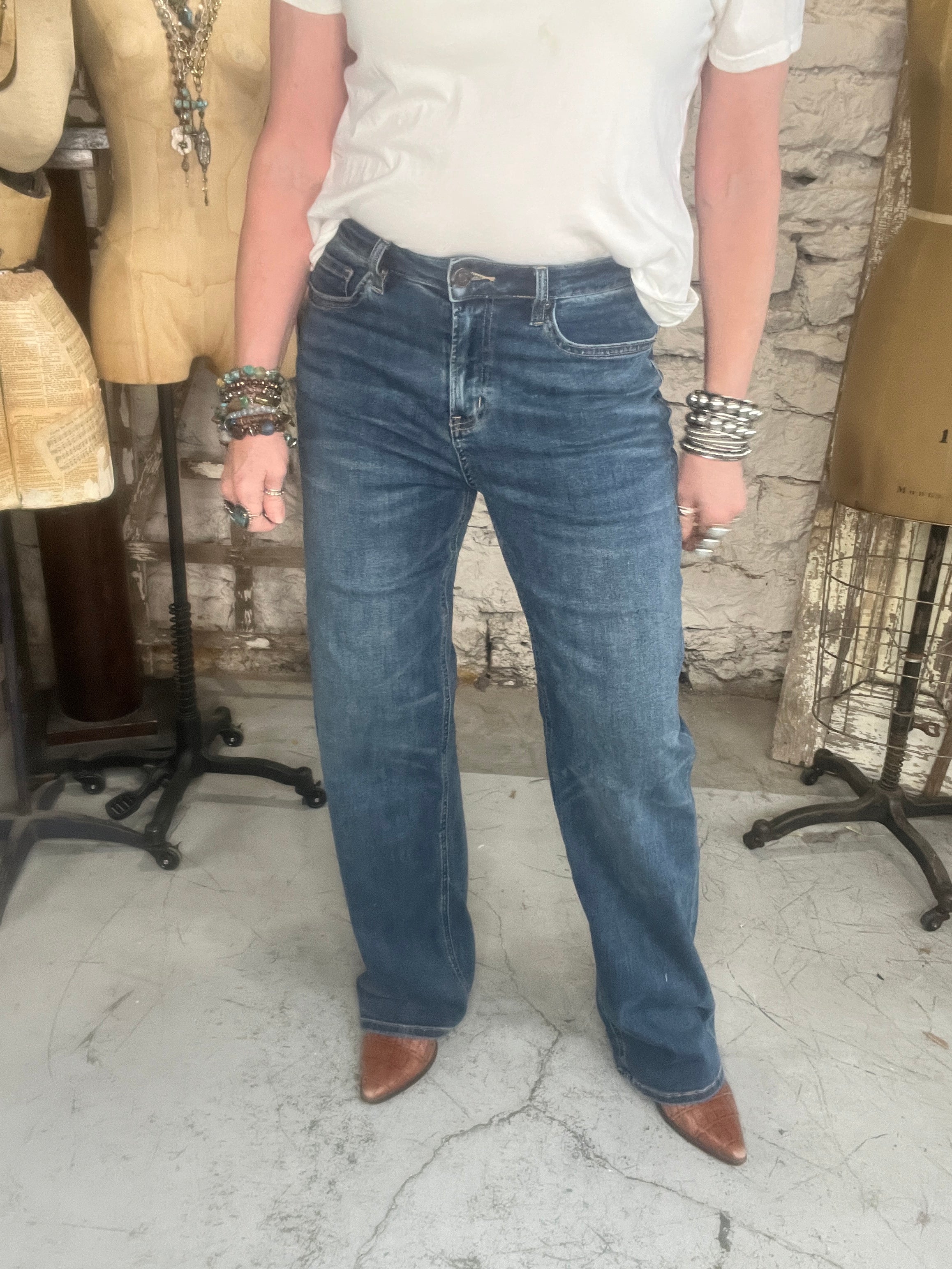 Introducing the Mica  High Straight Leg, high-waisted straight-leg jeans in a classic medium wash blue denim. These jeans offer a relaxed fit through the leg with a flattering high-rise waist and full length, making them perfect for pairing with boots or heels. Crafted from soft, durable denim with a slight stretch, they feature faded detailing for a vintage-inspired look.