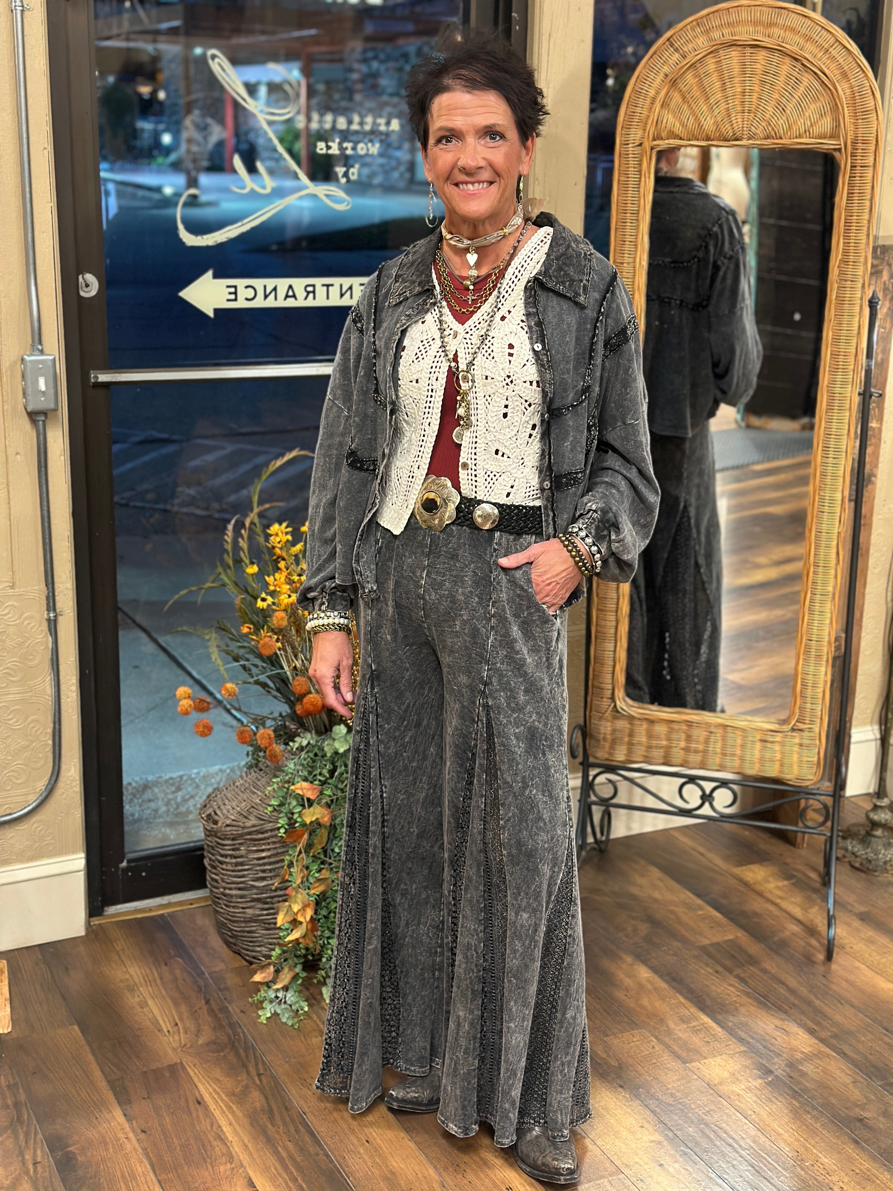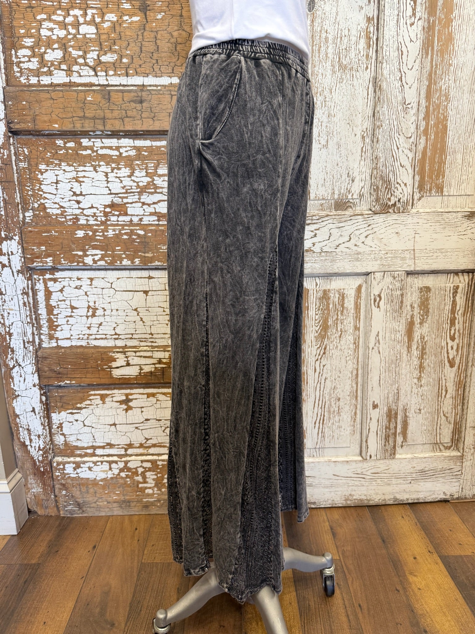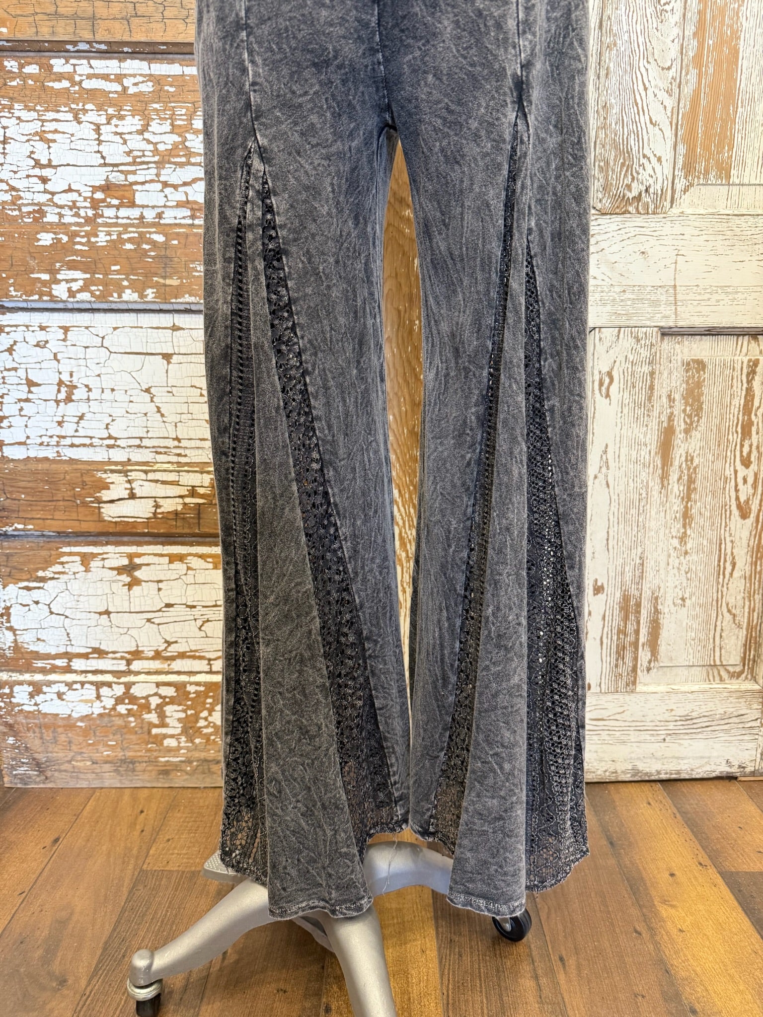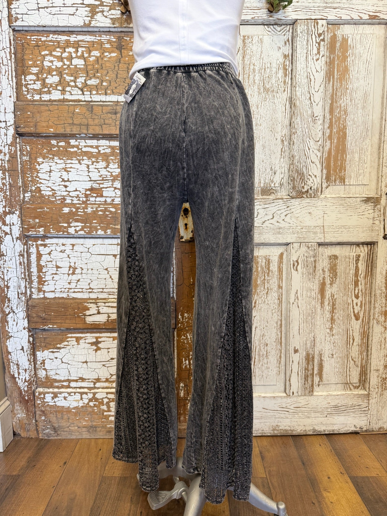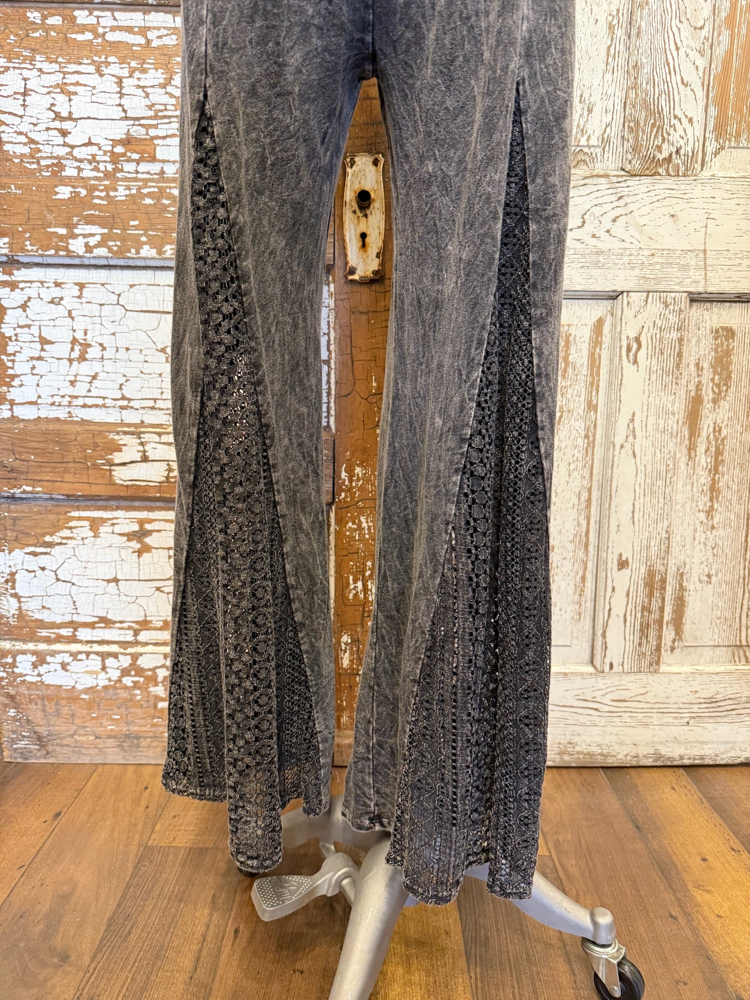 Elevate your boutique style with our Washed Black Eyelet Flare Pants, designed with a perfect blend of comfort, femininity, and artistic detail. Featuring a soft, washed black finish, these pants offer an elastic waistband for a relaxed fit, side pockets for functionality, and delicate lace and eyelet inserts that add a touch of boutique elegance. The subtle flare-leg silhouette creates a flattering shape while maintaining an effortless, laid-back vibe.