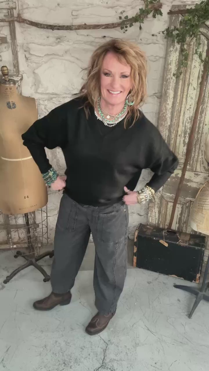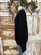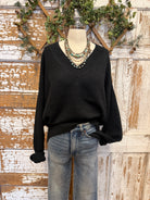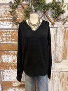 This timeless black sweater is the definition of effortless style. Designed with a flattering V-neckline and a relaxed, easy fit, it’s one of those pieces you’ll reach for again and again. The soft knit drapes beautifully, making it perfect for a casual front tuck or wearing loose for an easy, laid-back look.