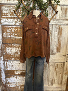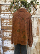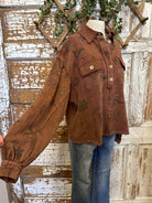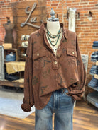 Earthy tones and vintage charm meet in our Rust Meadow Floral Button Down. This soft mineral washed top features a relaxed, lived in feel with muted floral details throughout, creating the perfect blend of rustic and feminine. With button front styling, chest pockets, and raw edged seams, this piece layers effortlessly over tanks or tees for that signature boutique look.