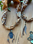 Embrace a touch of free-spirited elegance with our Bohemian Tan Paisley Bandana. This versatile accessory seamlessly blends classic bandana charm with a sophisticated bohemian aesthetic, making it an essential addition to your wardrobe. Crafted from soft, lightweight fabric, its rich tan hue is adorned with an intricate white and black paisley and star pattern that exudes timeless appeal. Designed for multifaceted styling, this bandana is more than just a hair accessory. Wear it as a chic headband to keep your locks stylishly in place, tie it around your neck for a classic Western or festival vibe, or wrap it around your wrist as a unique bracelet. Each bandana is thoughtfully accented with delicate gold-tone beads and a shimmering clear crystal charm, adding a hint of sparkle and a personalized touch to your look. Perfect for elevating everyday outfits or completing a special occasion ensemble, this bandana offers endless possibilities for creative expression. Whether you're heading to a music festival, a casual brunch, or simply want to add a unique flair to your daily style, our Tan Paisley Bandana is your go-to accessory for effortless bohemian chic.