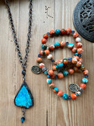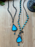 This beautiful and unique Bejeweled Gems Soldered Pendant offers marbled blue agate with an irregular hand soldered stone design. Measuring in at approximately 3" in size, the piece is completed with a beautiful cats eye stone dangle to finish. Each pendant is one-of-a-kind, adding to its uniqueness.