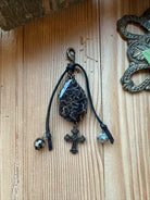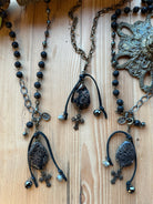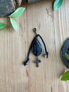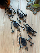 The Black Ice Fossil Stone Pendant is made with each unique fossil stone showcasing its own shades of black, tan, and brown. Soft black leather and antique brass cross finish off this beautiful pendant. Comes with a lobster so you can attach to any Lu interchangeable necklaces or chain.