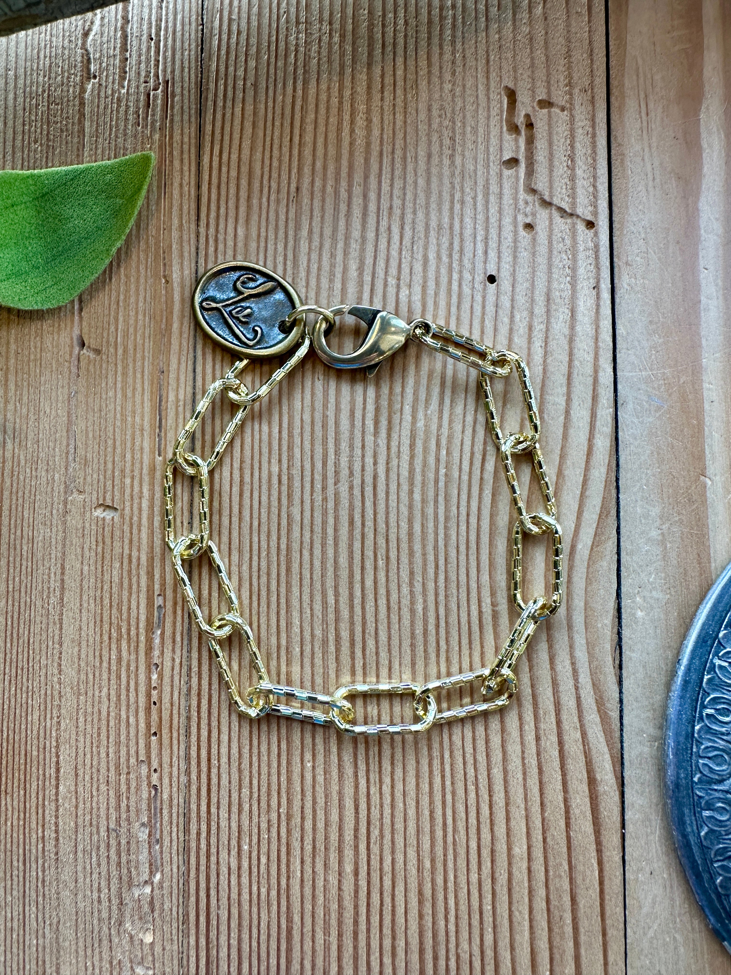 Add some shine to your outfit with our Bright Gold Chain Bracelet featuring a textured chain and finished with a Lu tag. The perfect piece for those who want to add a touch of fun and style to their look.