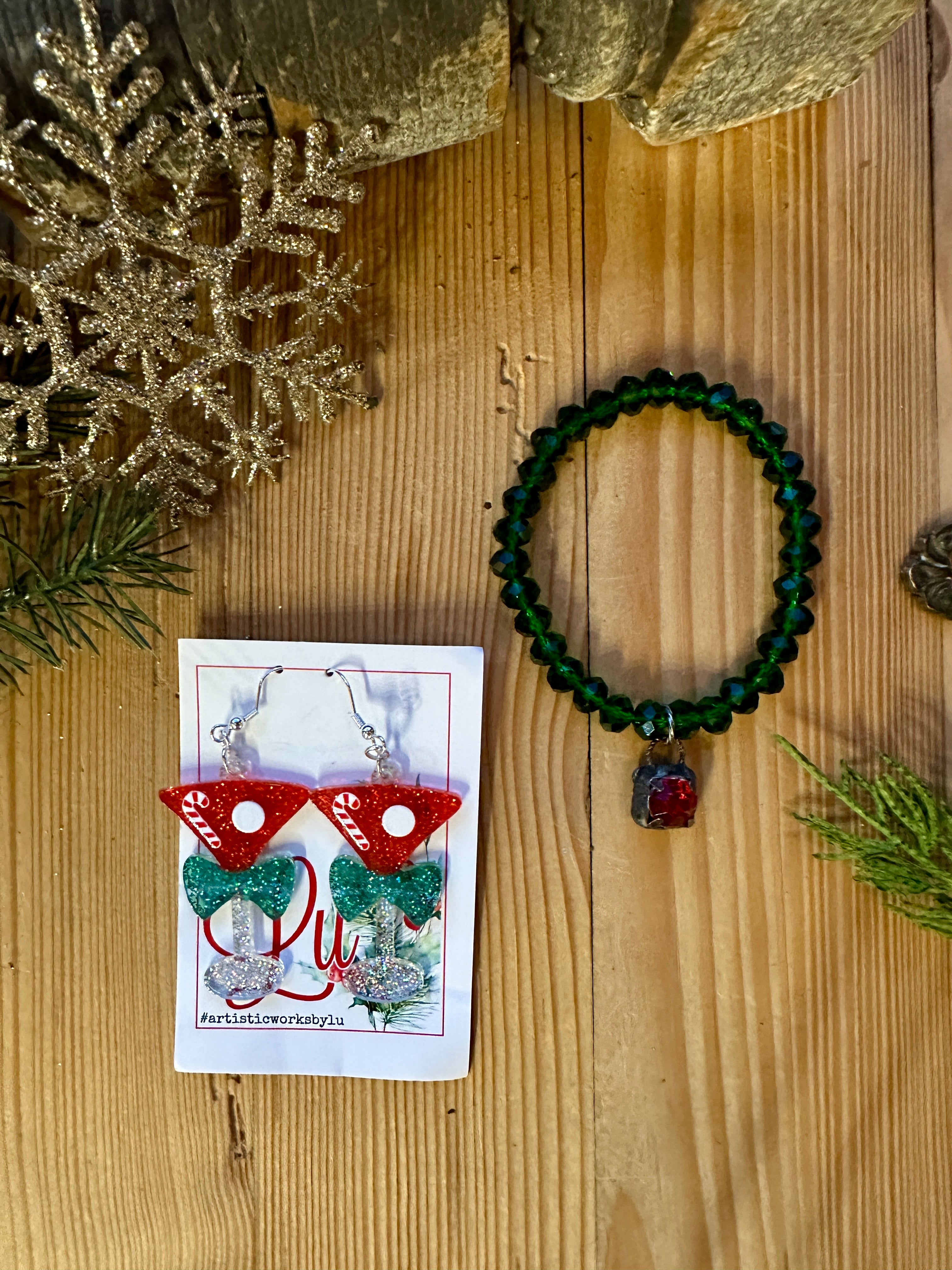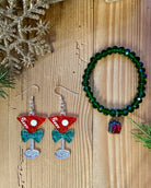 Celebrate the season with our Cheers to the Holidays Gift Set. Adorn yourself with sparkly martini glass earrings and a green stretchy bracelet featuring a hand soldered red crystal. Perfect for adding a touch of festive flair to any outfit.
