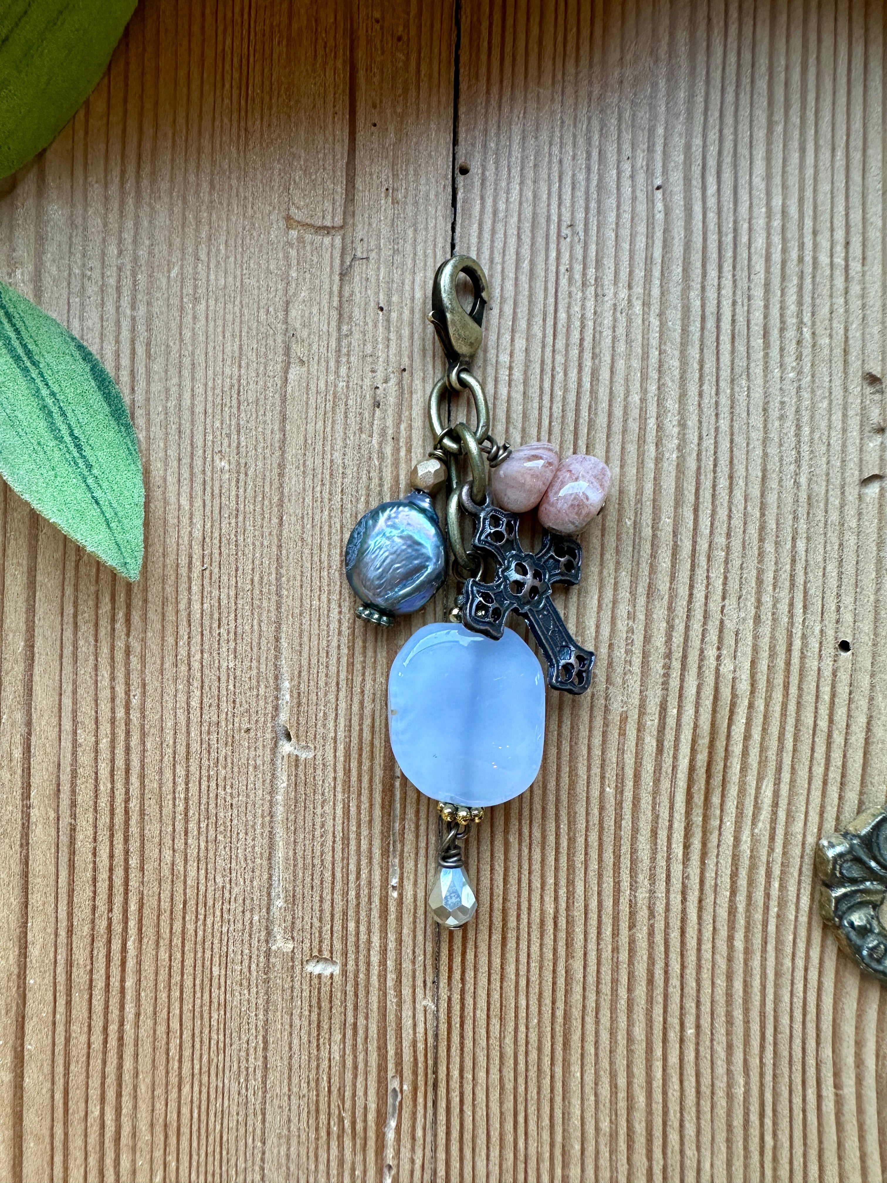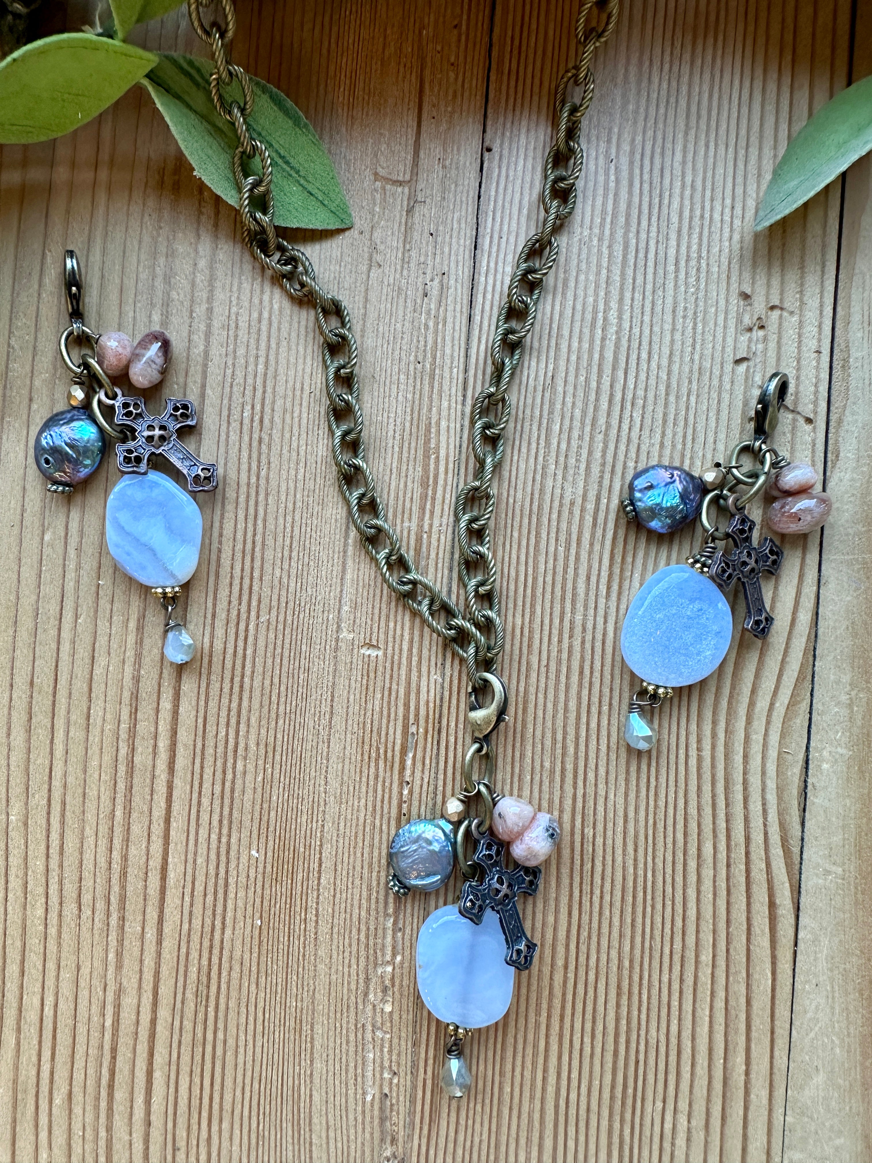 The Deja Blue Pendant Dangle showcases a stunning blue lace agate, beautifully accented by a copper cross and pink opal and mother of pearl beads. This unique piece will add a touch of elegance to any outfit and be the perfect addition to your jewelry collection.