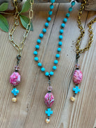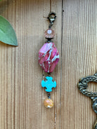 This Earthy Brights Pendant features a chunky pink marbled agate stone, accented with faceted sparkly beads in pink and orange and a turquoise colored cross. The natural beauty of the agate combined with the colorful and vibrant accents create a unique and eye-catching piece.