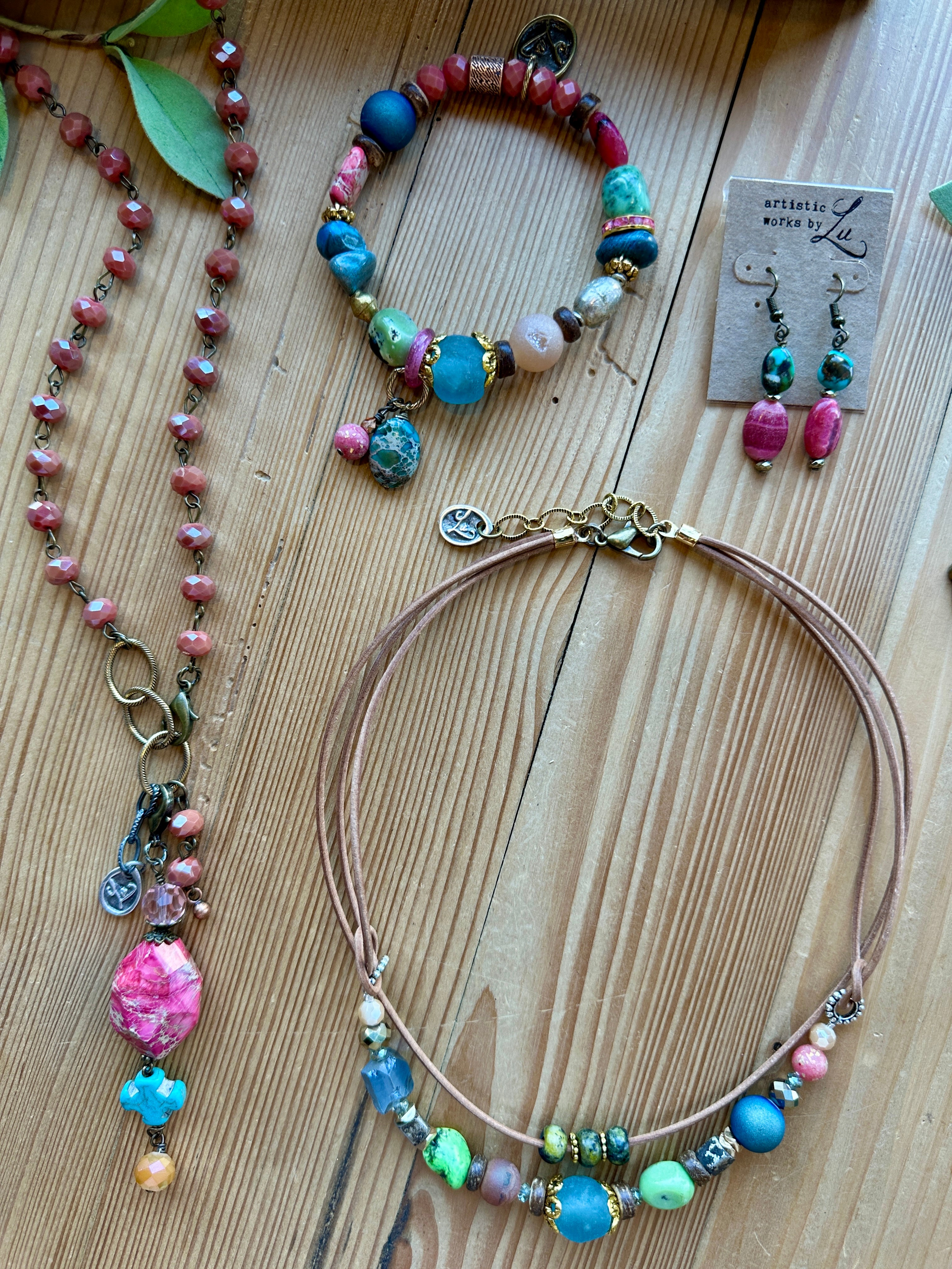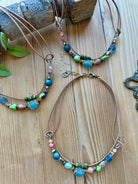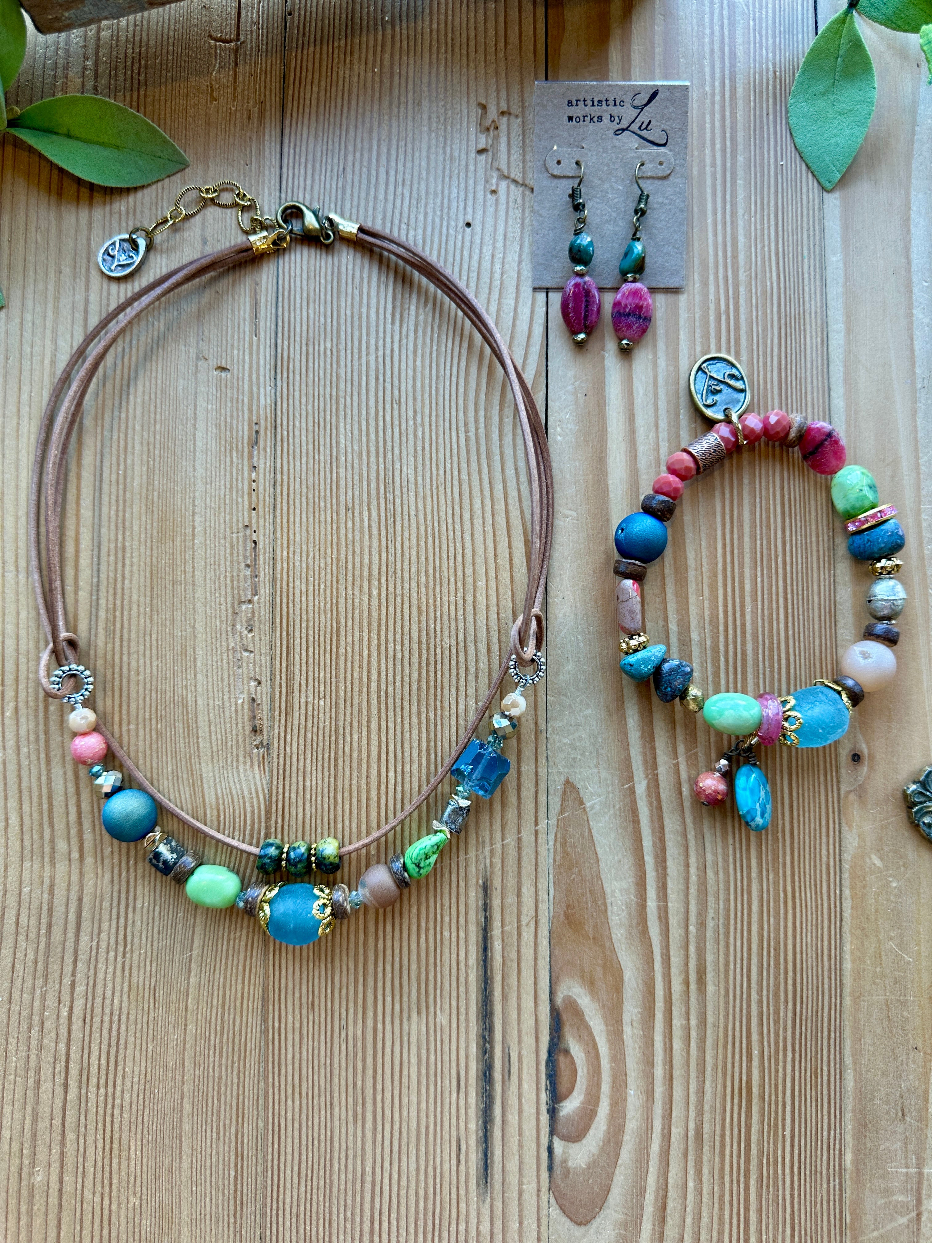 Discover the perfect blend of earthy and bright with our Short Double Necklace. Featuring a stunning blue African glass bead and a mix of natural elements like wood, peach druzy agate, and speckled jade, all finished off with a tan leather touch. Elevate your style with this unique and versatile accessory.