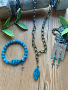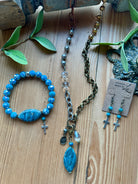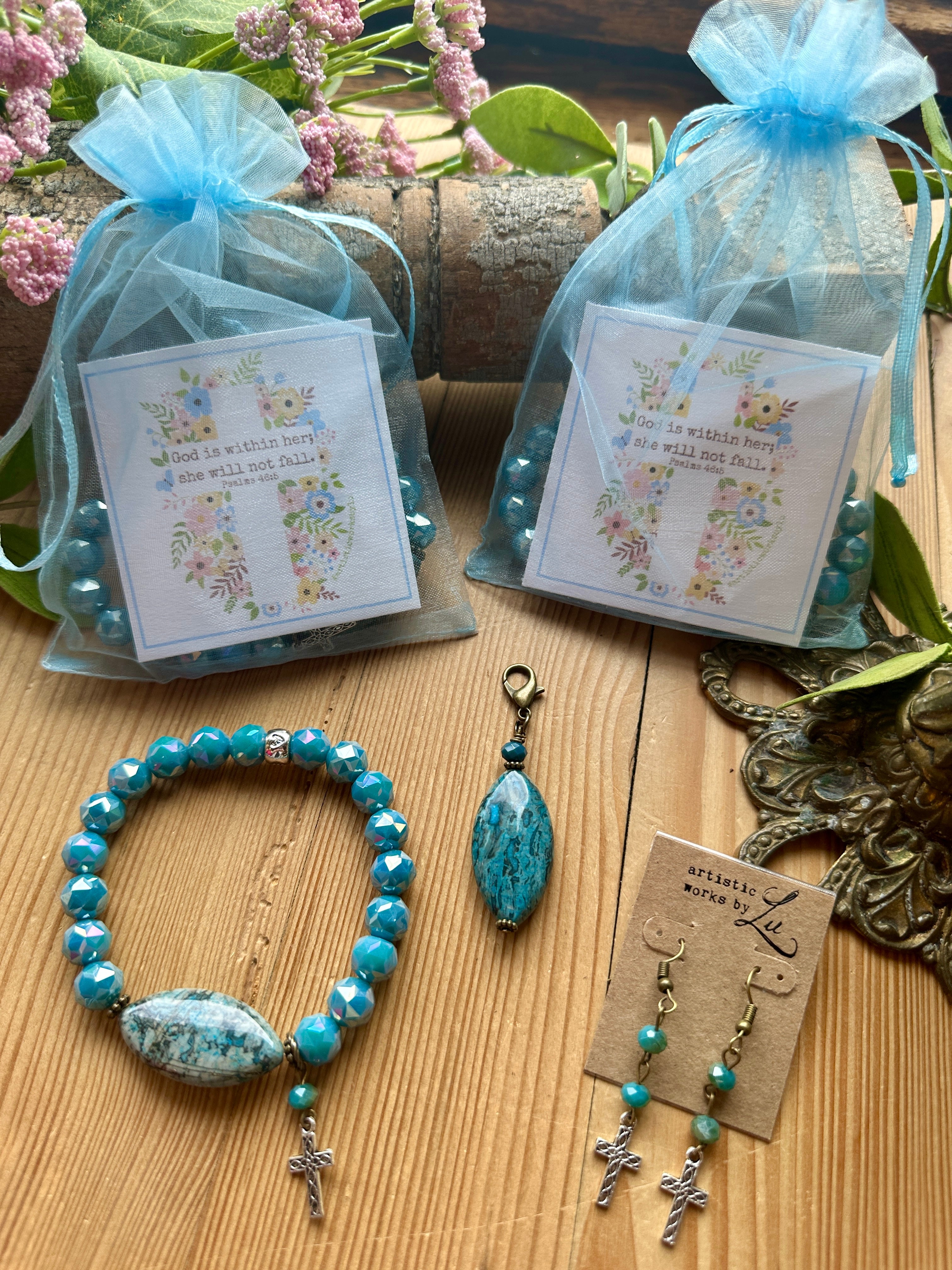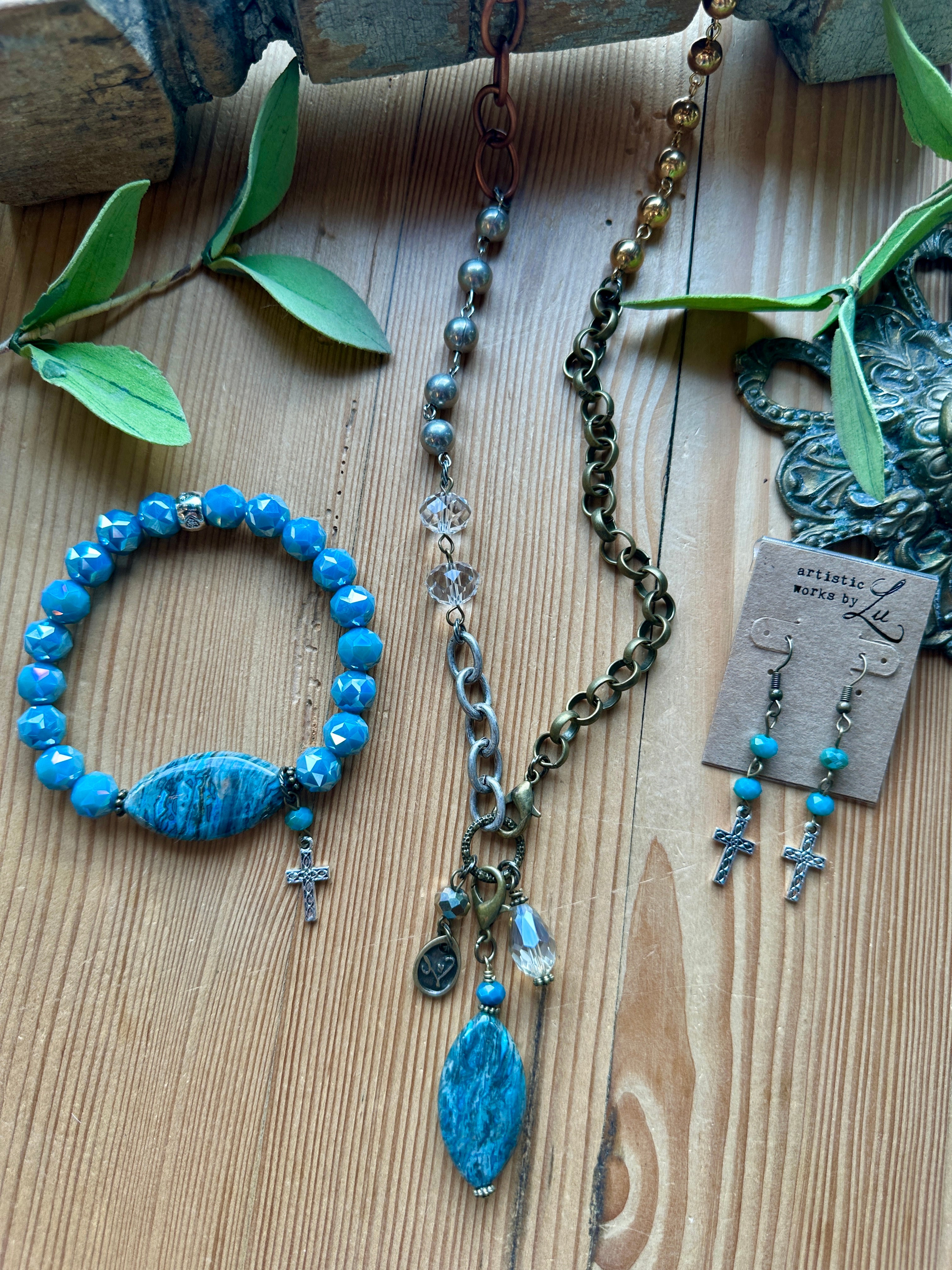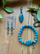 Transform your outfit with our elegant Easter Jewelry Gift Set! This set includes a marbled blue agate pendant, a sparkling blue beaded bracelet with a silver cross, and silver cross earrings adorned with blue rosary link beads. Elevate your style for any occasion with this stunning set...the perfect addition to your Easter outfit or in a loved ones Easter basket.