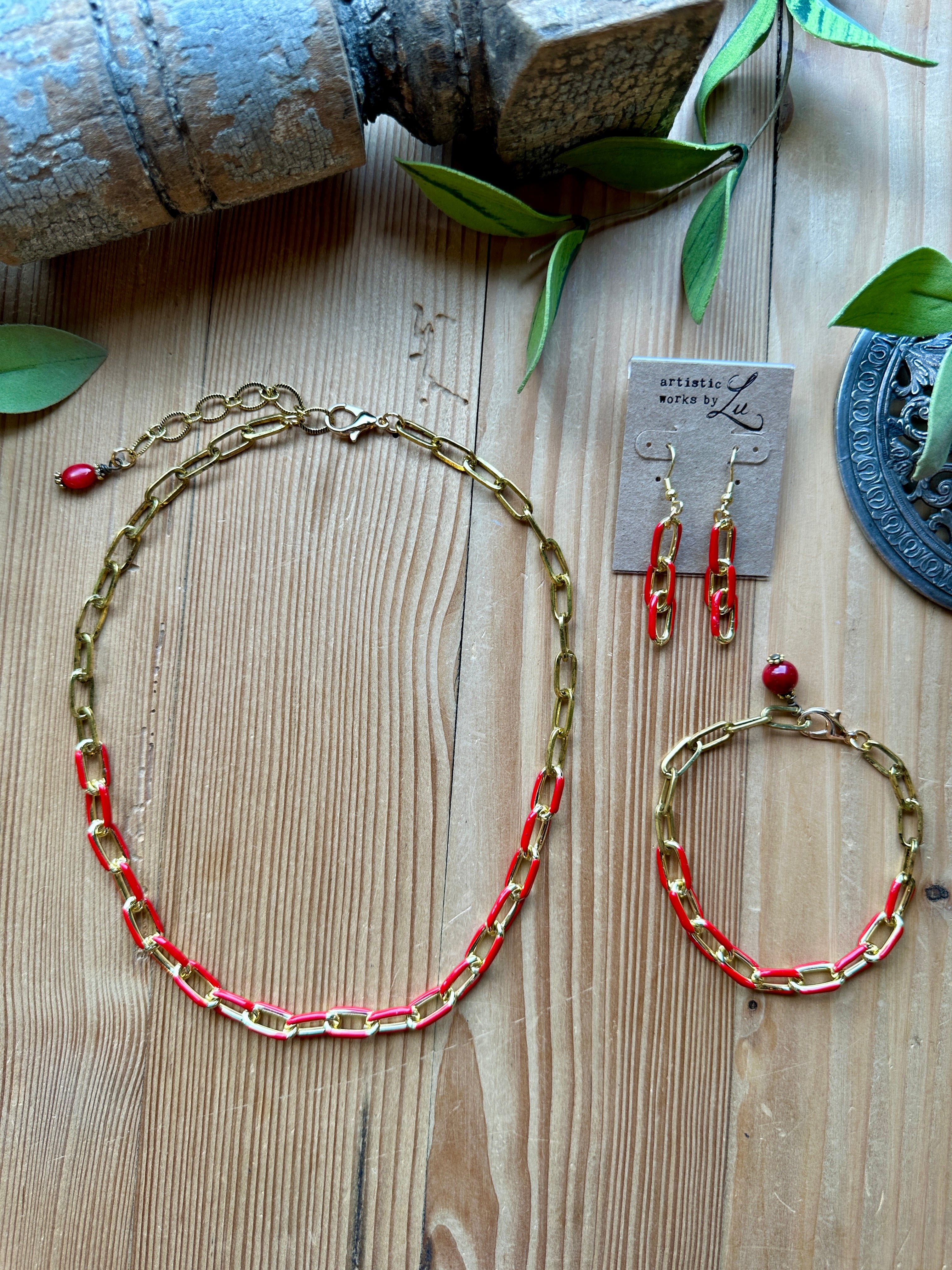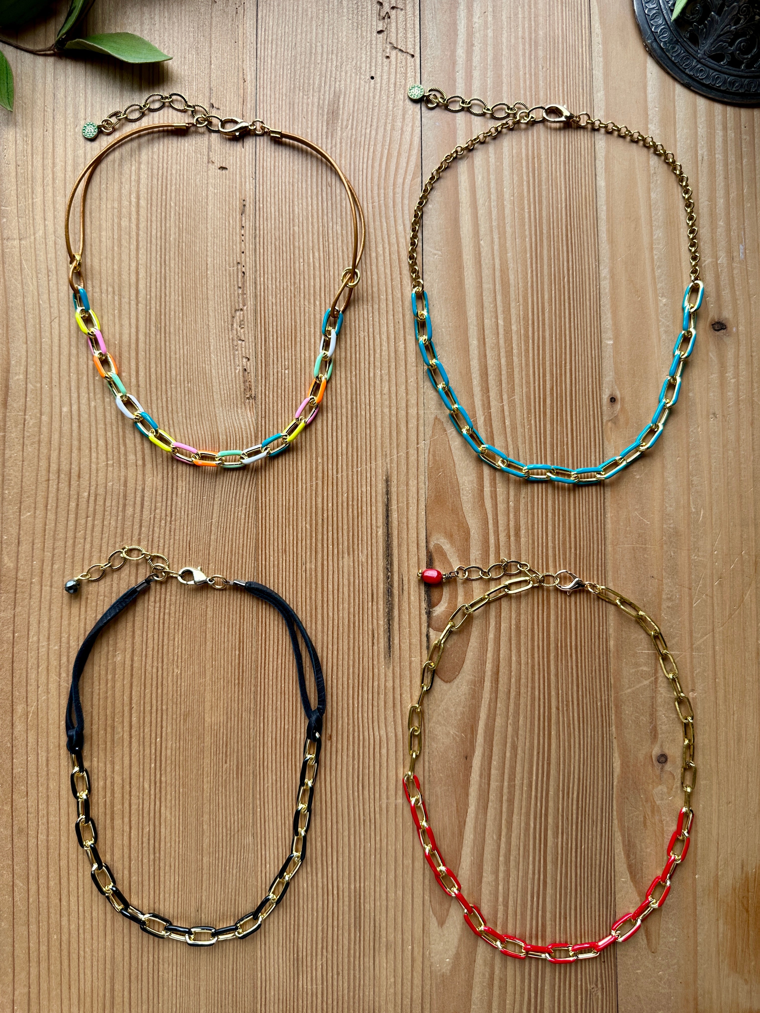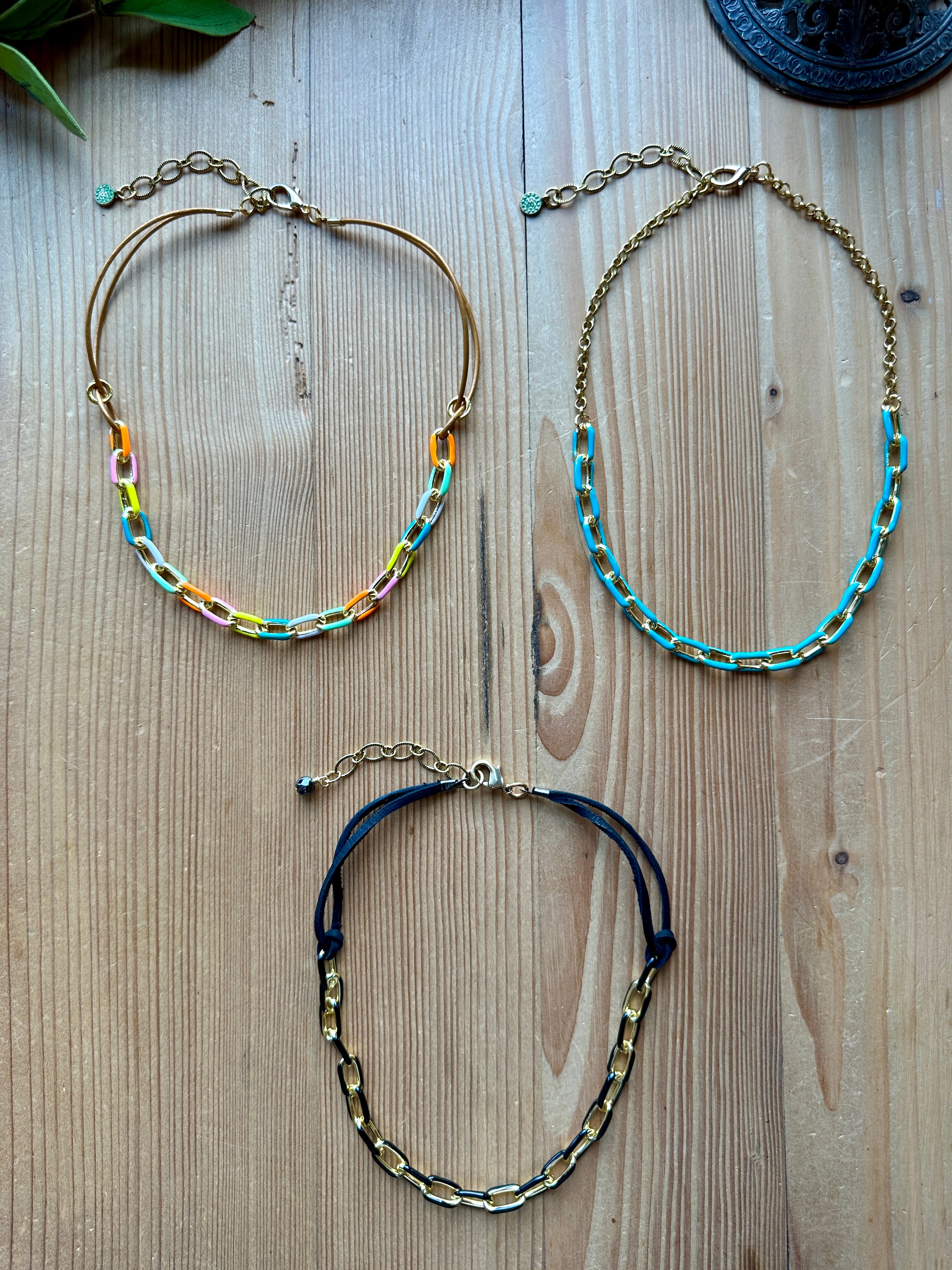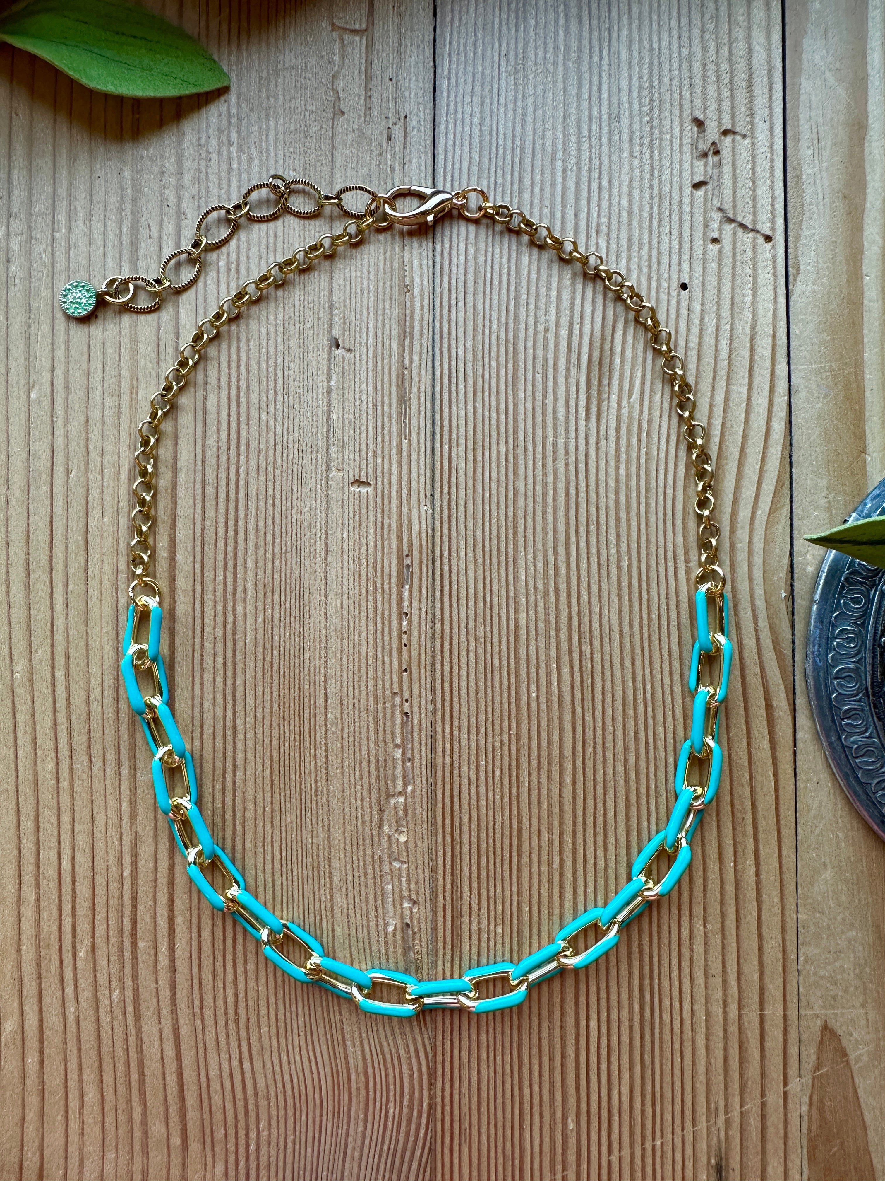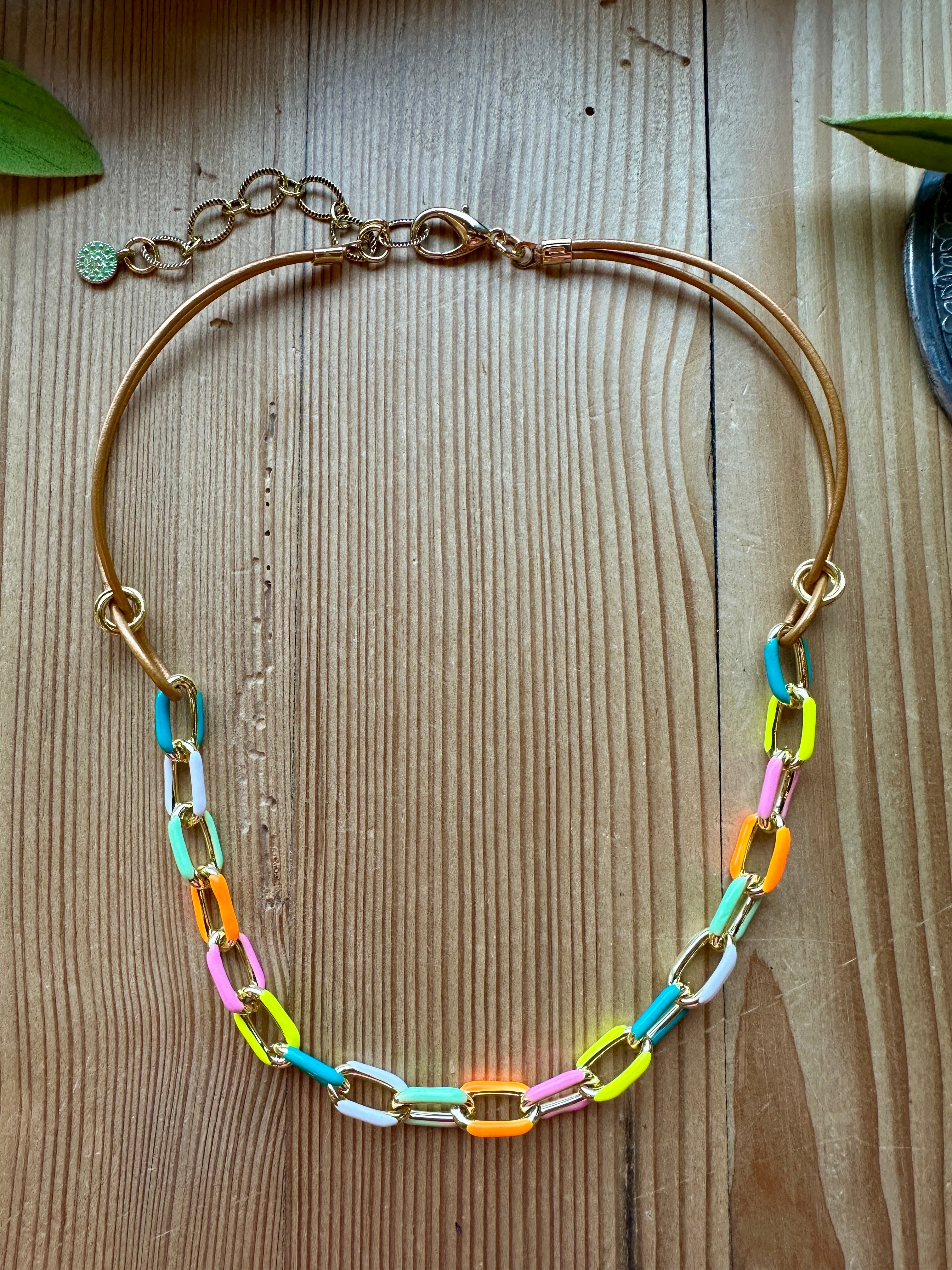 Make a statement with our Fun Paperclip Chain Necklace! Featuring a bright gold enamel coated chain, this necklace is available in four vibrant colors. The red, black, and the turquoise colors are finished with a bright gold chain, while the tropical color boasts a unique gold-colored leather finish. Perfect for adding a bold touch to any outfit. Adventure awaits!