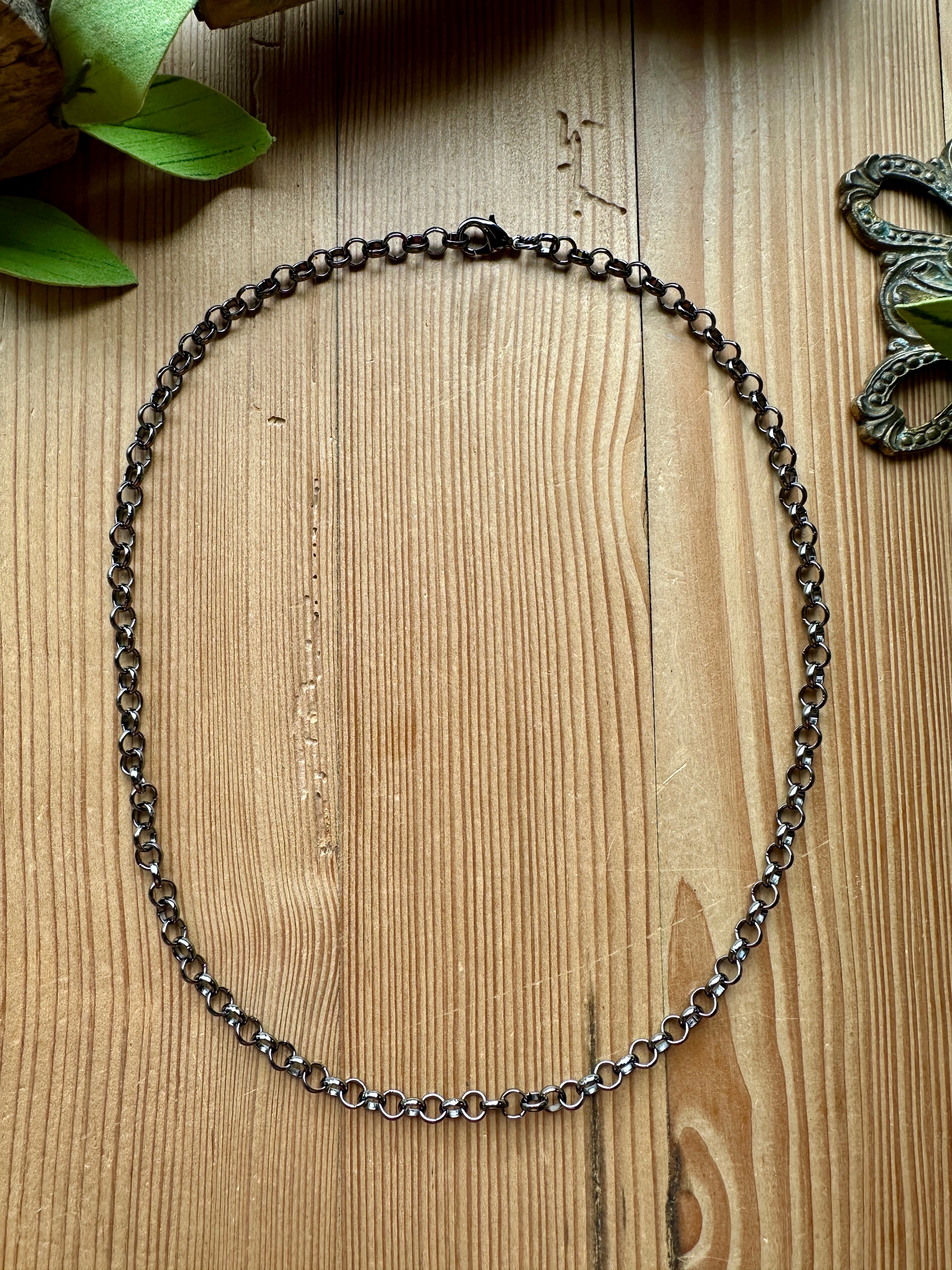 Discover the sleek and versatile Gun Metal Silver Layering Chain. Each chain link is made from durable gun metal silver, perfect for any occasion. Wear this chain alone for a minimalist look or add your favorite Lu pendant for a personalized touch. Elevate any outfit with this essential piece.