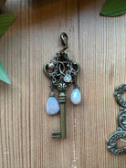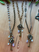 Unlock a touch of vintage charm with this beautifully detailed key pendant necklace. Featuring an antique-style key adorned with delicate chains, shimmering crystals, and soft neutral-toned beads, this piece blends old-world elegance with modern artisan design. A meaningful accessory that symbolizes opportunity, love, and new beginnings.