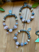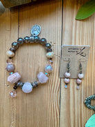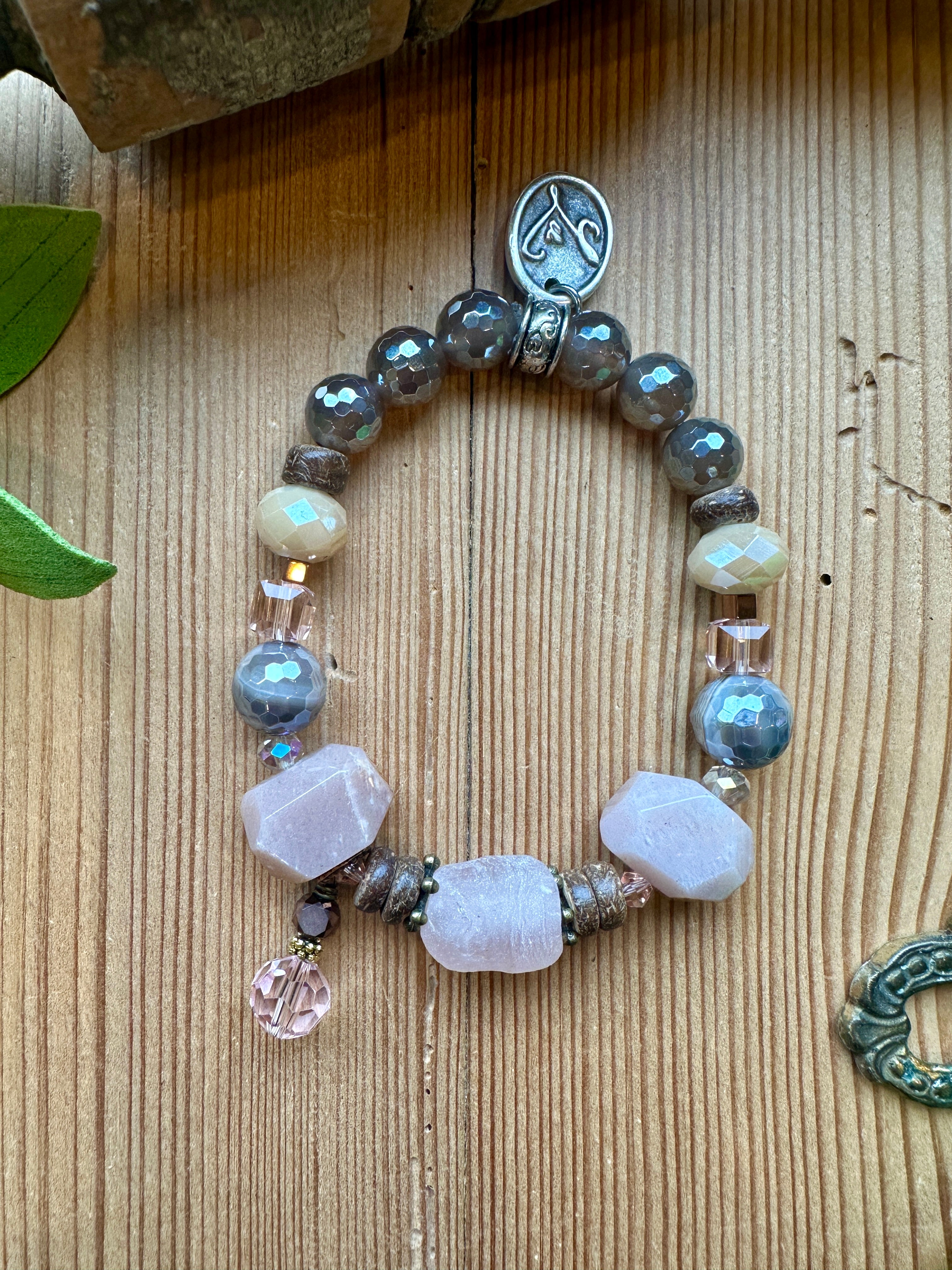 Soft blush tones and natural textures come together in this handcrafted stretch bracelet from Lu’s Moon Blush jewelry collection. Featuring a beautiful mix of pink moonstone, pink sandstone, natural wood beads, and shimmering pink crystals, this bracelet offers an easy, comfortable fit with an effortlessly romantic feel. Perfect for stacking or wearing alone, it’s a versatile piece designed for everyday elegance.