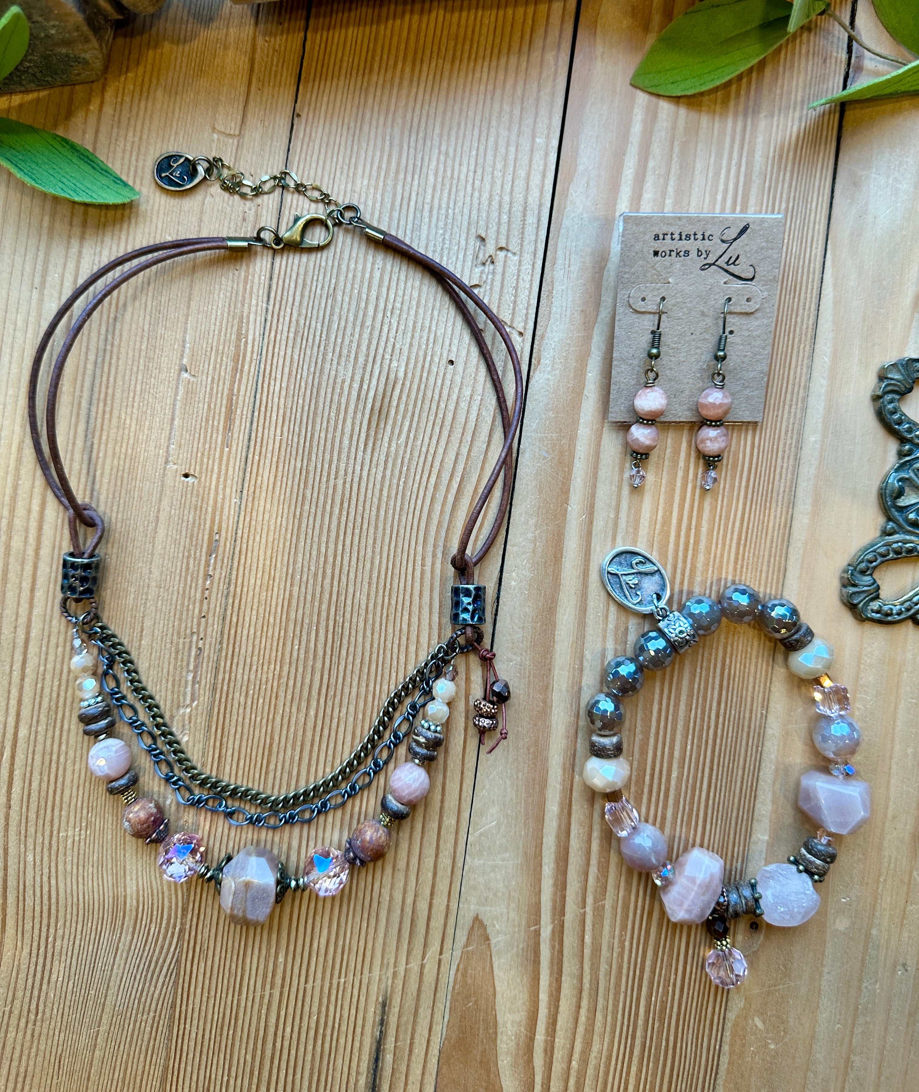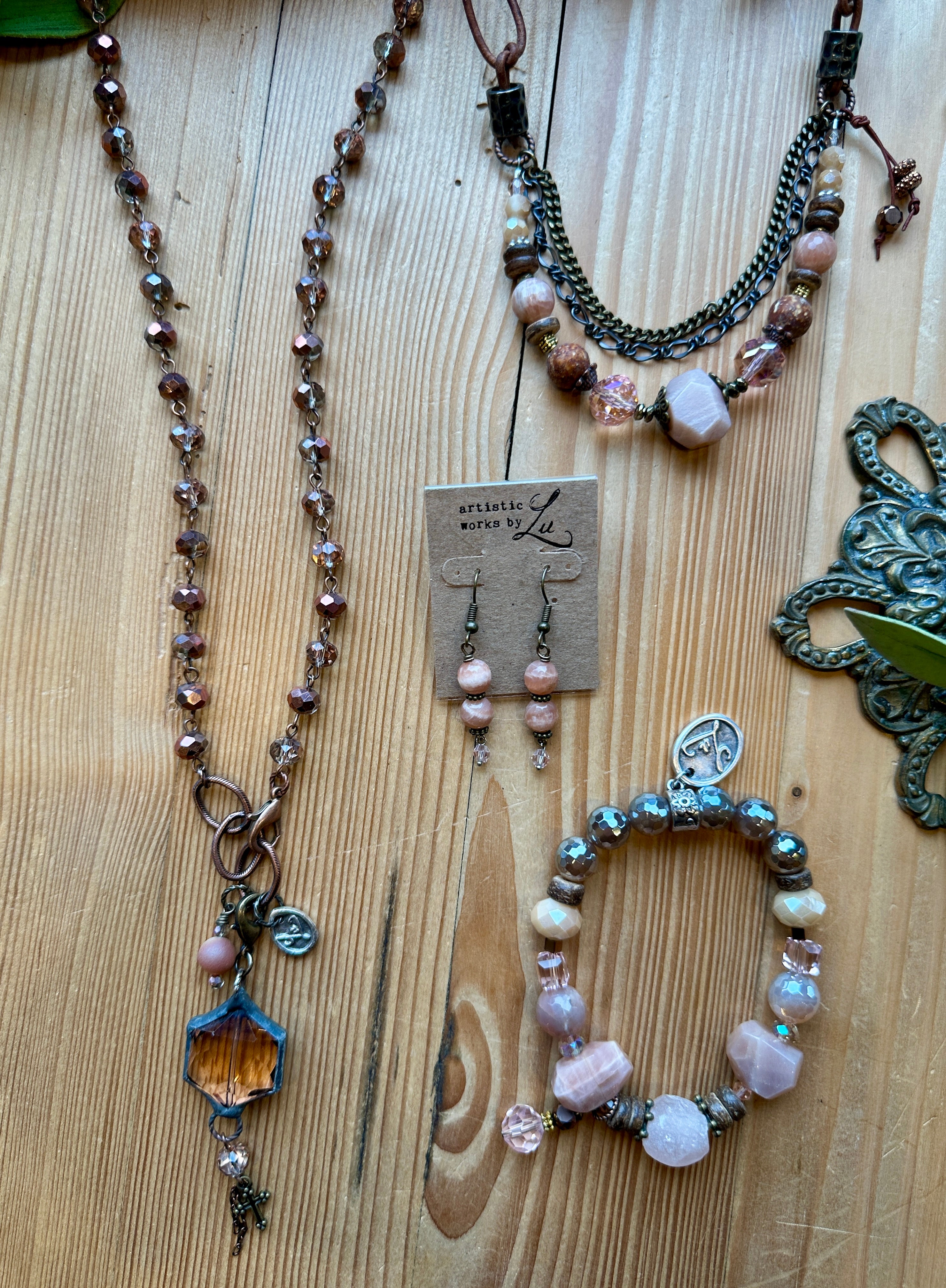 Features pink moonstone, pink sandstone, wood, and pink crystal beads